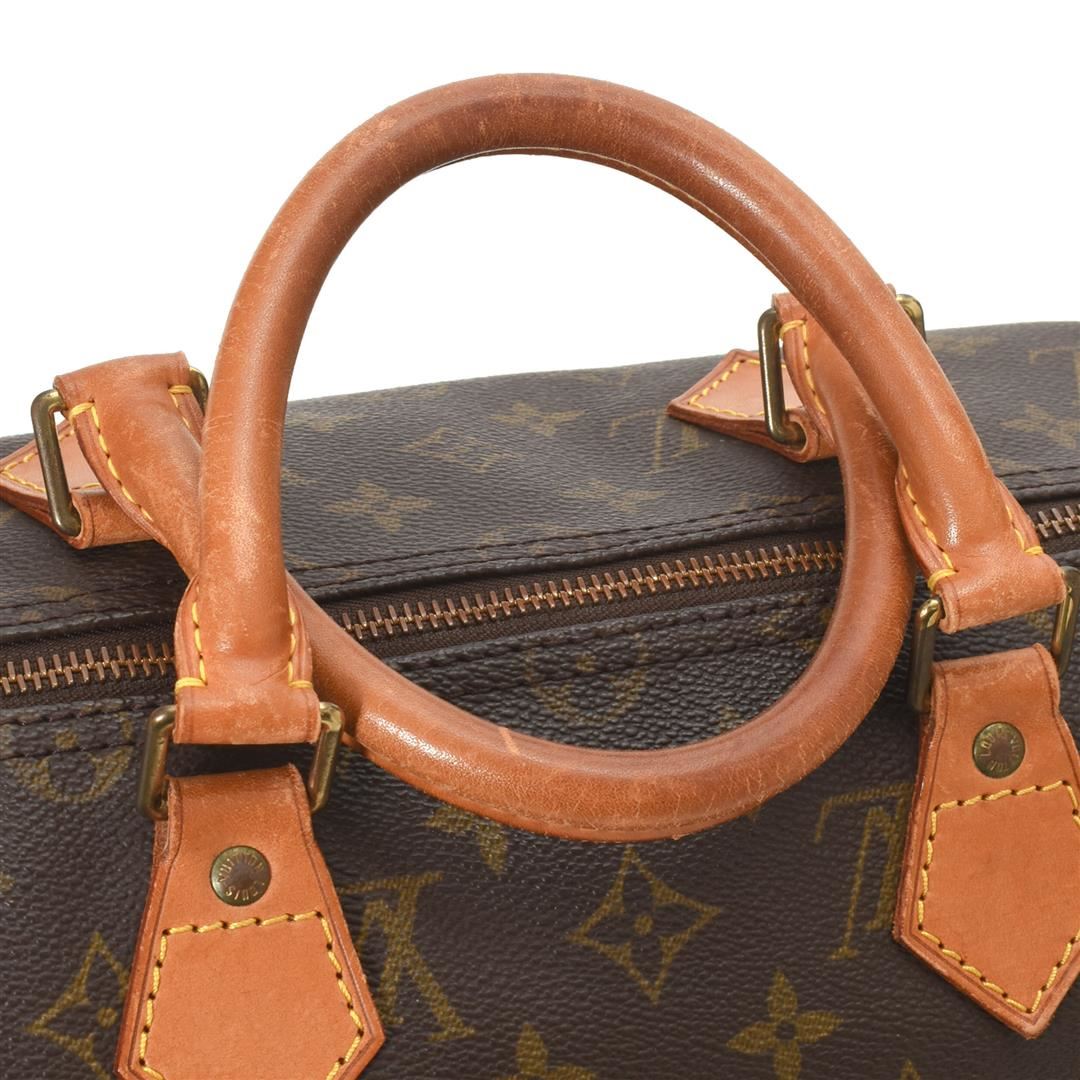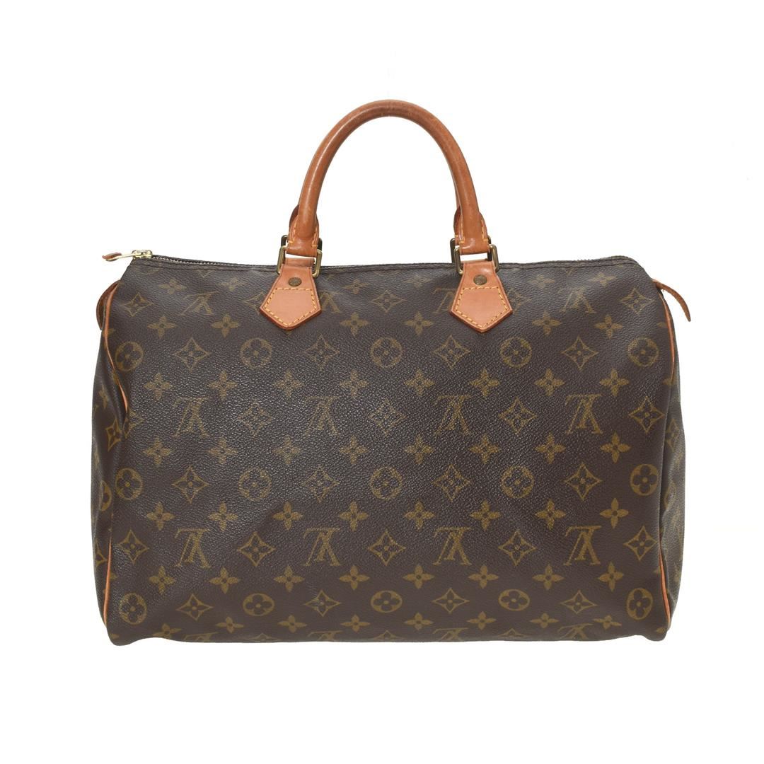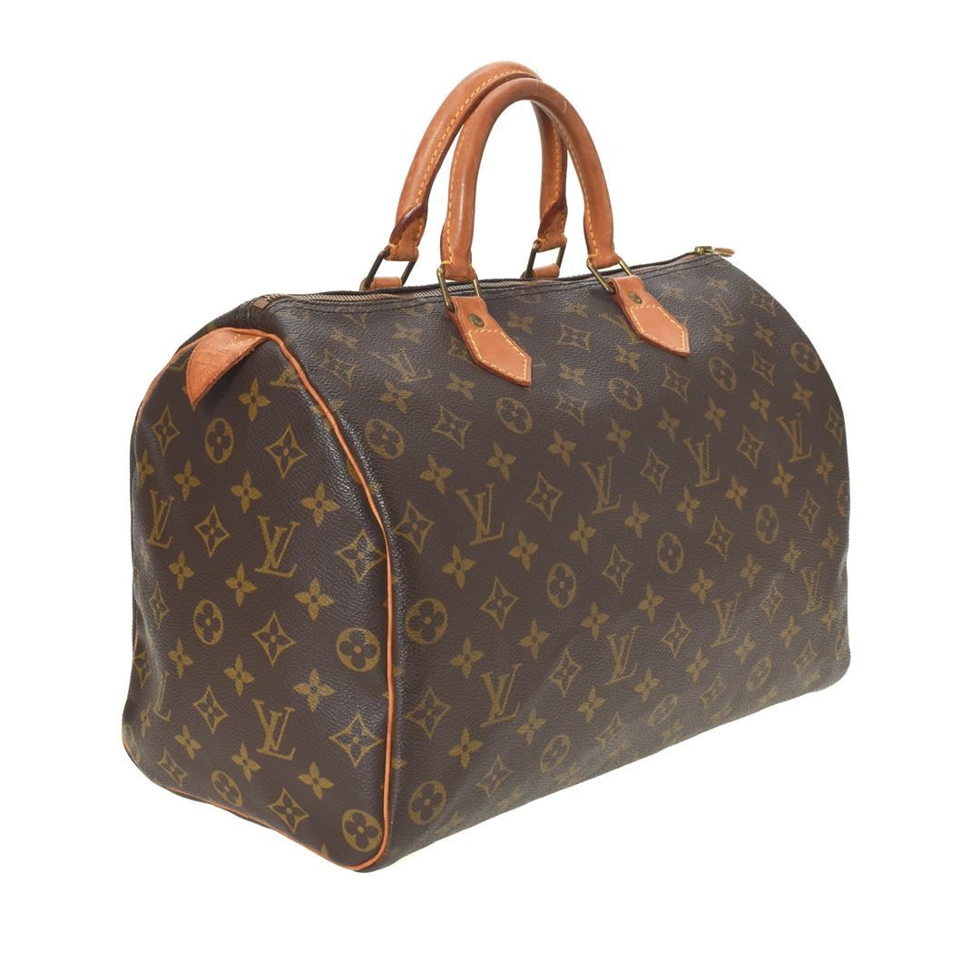 Brown and tan monogram coated canvas Louis Vuitton Speedy 35 with gold-tone hardware, tan Vachetta leather trim, dual rolled top handles, brown canvas lining, single slit pocket at interior wall and zip closure at top. 13.5"x7x11"xBag Drop:3.25"/34.2