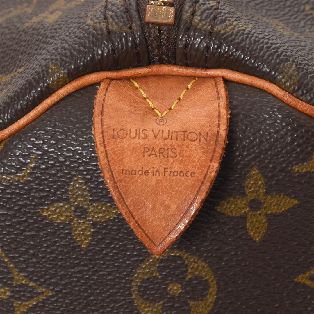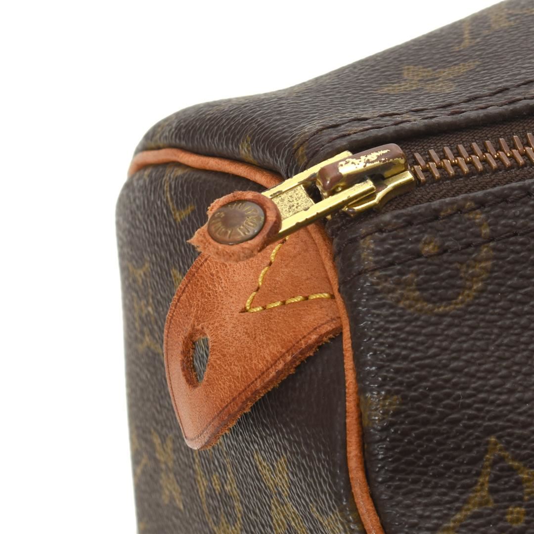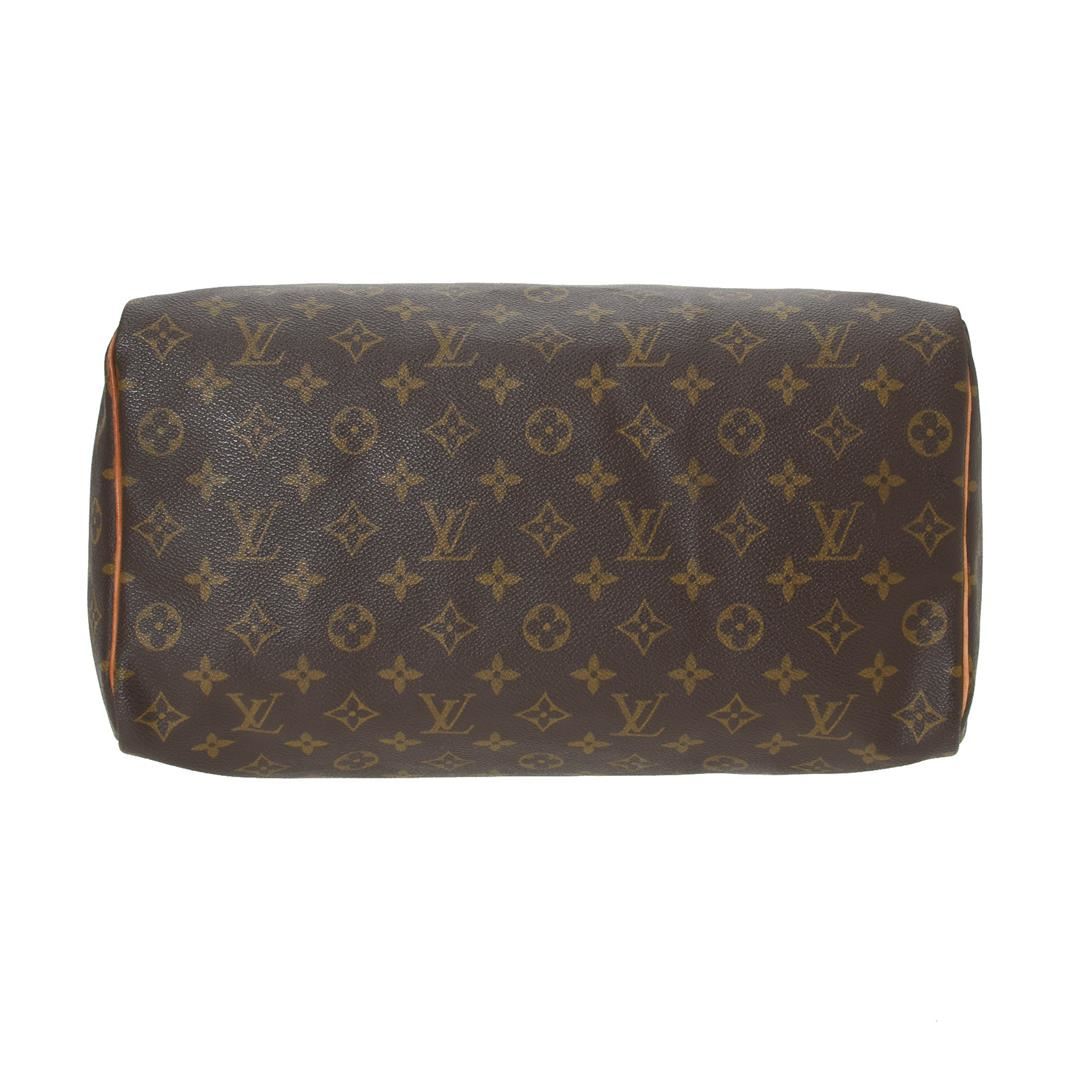 Brown and tan monogram coated canvas Louis Vuitton Speedy 35 with gold-tone hardware, tan Vachetta leather trim, dual rolled top handles, brown canvas lining, single slit pocket at interior wall and zip closure at top. 13.5"x7x11"xBag Drop:3.25"/34.2