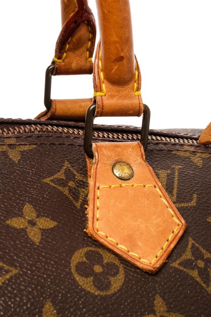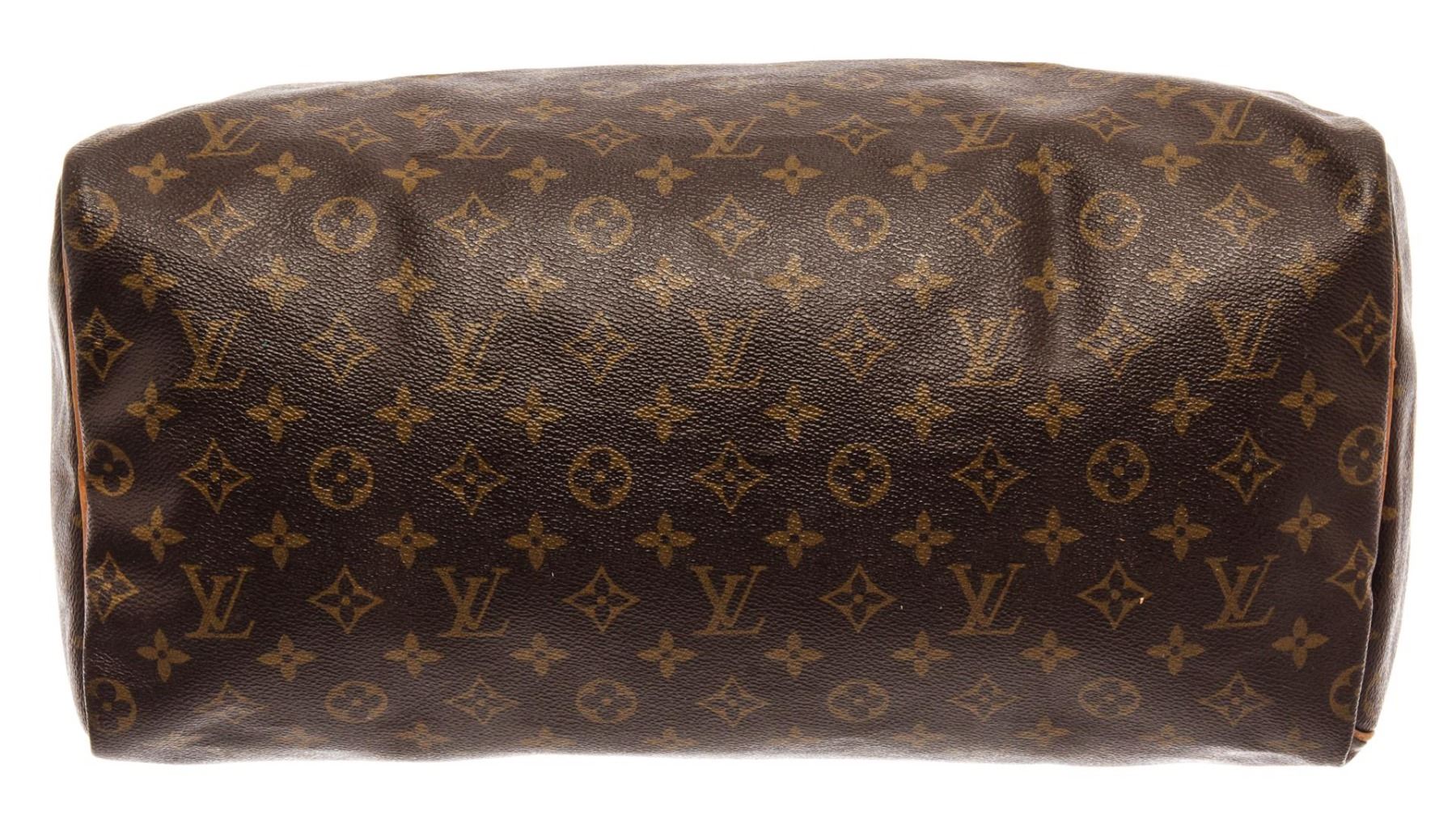 Louis Vuitton Brown Monogram Canvas Leather Speedy 40 Bag. All available information is listed in the description and shown in the photos. Louis Vuitton Brown Monogram Canvas Leather Speedy 40 Bag with gold-tone hardware, leather trim, rolled handles & dual shoulder straps, leather trim embellishment, canvas lining & single interior pocket, zip closure at top. Height: 10" Width: 15.75" Depth: 7.5", Handle Drop: 3.75", / 25.4 x 40.00 x 19.05 Cm