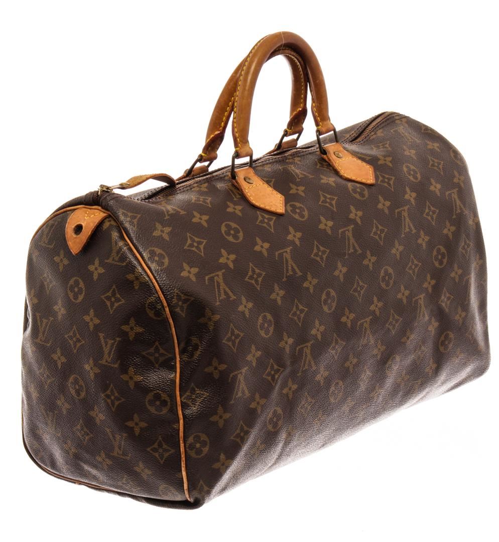 Louis Vuitton Brown Monogram Canvas Leather Speedy 40 Bag. All available information is listed in the description and shown in the photos. Louis Vuitton Brown Monogram Canvas Leather Speedy 40 Bag with gold-tone hardware, leather trim, rolled handles & dual shoulder straps, leather trim embellishment, canvas lining & single interior pocket, zip closure at top. Height: 10" Width: 15.75" Depth: 7.5", Handle Drop: 3.75", / 25.4 x 40.00 x 19.05 Cm
