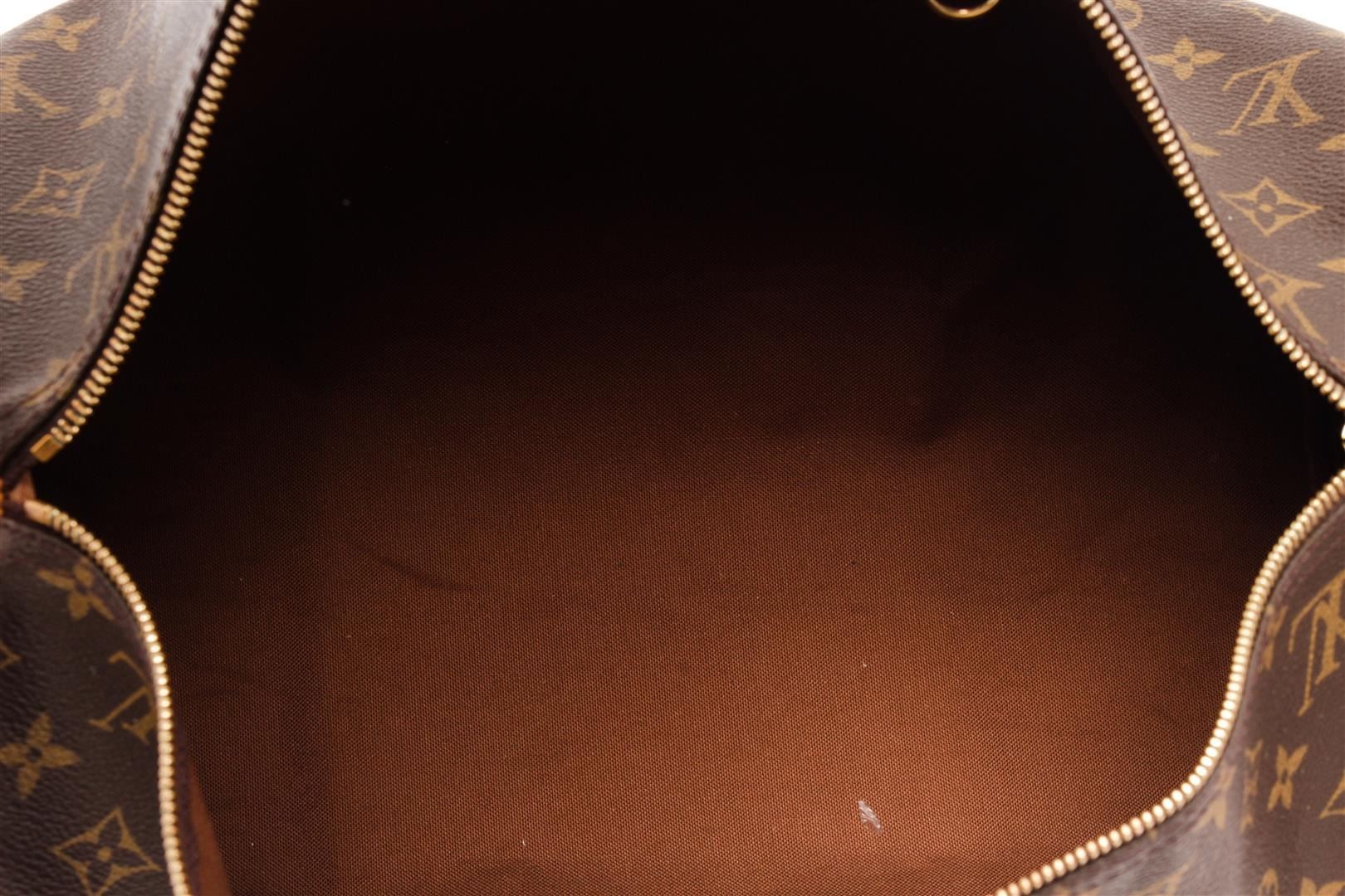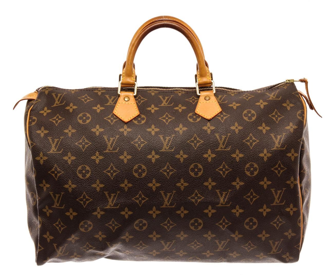 Louis Vuitton Brown Monogram Canvas Leather Speedy 40 Satchel Bag. All available information is listed in the description and shown in the photos. Louis Vuitton Brown Monogram Canvas Leather Speedy 40 Satchel Bag with brass hardware, leather trim, rolled handles & dual shoulder straps, leather trim embellishment, canvas lining & single interior pocket, zip closure at top. Height: 14" Width: 15" Depth: 8", Handle Drop: 4" / 35.56 x 38.1 x 20.32 Cm