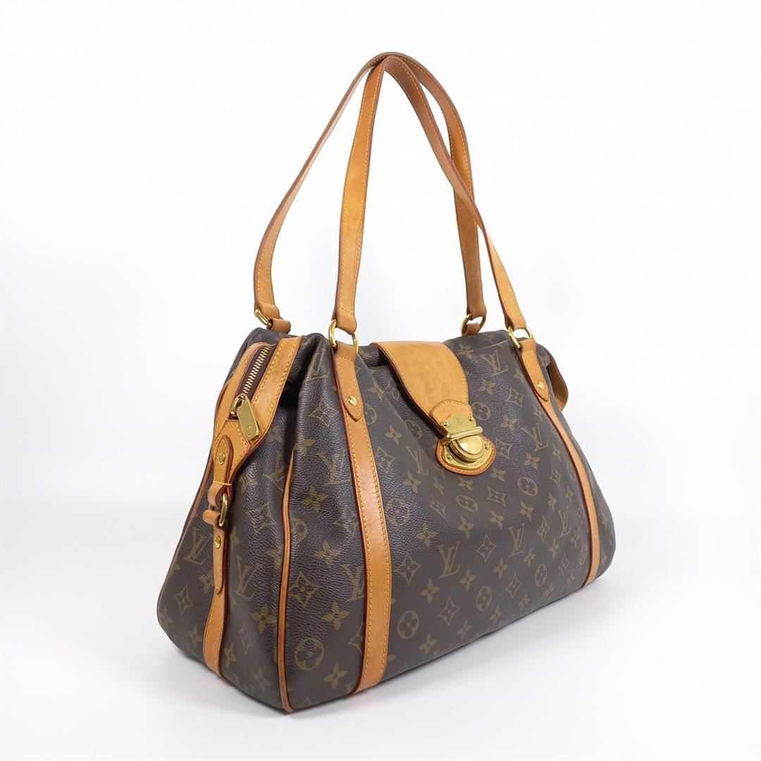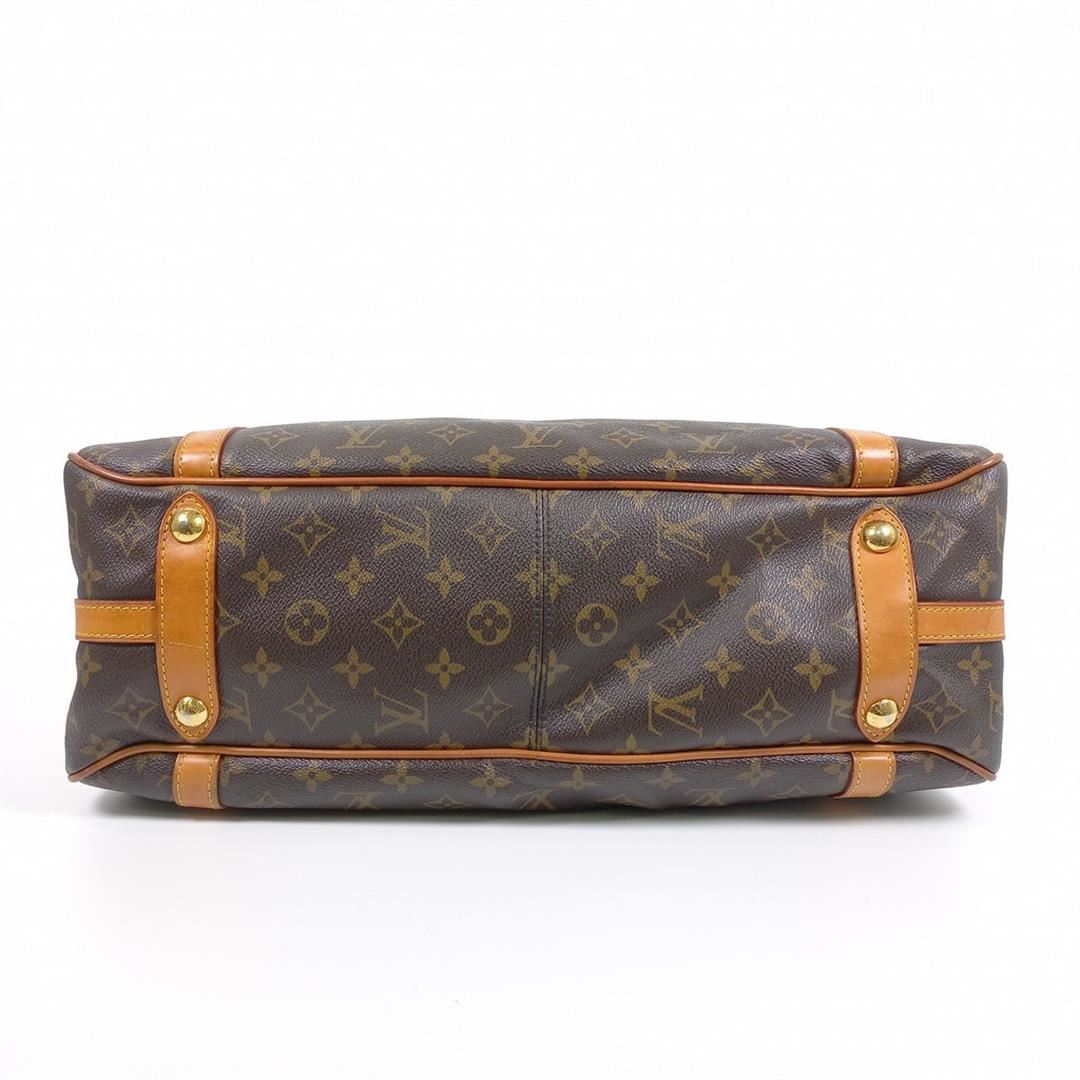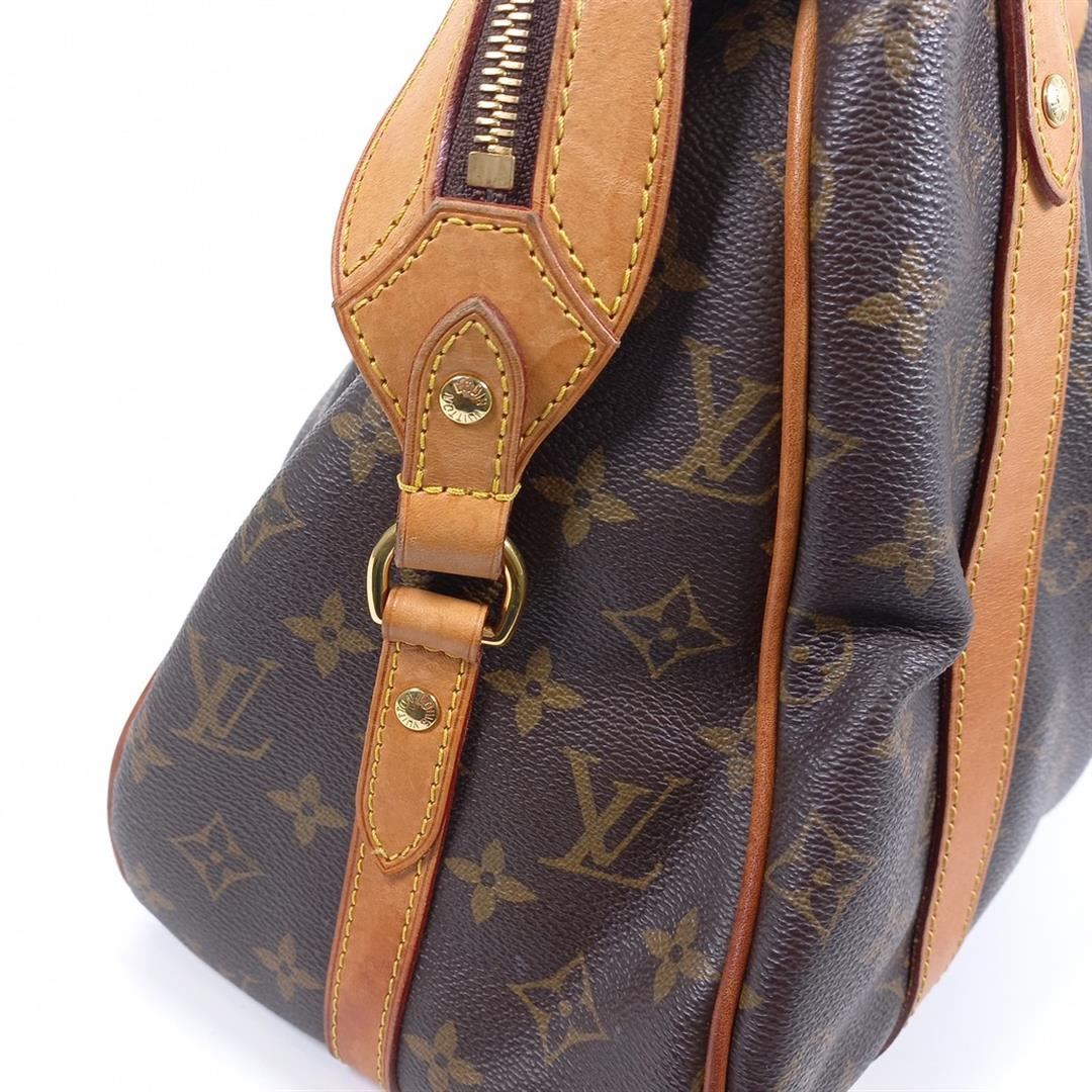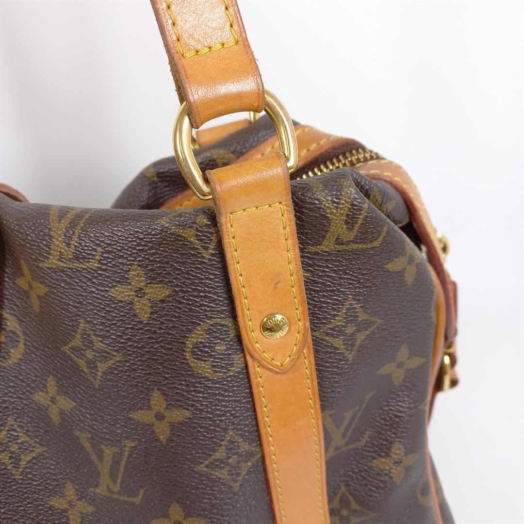 Brown and tan monogram coated canvas Louis Vuitton Stresa PM with gold-tone hardware, tan vachetta leather trim, dual flat shoulder straps, brown canvas lining, dual interior slit pockets and zip closure at top featuring additional push-lock closure at fr