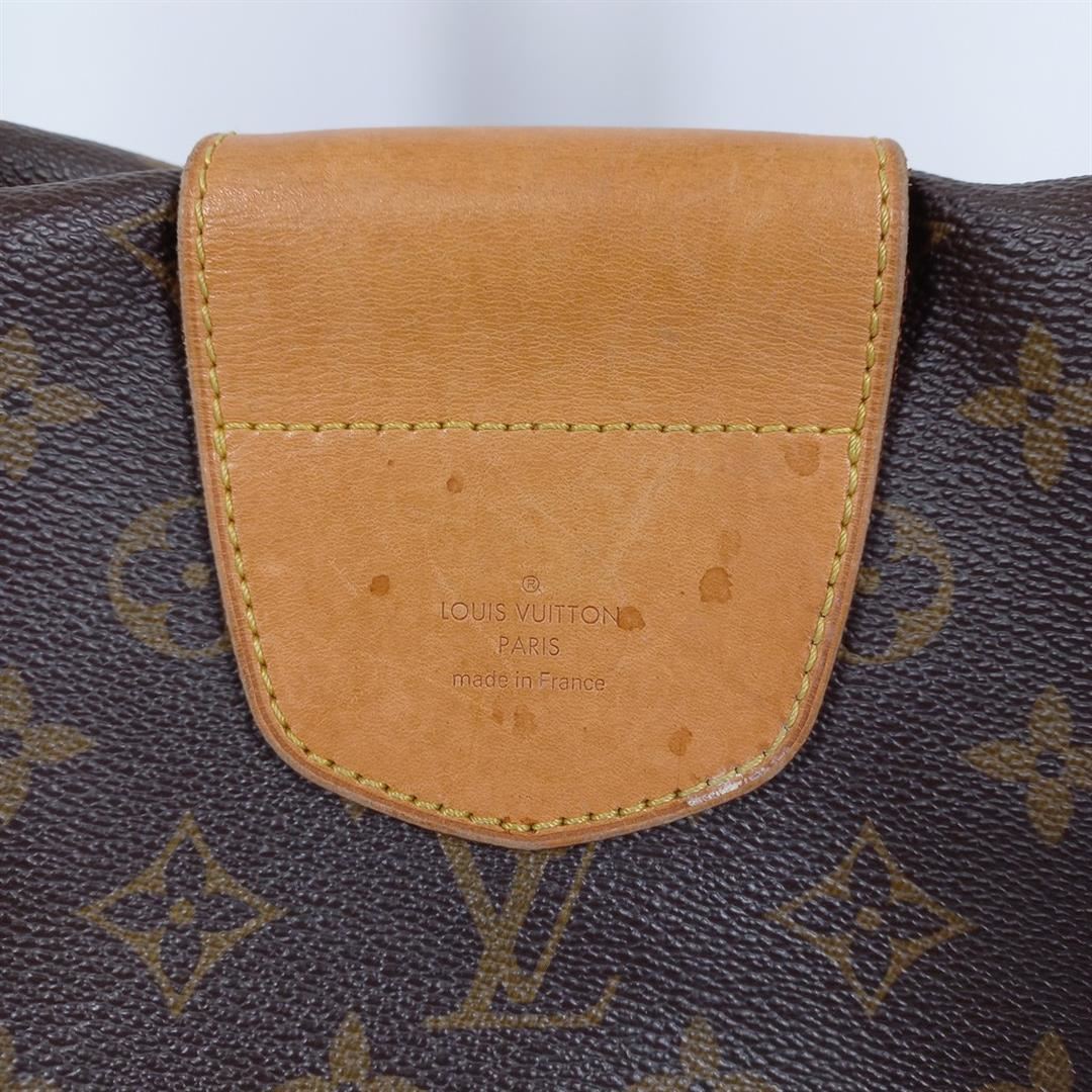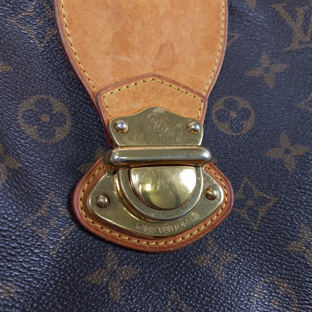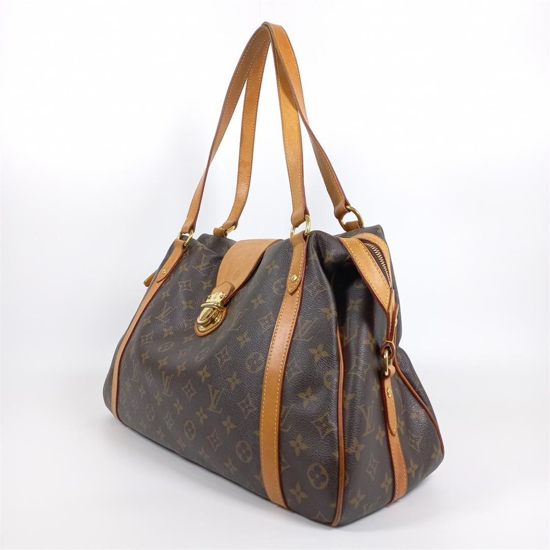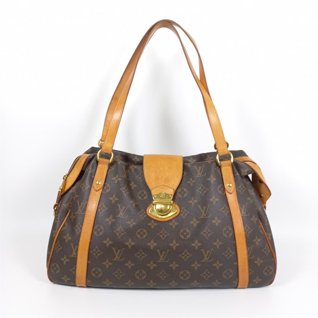 Brown and tan monogram coated canvas Louis Vuitton Stresa PM with gold-tone hardware, tan vachetta leather trim, dual flat shoulder straps, brown canvas lining, dual interior slit pockets and zip closure at top featuring additional push-lock closure at fr