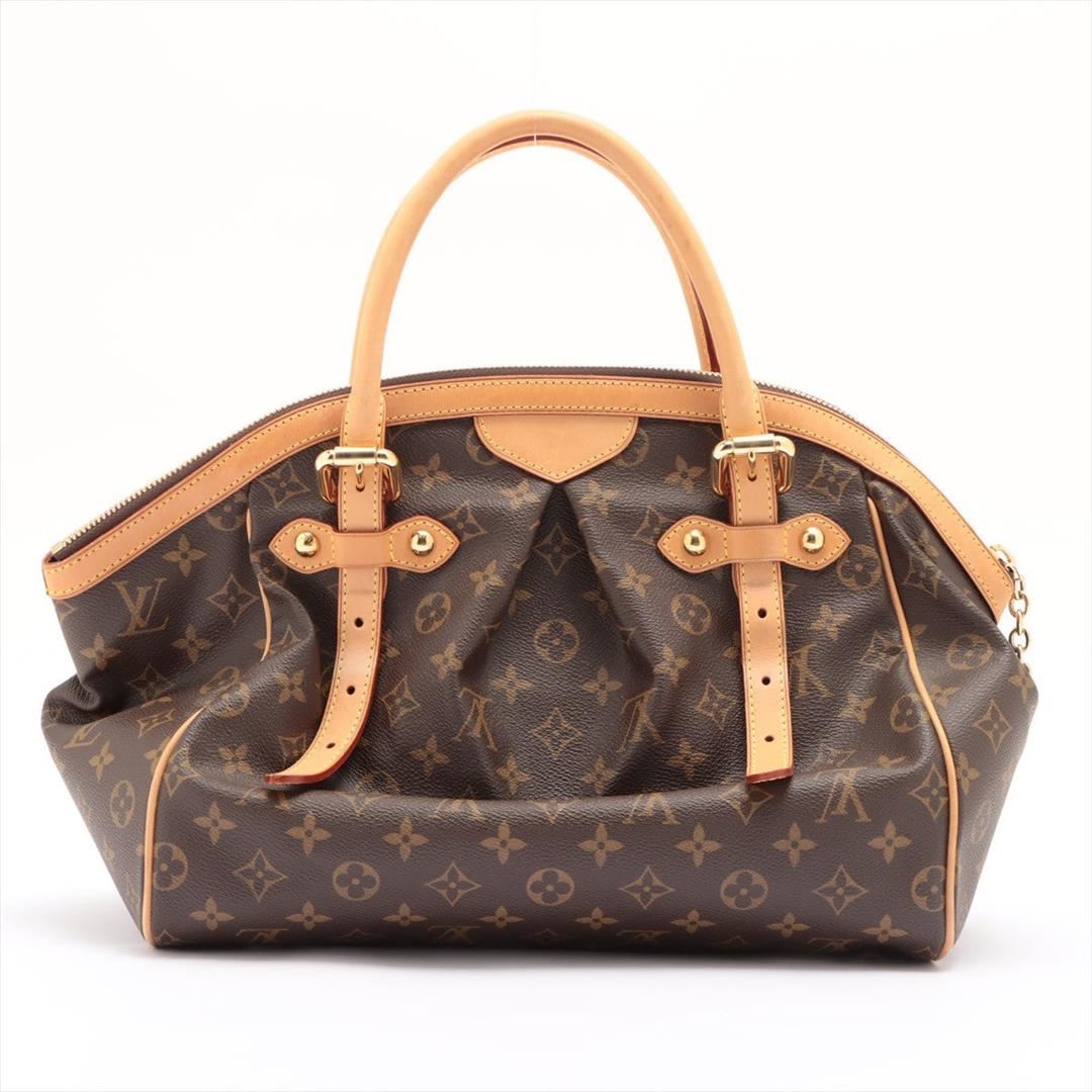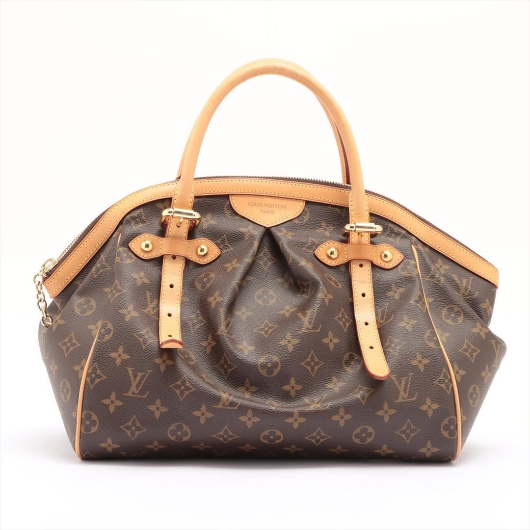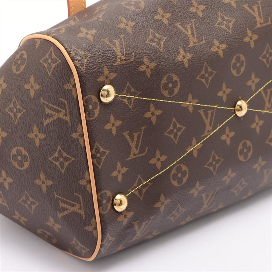 Brown and tan monogram coated canvas Louis Vuitton Tivoli GM with gold-tone hardware, tan Vachetta leather trim, dual rolled top handles, brown woven lining, dual pockets at interior wall and zip closure at top. 14.5"x5.5"x7" SD:5.5" / 37cmx14cmx18cm S