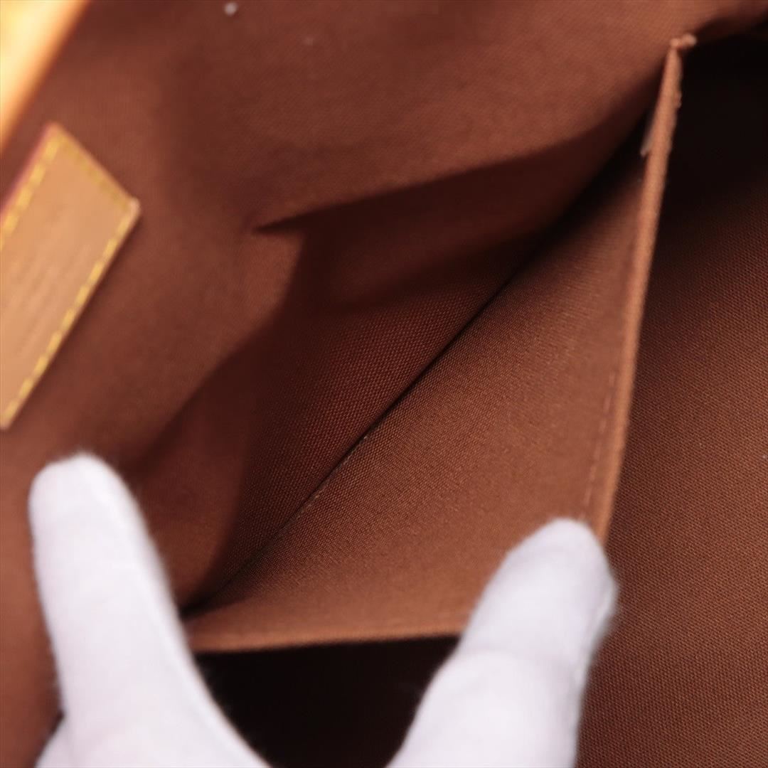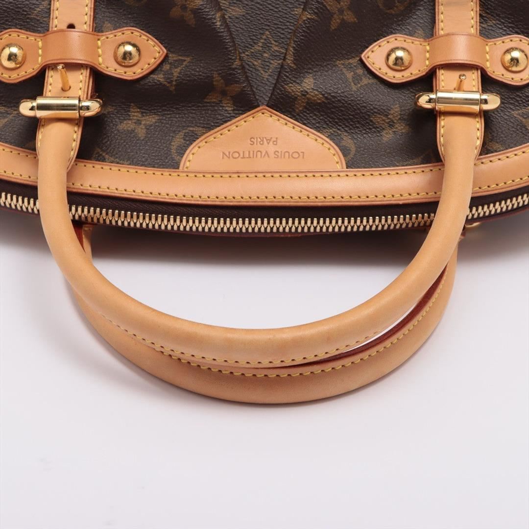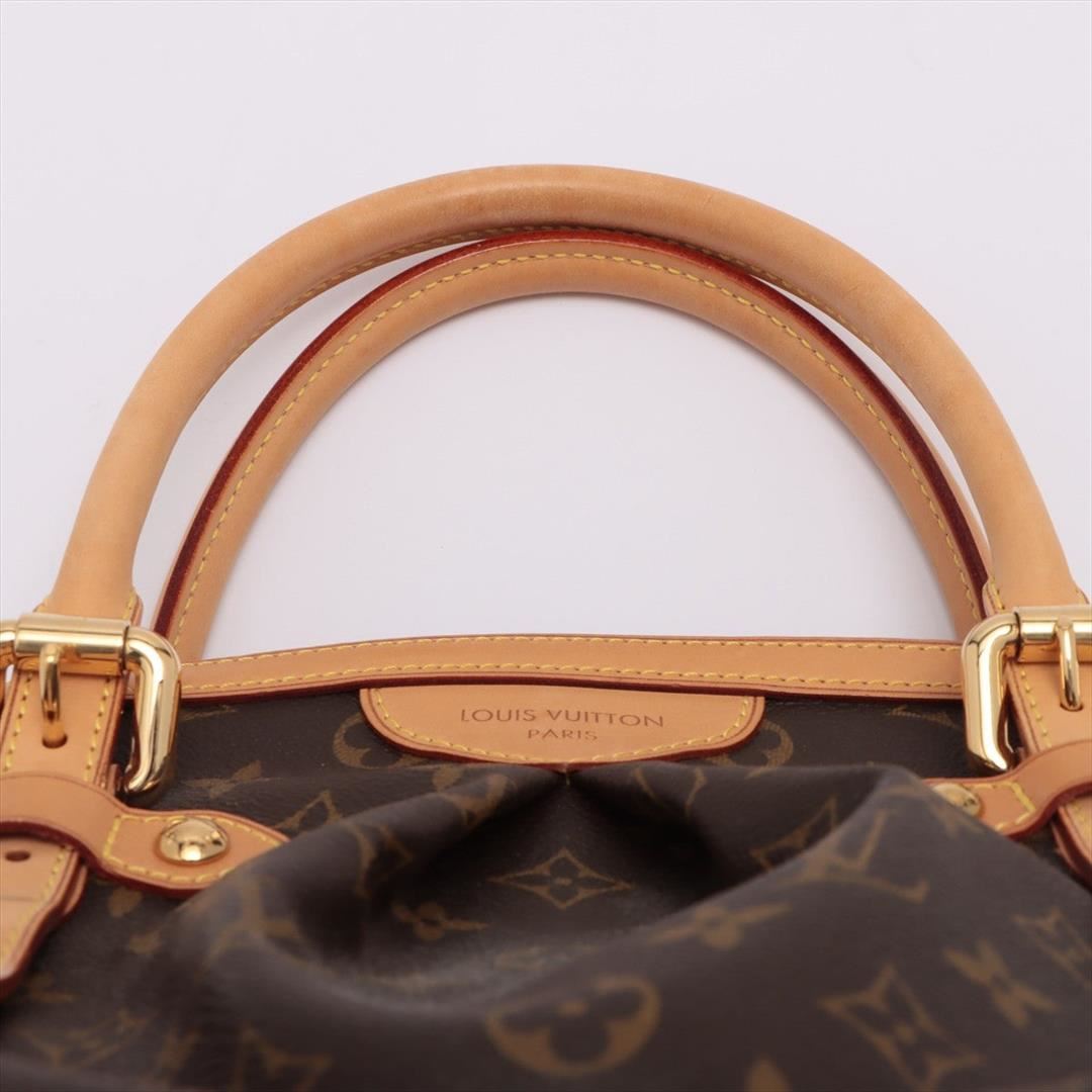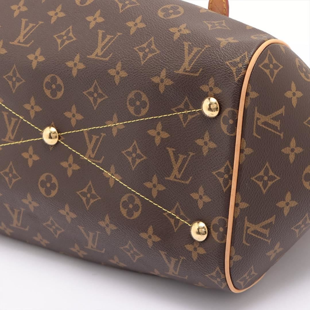 Brown and tan monogram coated canvas Louis Vuitton Tivoli GM with gold-tone hardware, tan Vachetta leather trim, dual rolled top handles, brown woven lining, dual pockets at interior wall and zip closure at top. 14.5"x5.5"x7" SD:5.5" / 37cmx14cmx18cm S