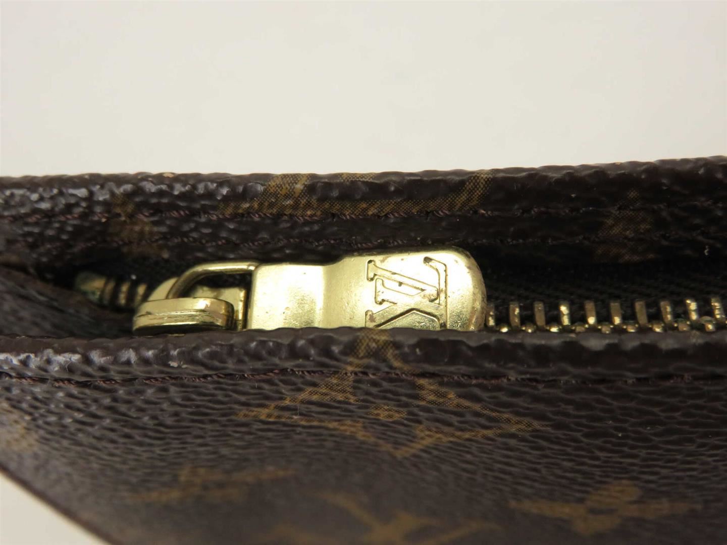 Brown and tan monogram coated canvas Louis Vuitton Toiletry Pouch 15 cm with gold-tone hardware, tan vachetta leather trim, creme leather lining and zip closure at top. 6iHeight 4.75" Width: 6" Depth: 1.25"