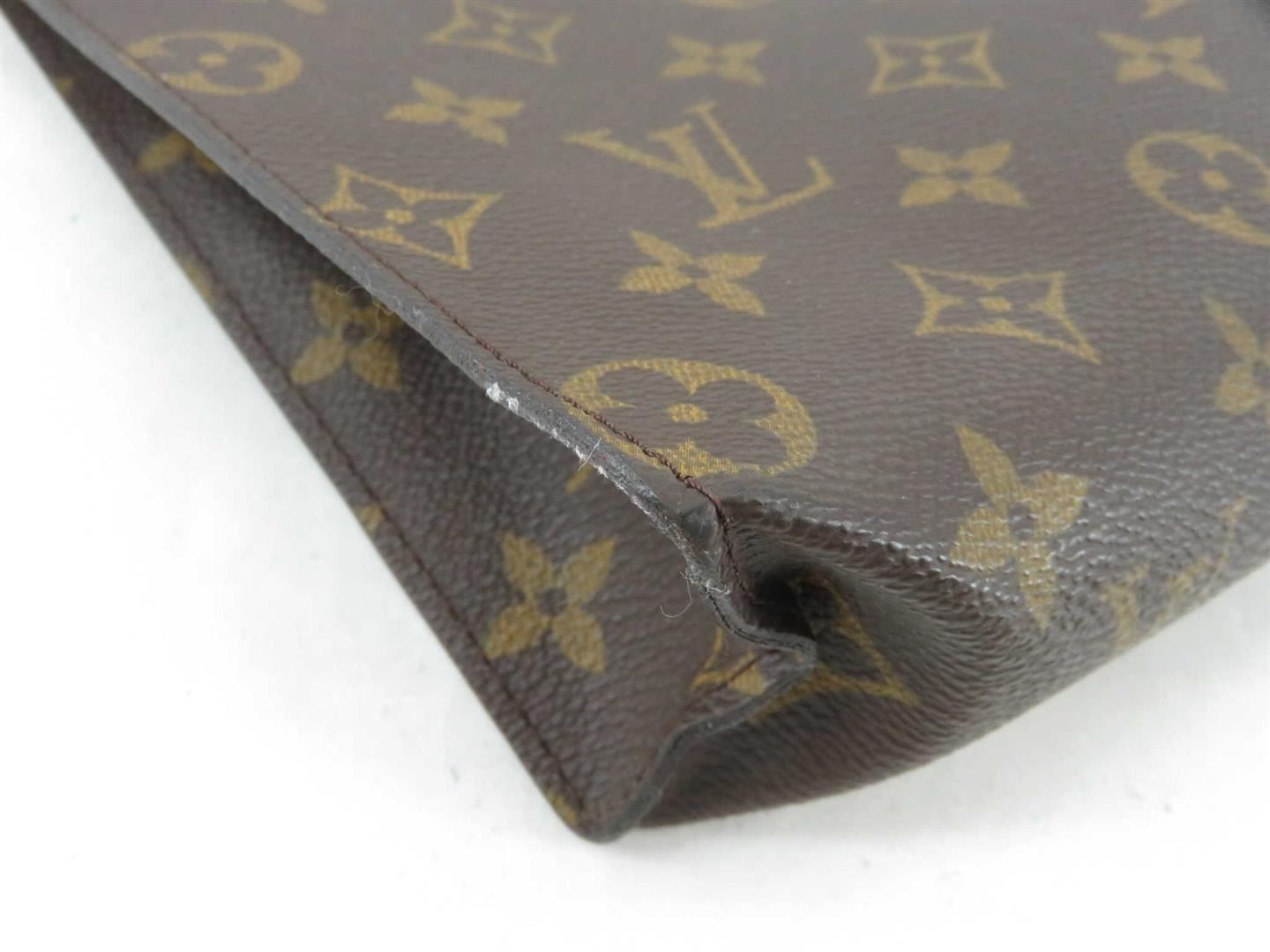 Brown and tan monogram coated canvas Louis Vuitton Toiletry Pouch 26 with gold-tone hardware, brown Vachetta leather trim, brown coated canvas lining and zip closure at top. 10"x2"x8"/25.4cmx5cmx20.3cm