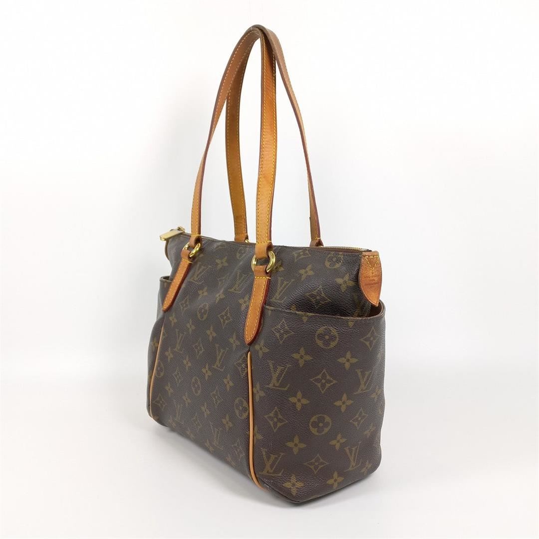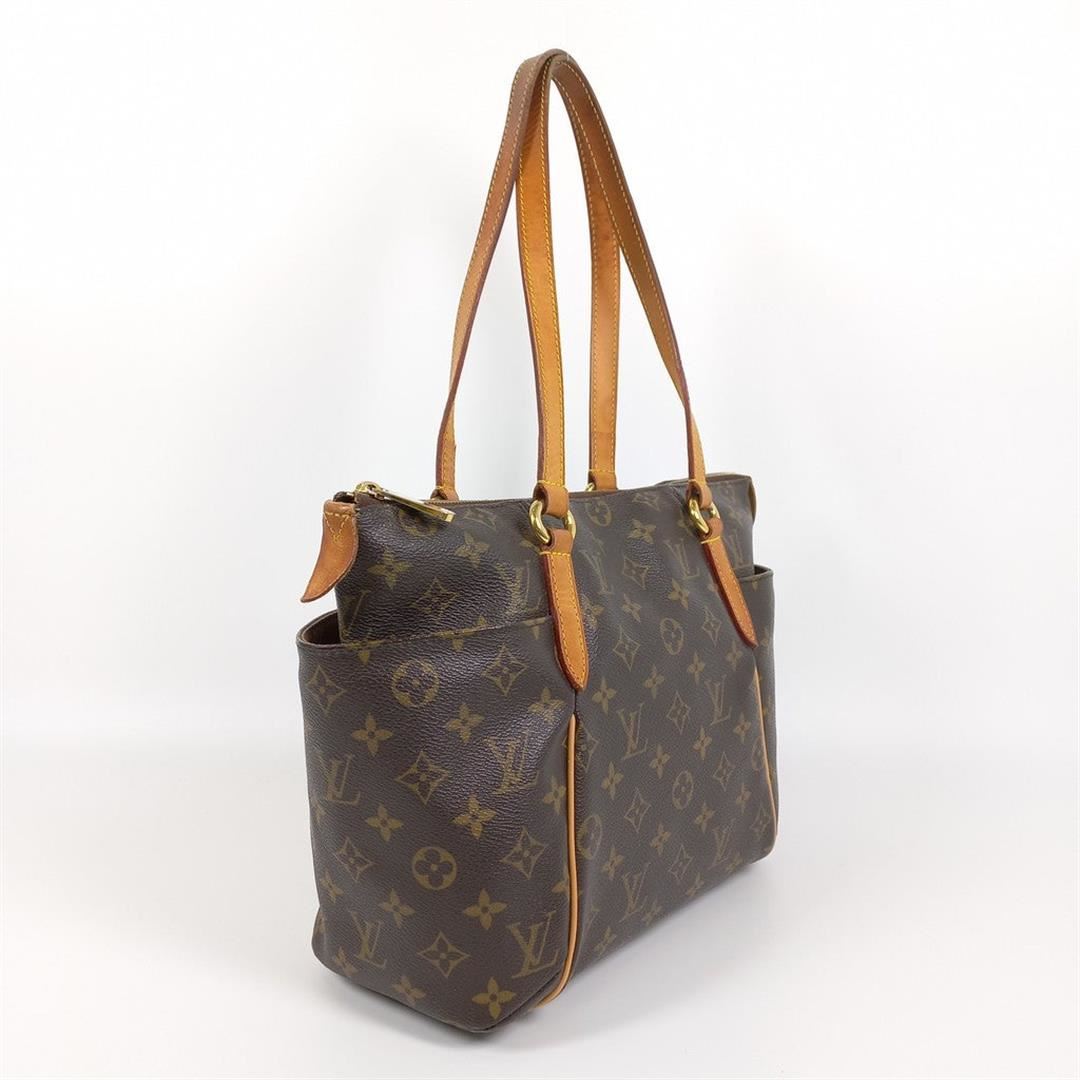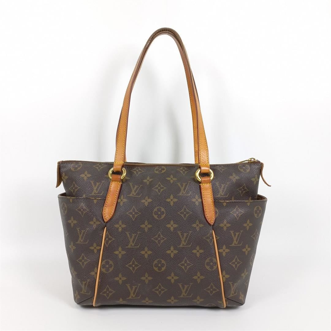 Brown and tan monogram coated canvas Louis Vuitton Totally PM with gold-tone hardware, tan vachetta leather trim, dual flat shoulder straps, dual exterior slip pockets at sides, brown woven canvas lining, three slip pockets at interior walls and zip closu