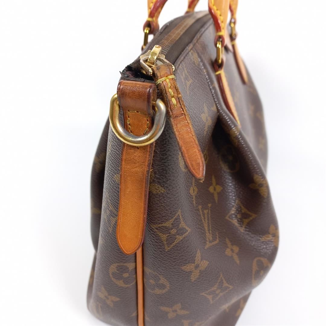 Brown and tan monogram coated canvas Louis Vuitton Turenne PM bag with gold-tone hardware, tan leather trim, dual rolled handles & single optional adjustable shoulder strap, brown canvas lining & three interior pockets and zip closure at top. Height: