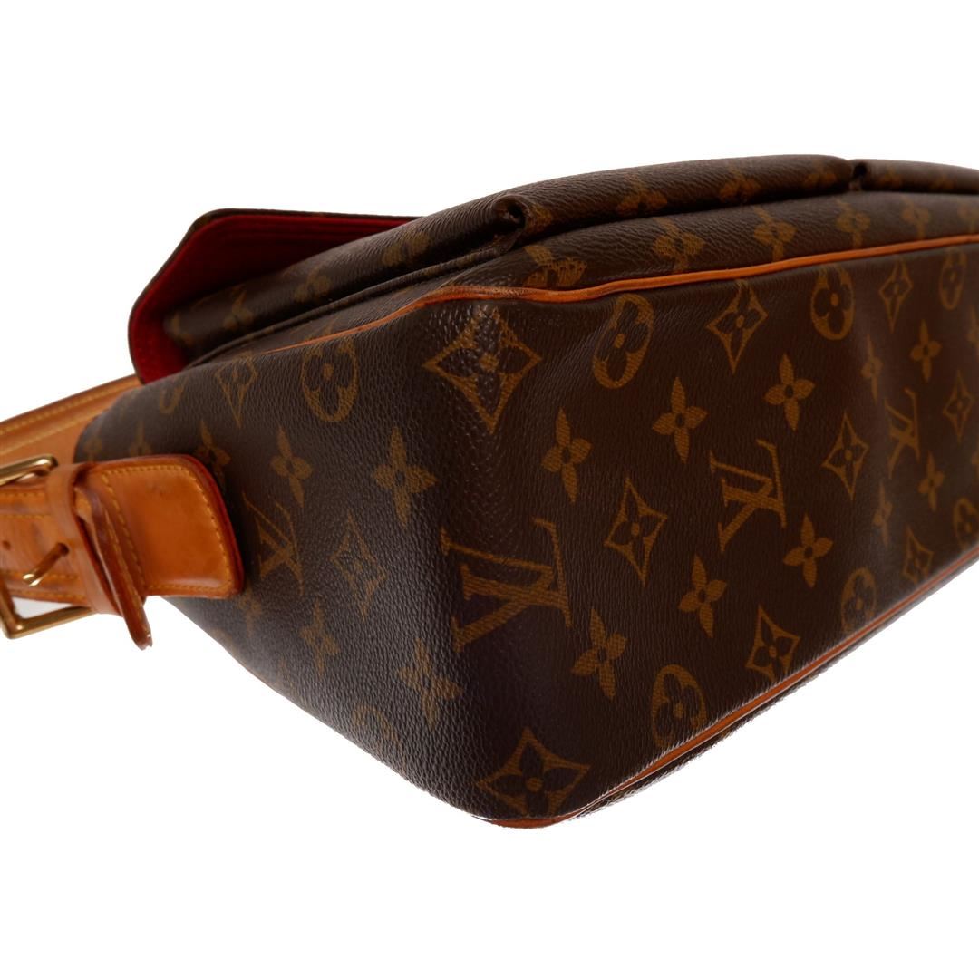 Brown and tan monogram coated canvas Louis Vuitton Viva Cite GM with gold-tone hardware, tan vachetta leather trim, flat shoulder strap, dual exterior pockets with snap closures, crimson Alcantara lining, dual slit pockets at interior walls and zip closur