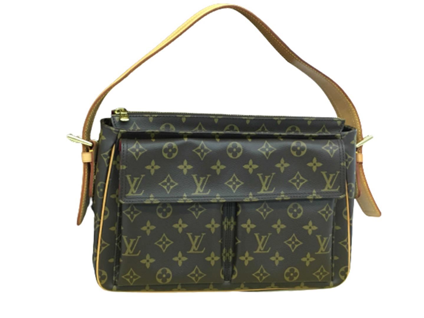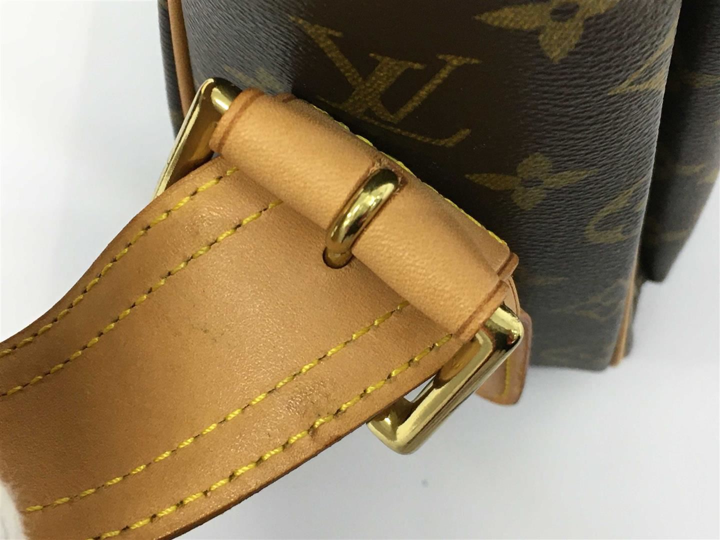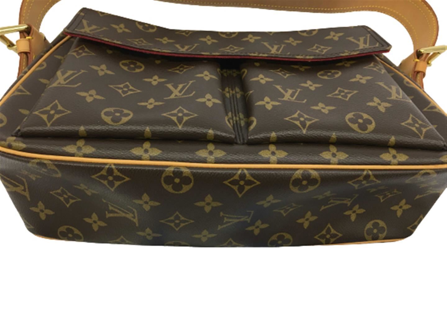 Brown and tan monogram coated canvas Louis Vuitton Viva Cite GM with gold-tone hardware, tan vachetta leather trim, flat shoulder strap, dual exterior pockets with snap closures, crimson Alcantara lining, dual slit pockets at interior walls and zip closur