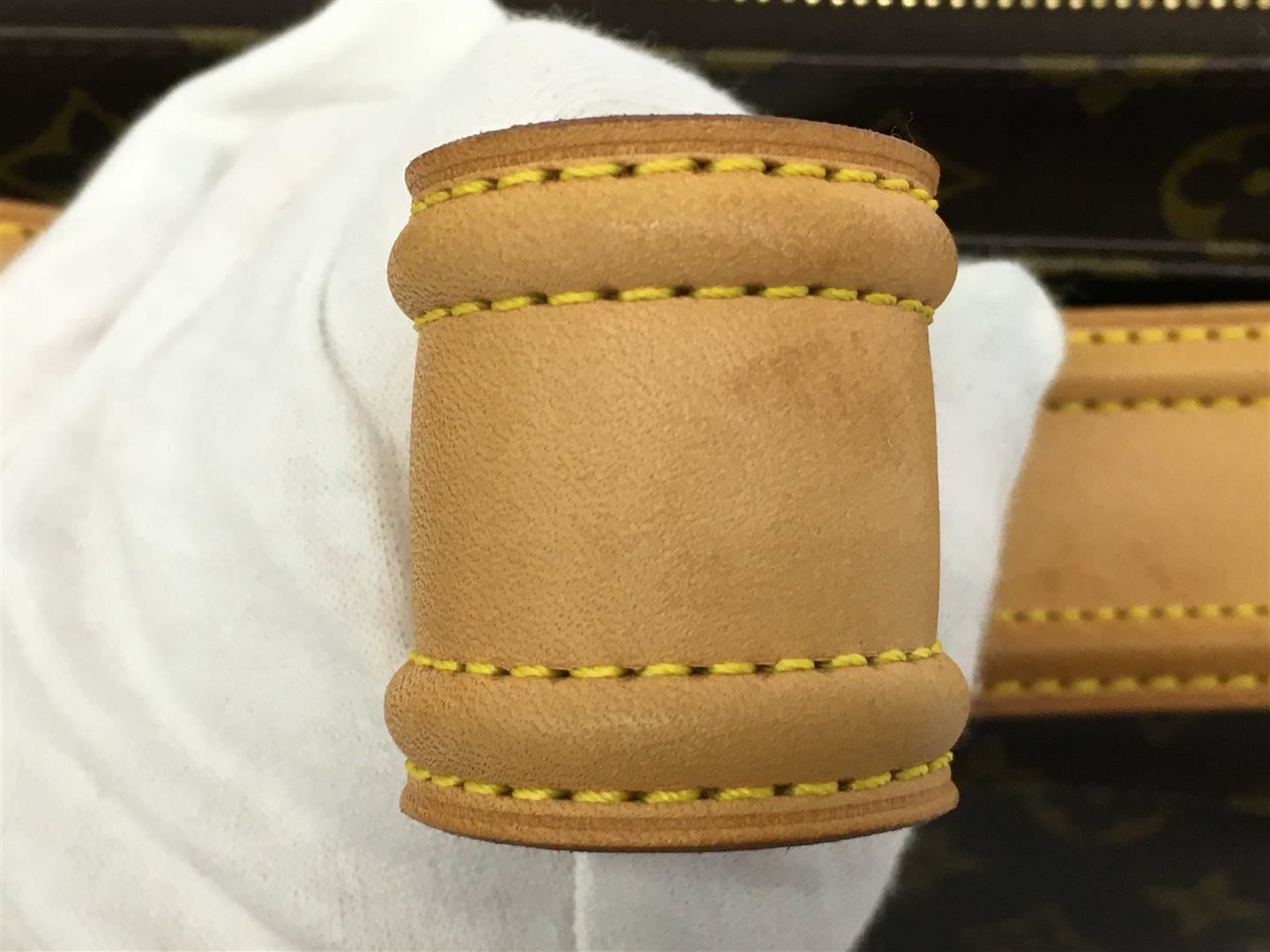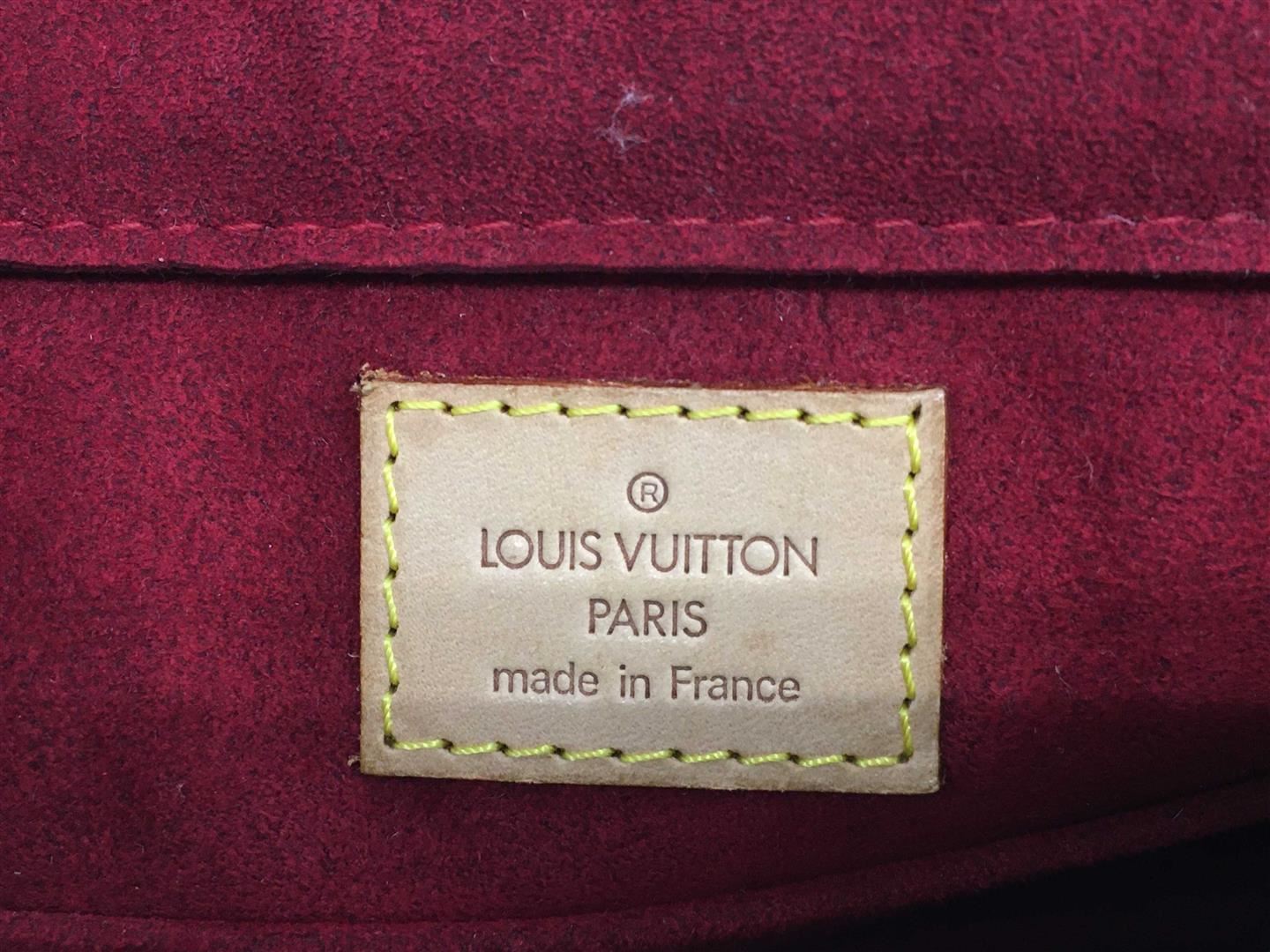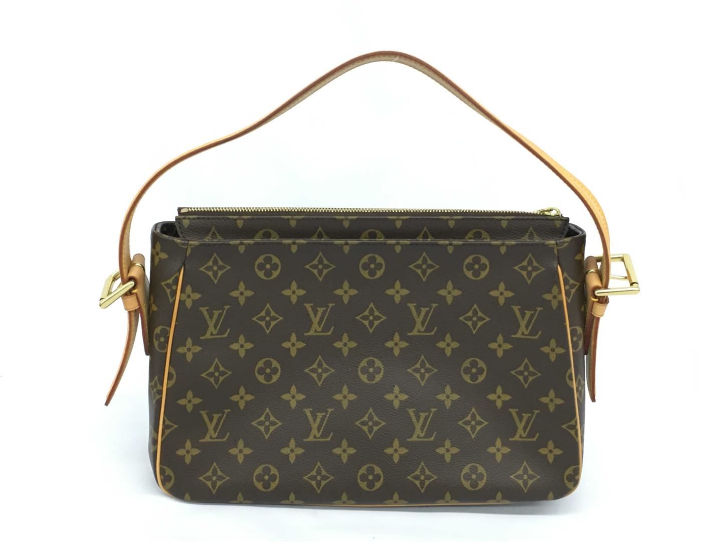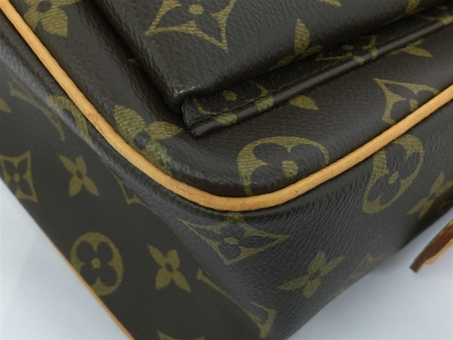 Brown and tan monogram coated canvas Louis Vuitton Viva Cite GM with gold-tone hardware, tan vachetta leather trim, flat shoulder strap, dual exterior pockets with snap closures, crimson Alcantara lining, dual slit pockets at interior walls and zip closur