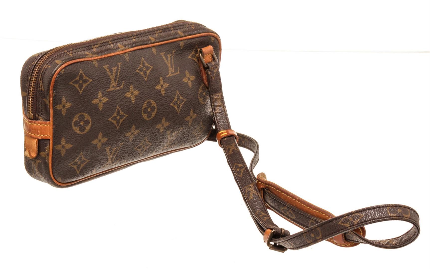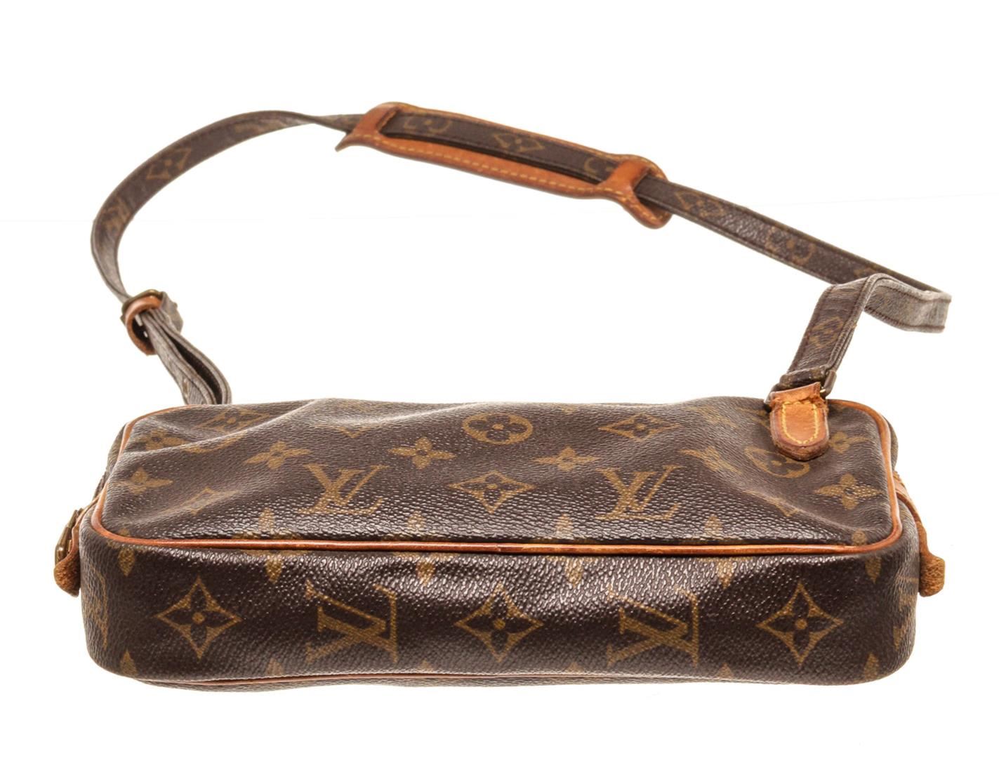 Louis Vuitton Brown Monogram Canvas Marly Bandouliere Crossbody Bag. All available information is listed in the description and shown in the photos. Louis Vuitton Brown Monogram Canvas Marly Bandouliere Crossbody Bag with material monogram canvas, Gold-tone hardware, Tan Vachetta leather trim, canvas lining, adjustable shoulder strap, and zip closure.
