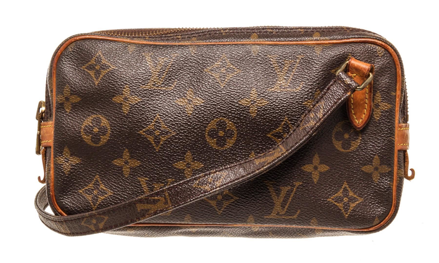 Louis Vuitton Brown Monogram Canvas Marly Bandouliere Crossbody Bag. All available information is listed in the description and shown in the photos. Louis Vuitton Brown Monogram Canvas Marly Bandouliere Crossbody Bag with material monogram canvas, Gold-tone hardware, Tan Vachetta leather trim, canvas lining, adjustable shoulder strap, and zip closure.