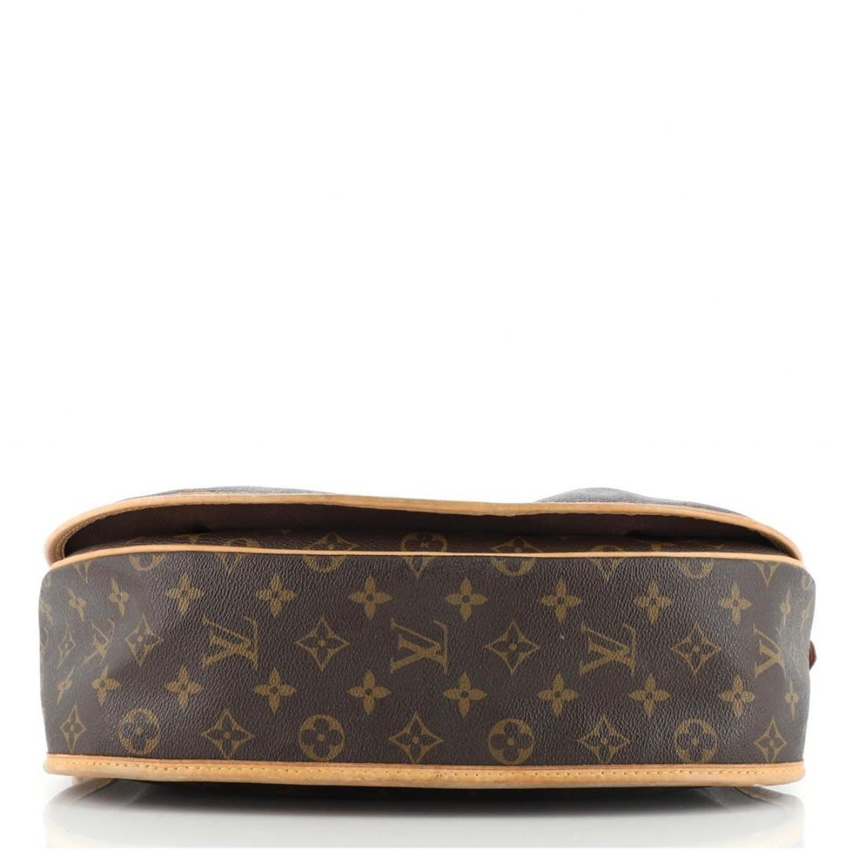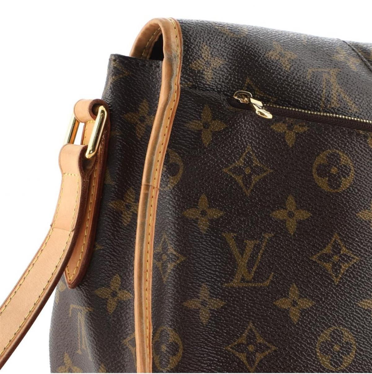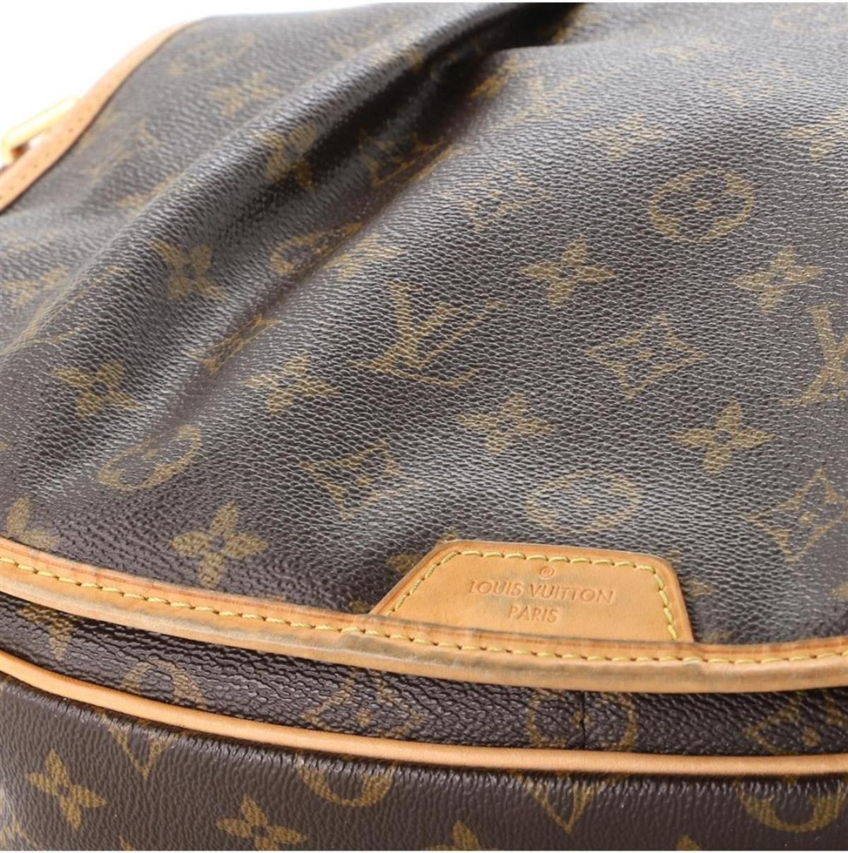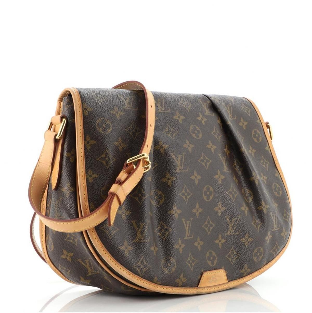 Brown and tan monogram coated canvas Louis Vuitton Menilmontant with leather trim shoulder bag with gold-tone hardware featuring two flat pockets under the flap, one large zip pocket and flat leather handles with hidden magnetic snap closure.