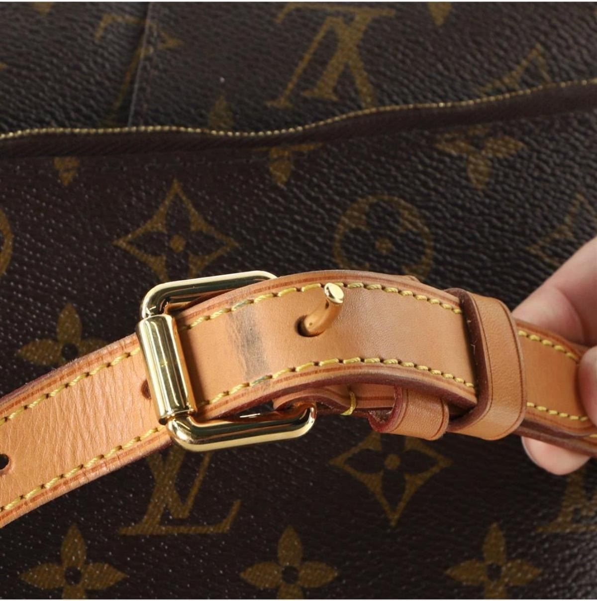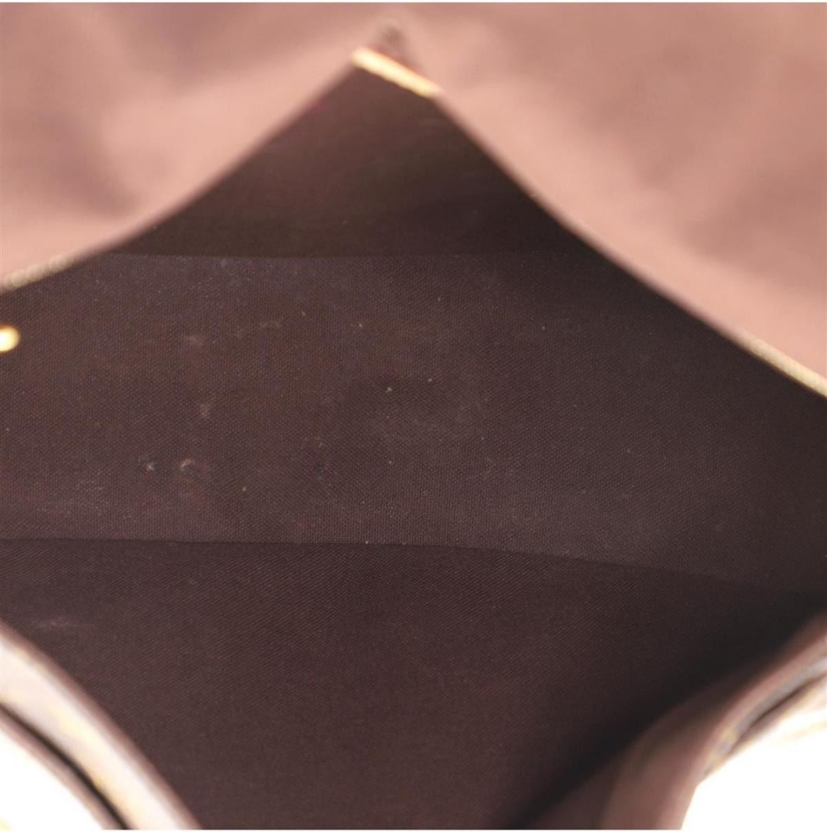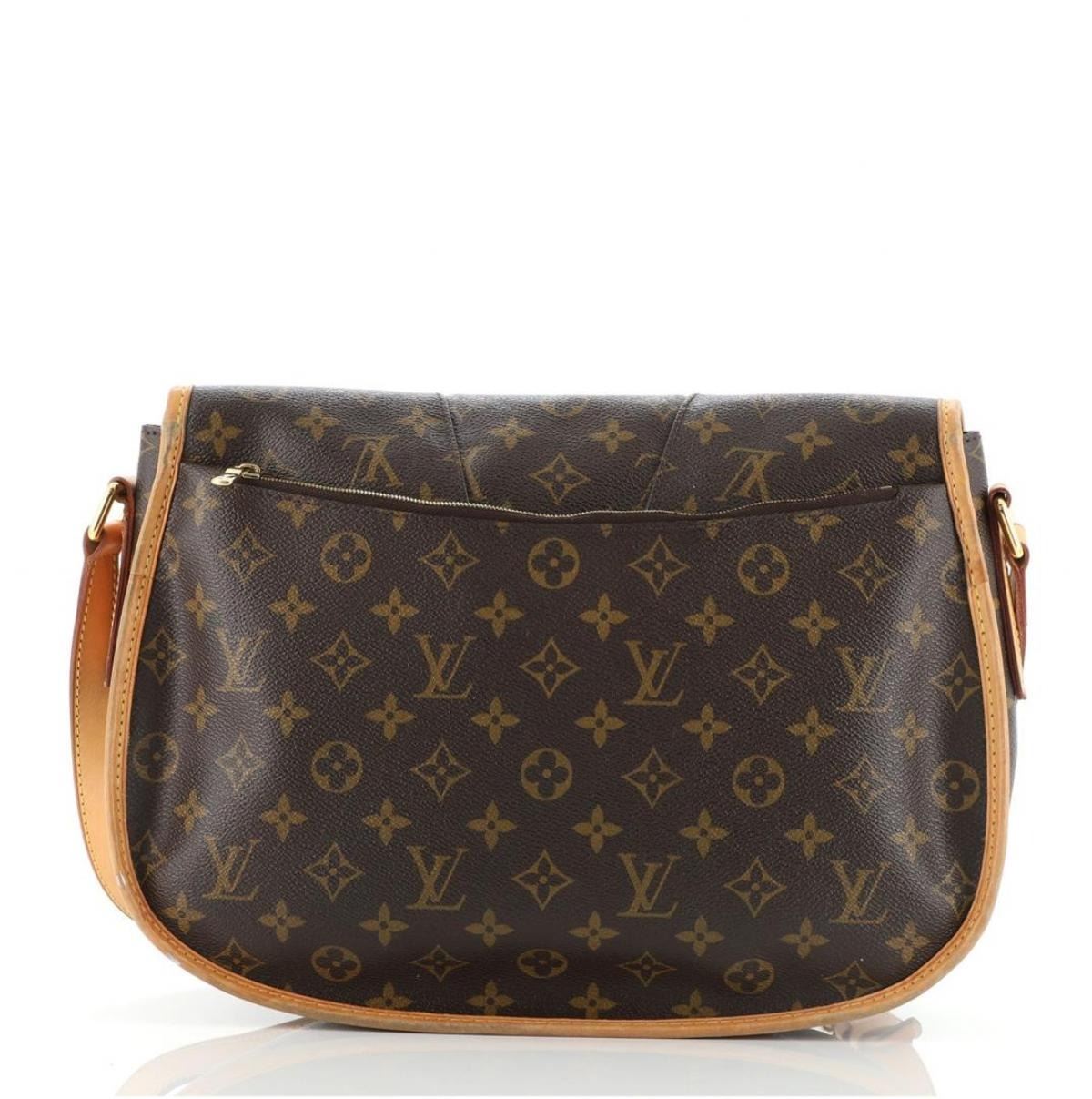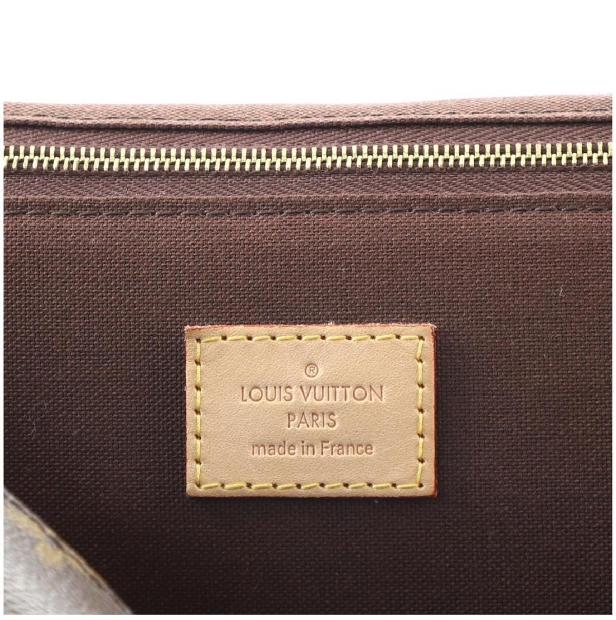 Brown and tan monogram coated canvas Louis Vuitton Menilmontant with leather trim shoulder bag with gold-tone hardware featuring two flat pockets under the flap, one large zip pocket and flat leather handles with hidden magnetic snap closure.
