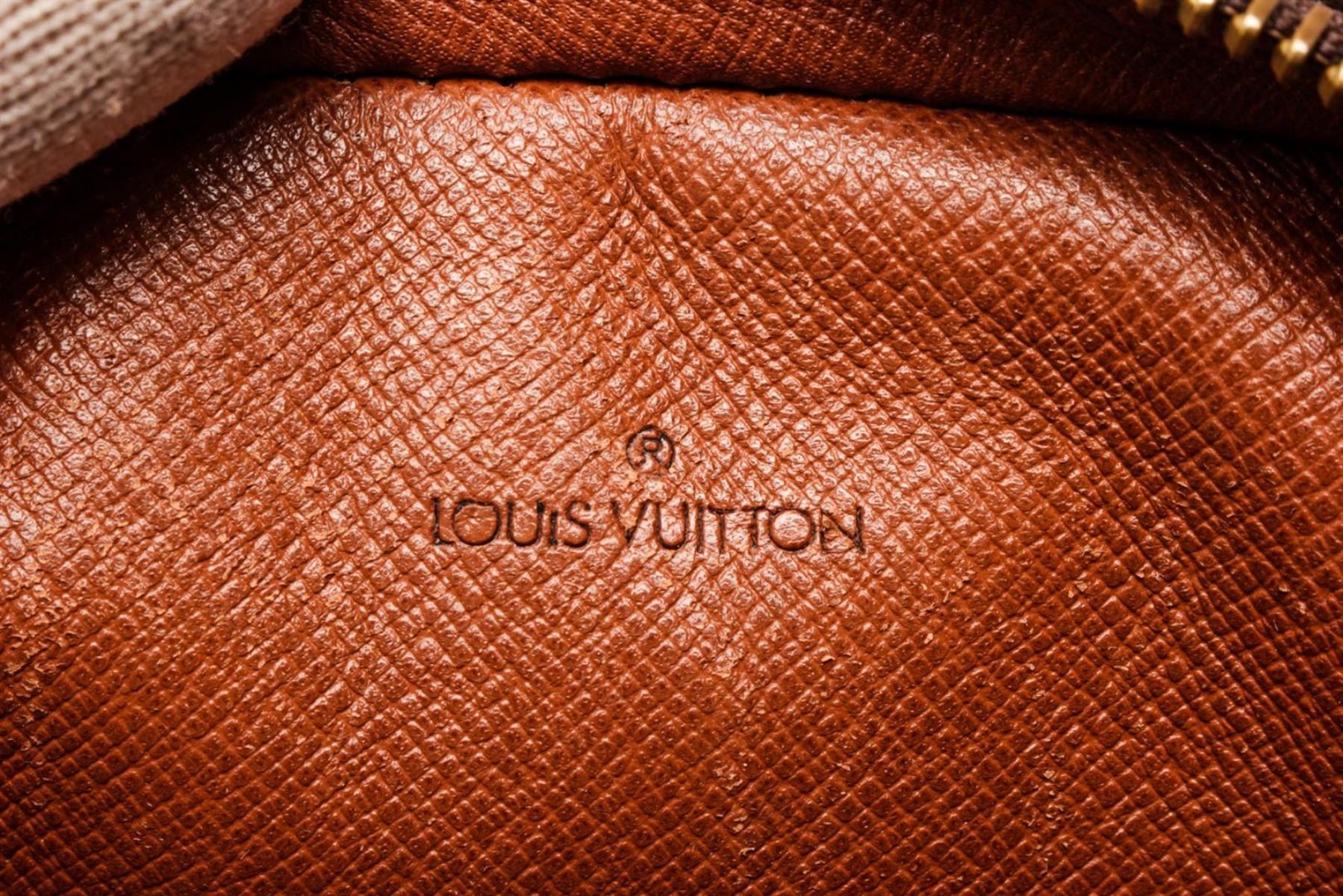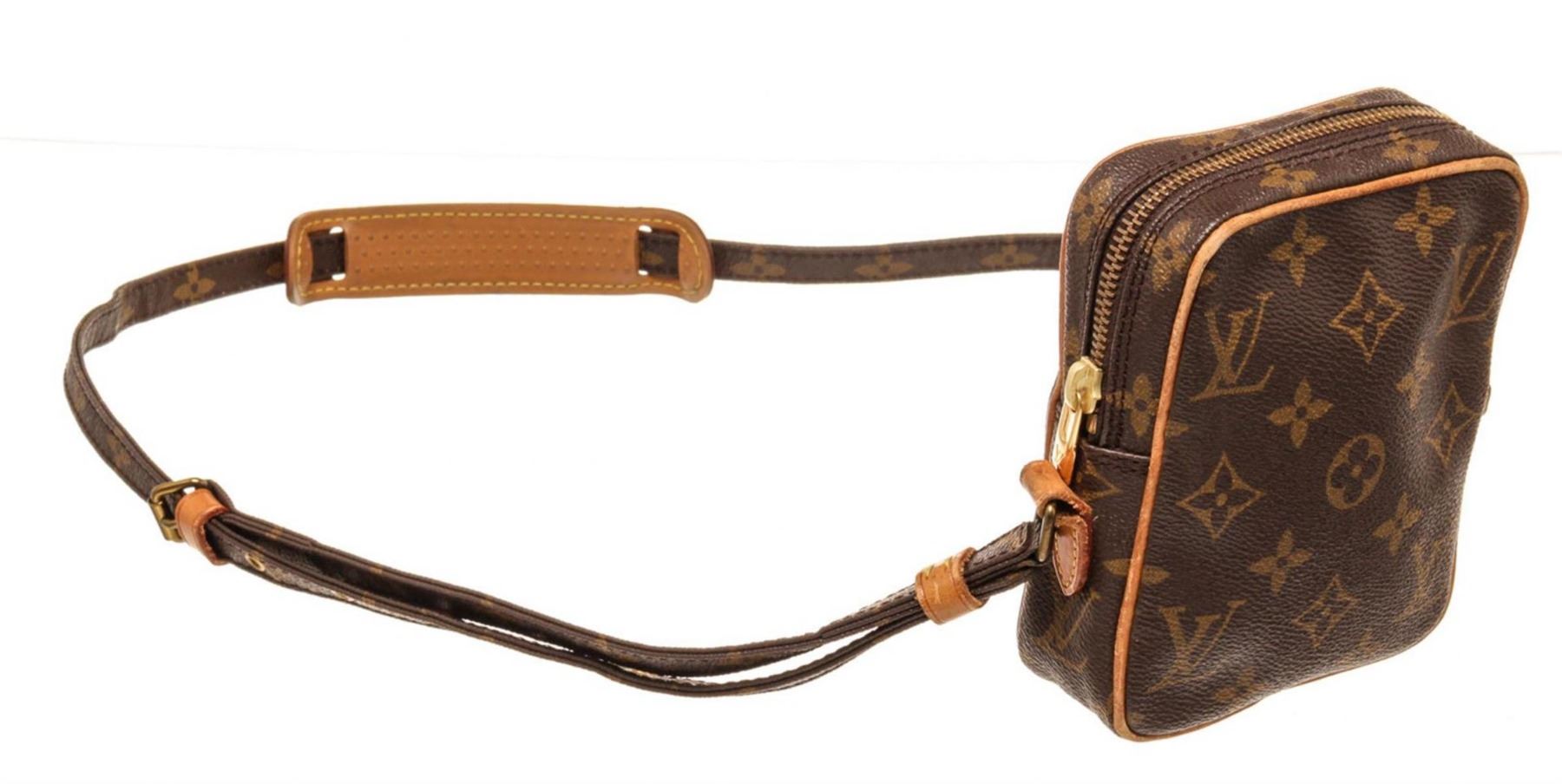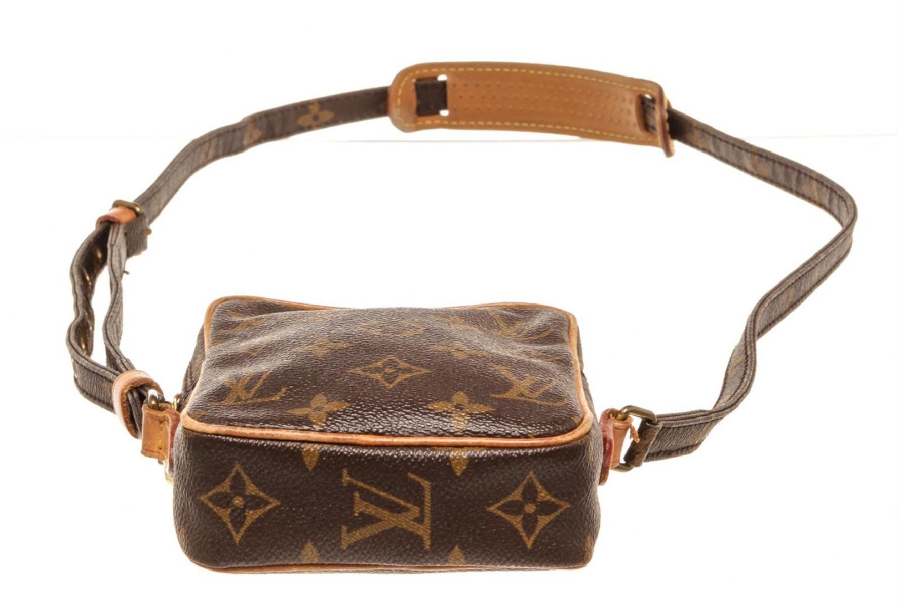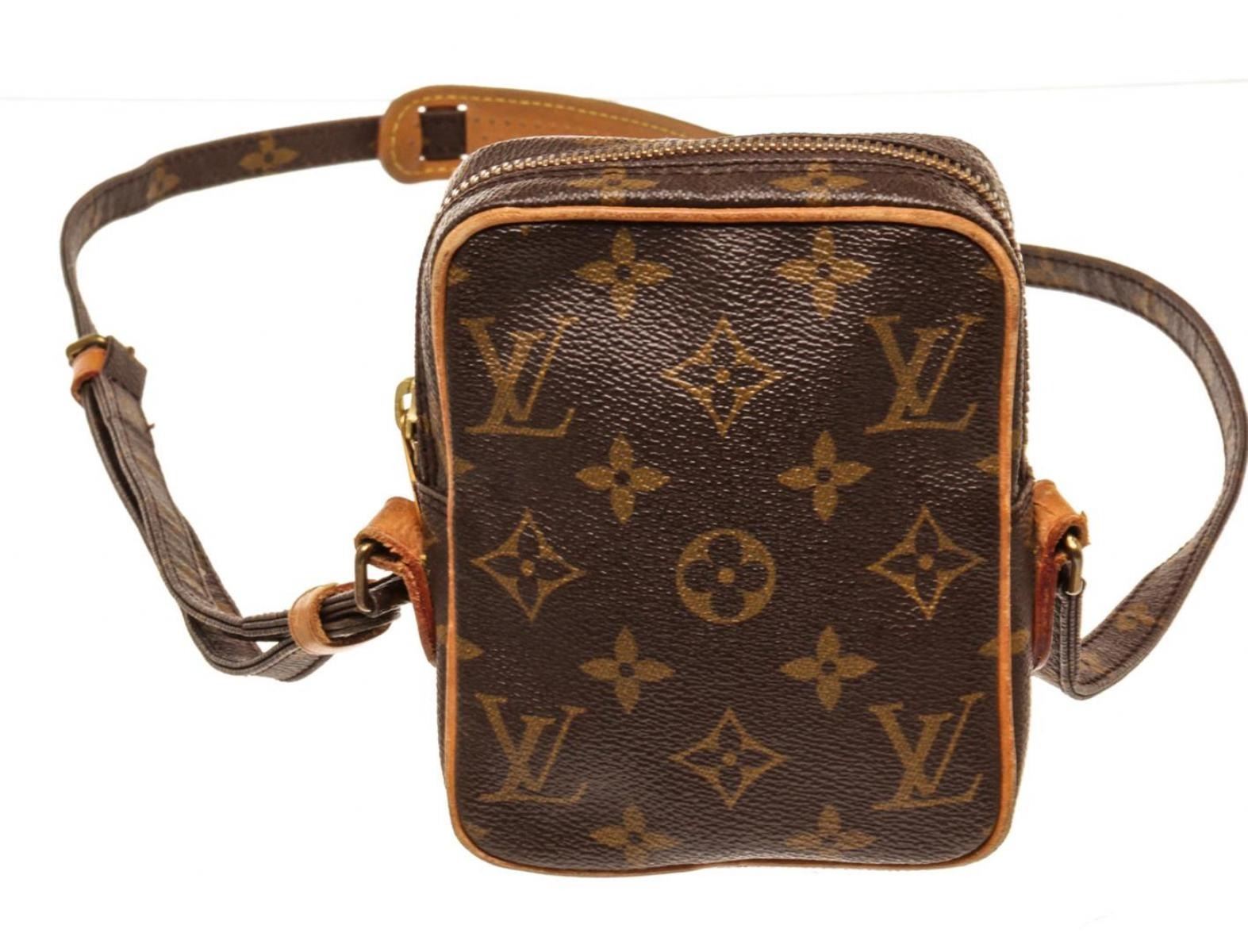 Louis Vuitton Brown Monogram Canvas Mini Danube Crossbody Bag with brass hardware, tan vachetta leather trim, adjustable flat shoulder strap, brown leather lining and zip closure at top.