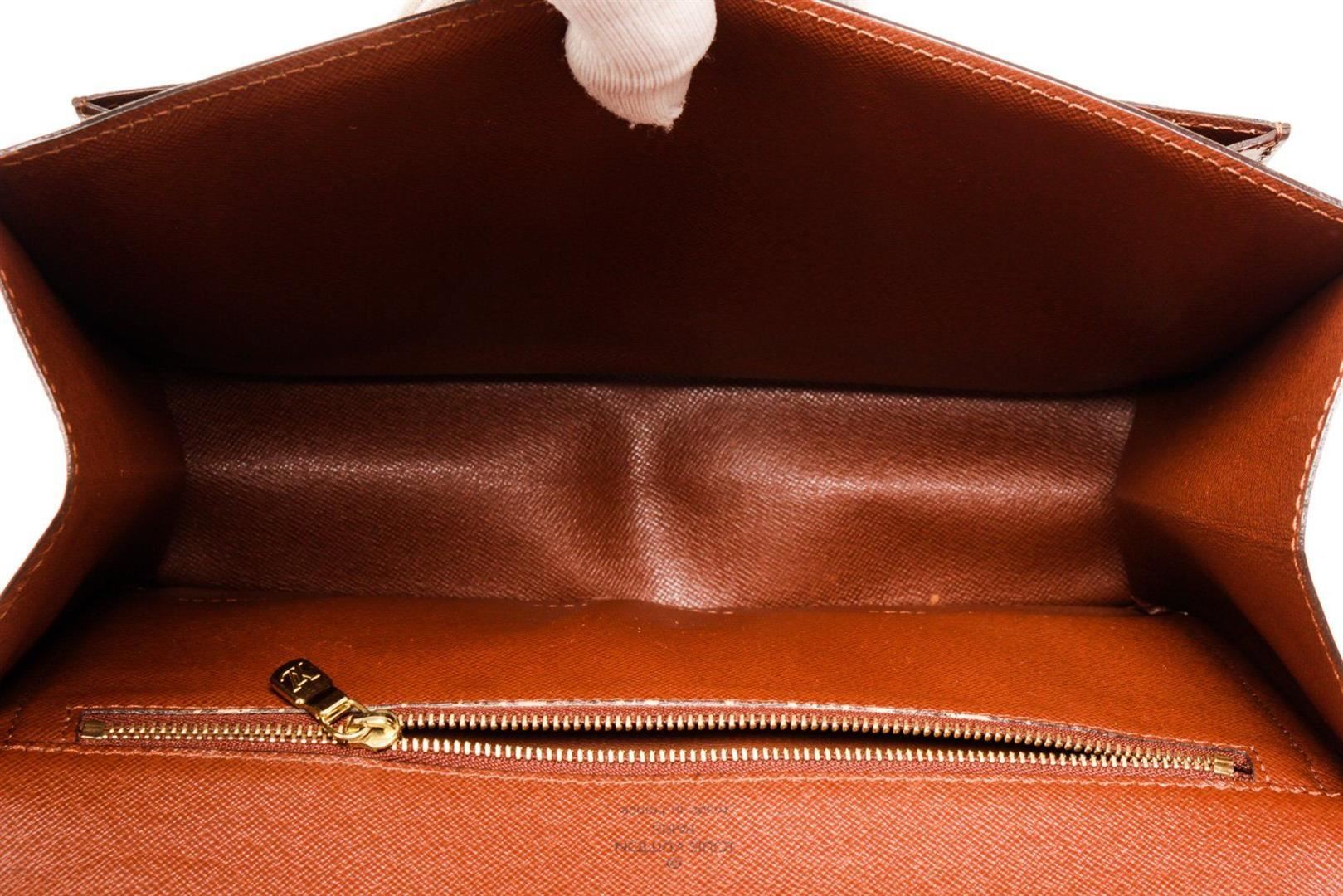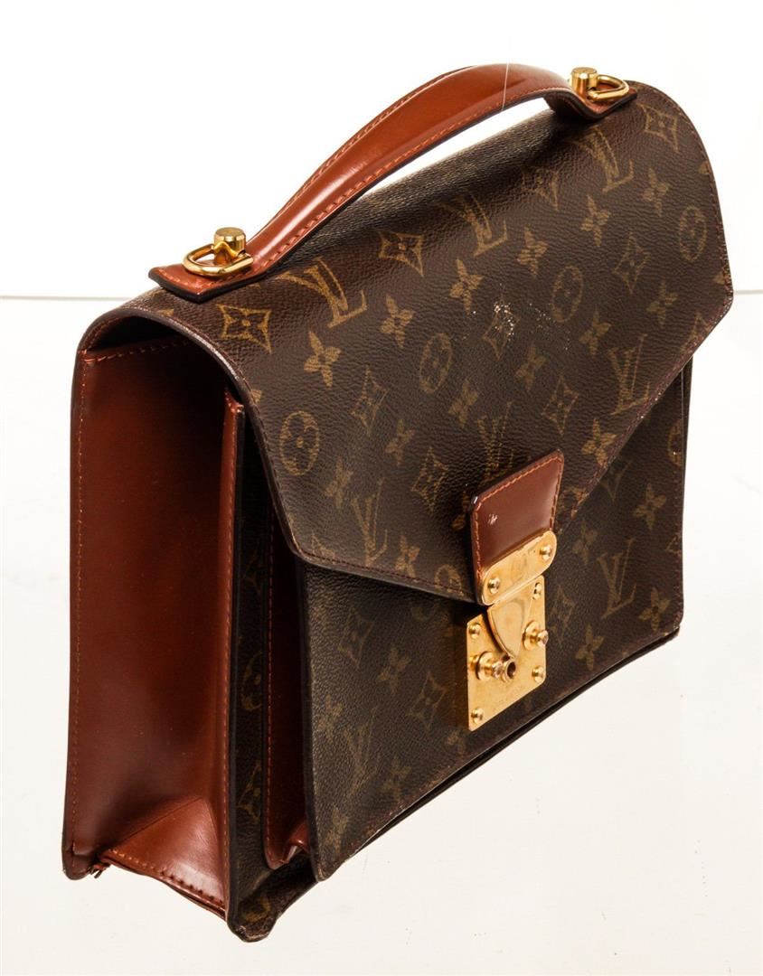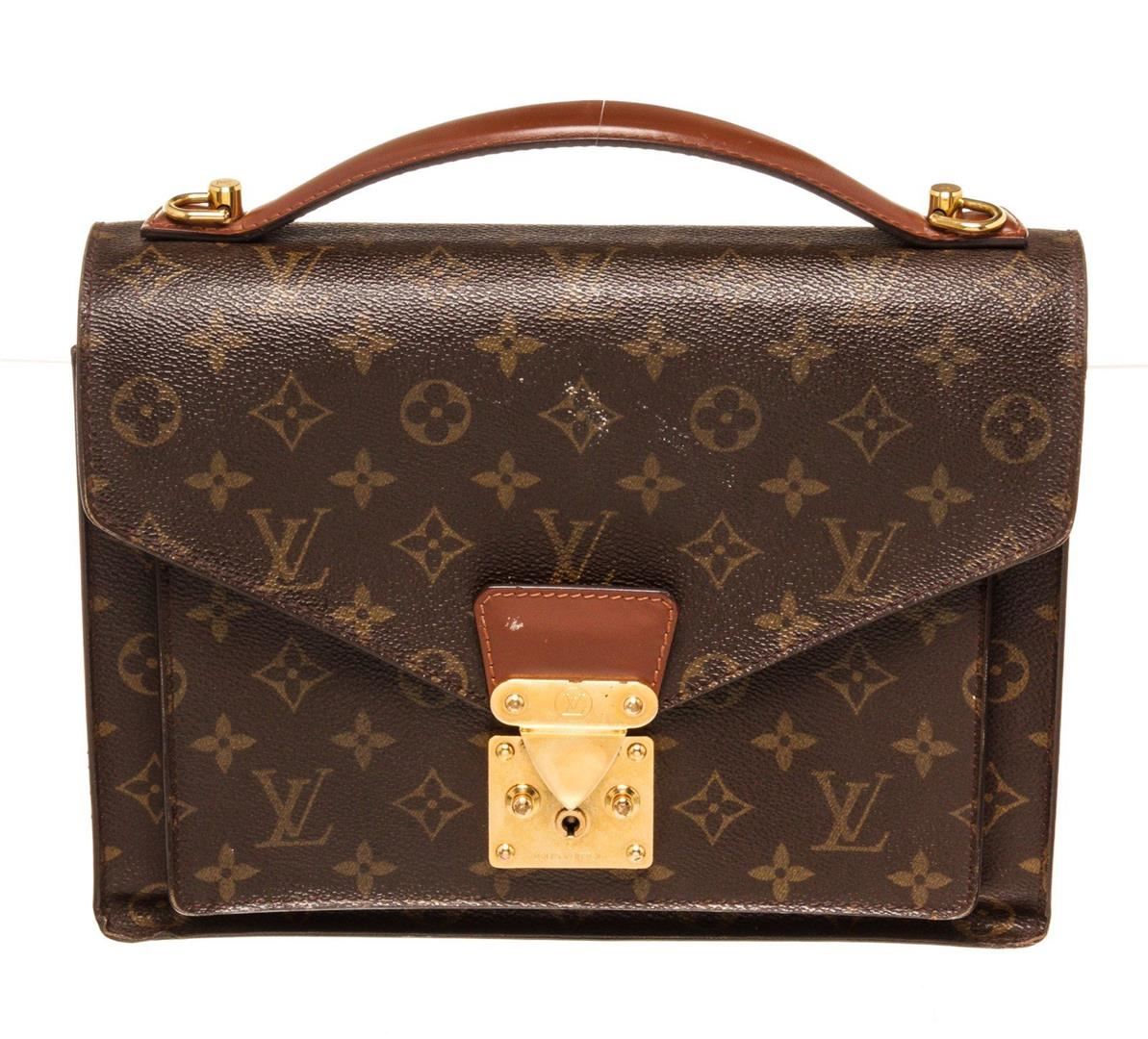 Louis Vuitton Brown Monogram Canvas Monceau Handbag with monogram canvas, gold-tone hardware, trim tan vachetta leather, interior zip pockets, top handle and push-lock closure.