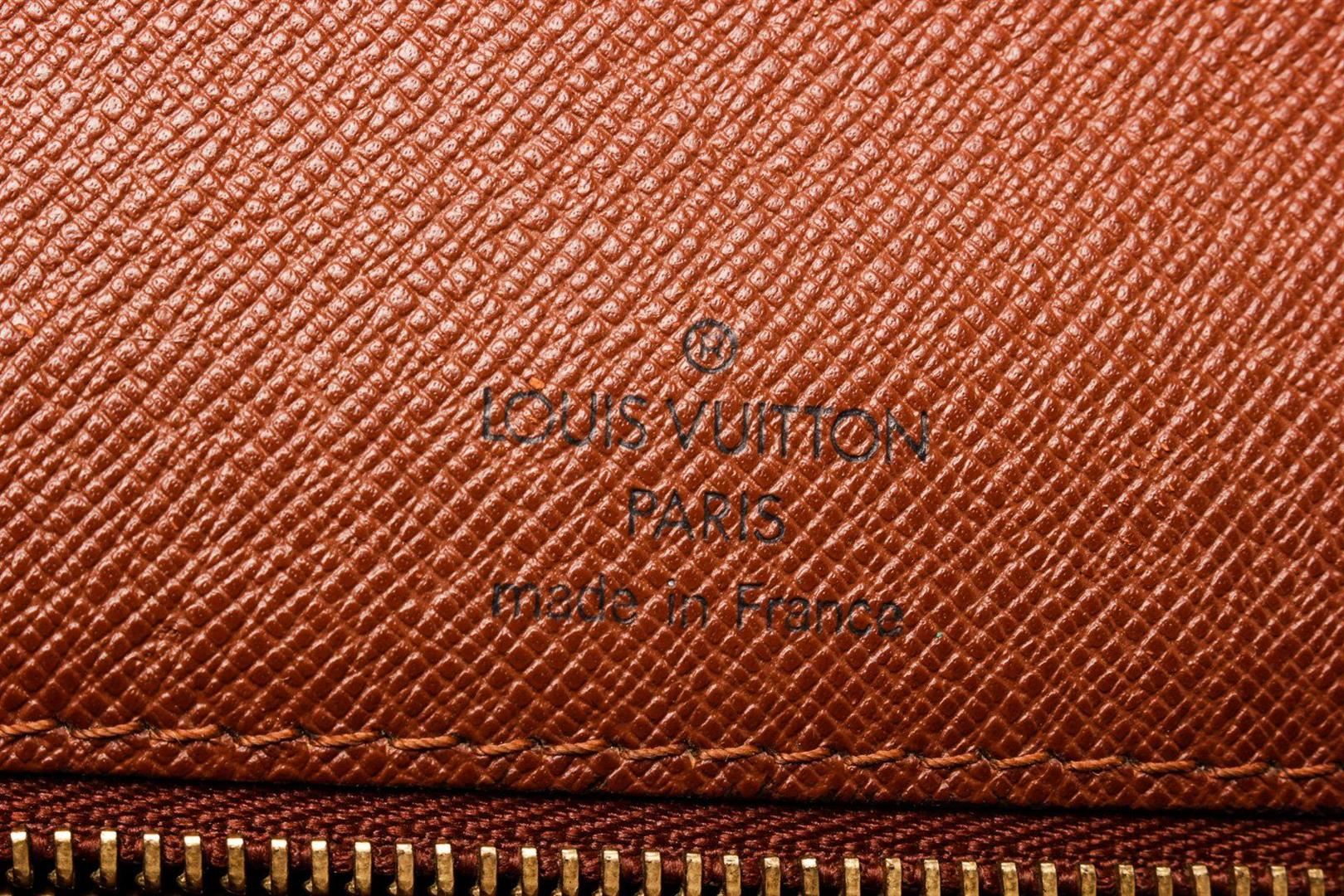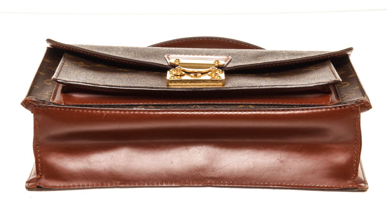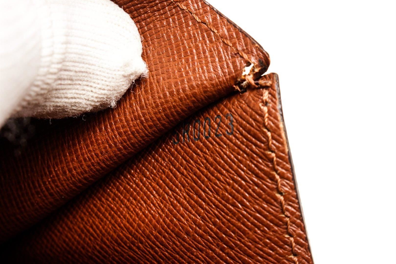 Louis Vuitton Brown Monogram Canvas Monceau Handbag with monogram canvas, gold-tone hardware, trim tan vachetta leather, interior zip pockets, top handle and push-lock closure.