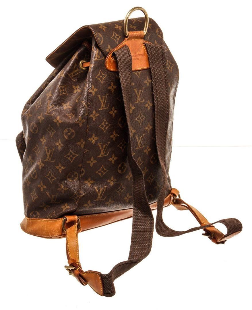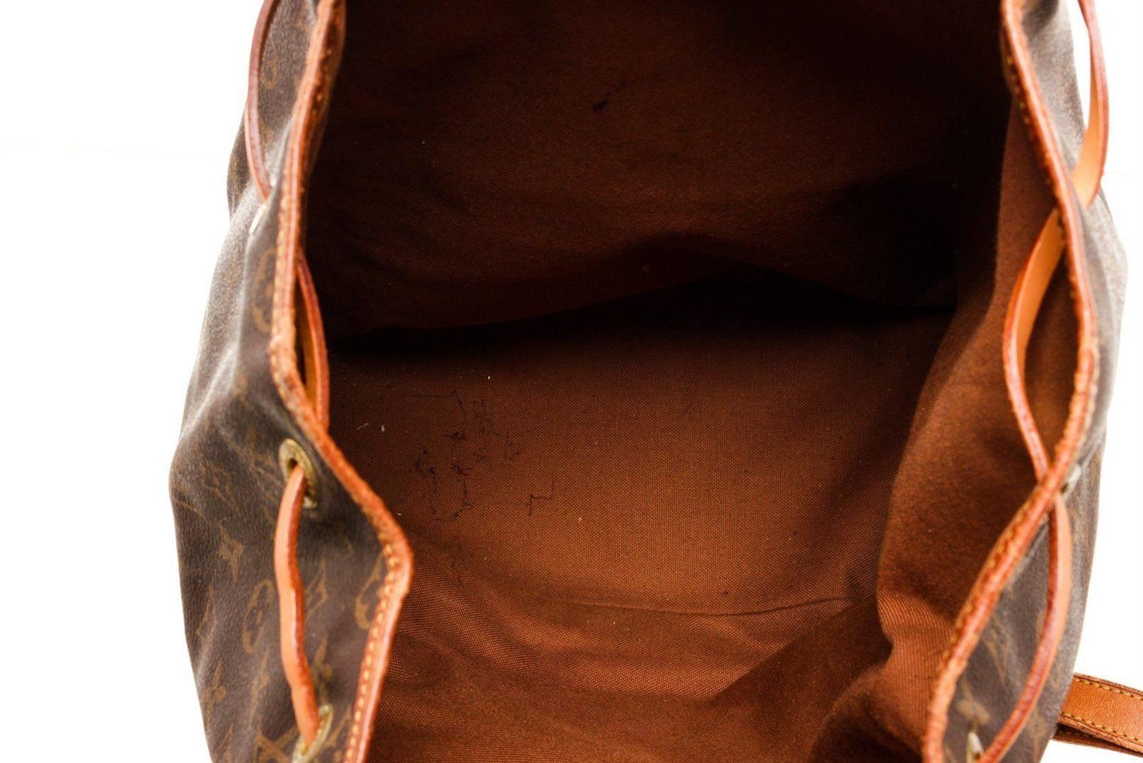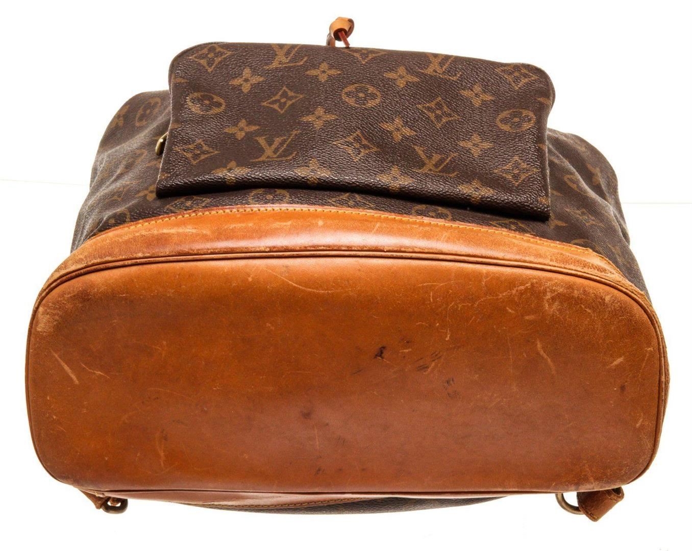 Louis Vuitton Brown Monogram Canvas Montsouris MM Backpack with monogram canvas, brass hardware, tan vachetta leather trim, dual adjustable shoulder straps, single pocket at exterior with zip closure, brown canvas lining, single slit pocket at interior wa
