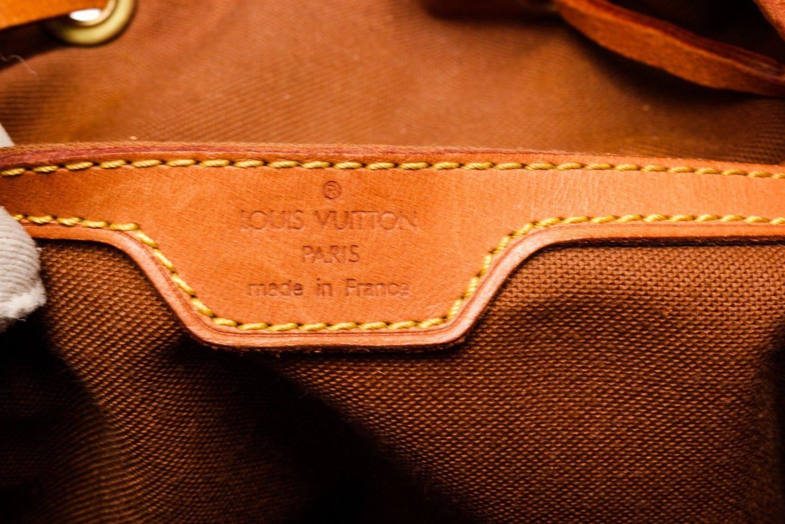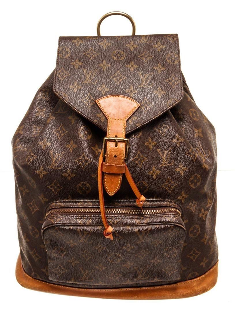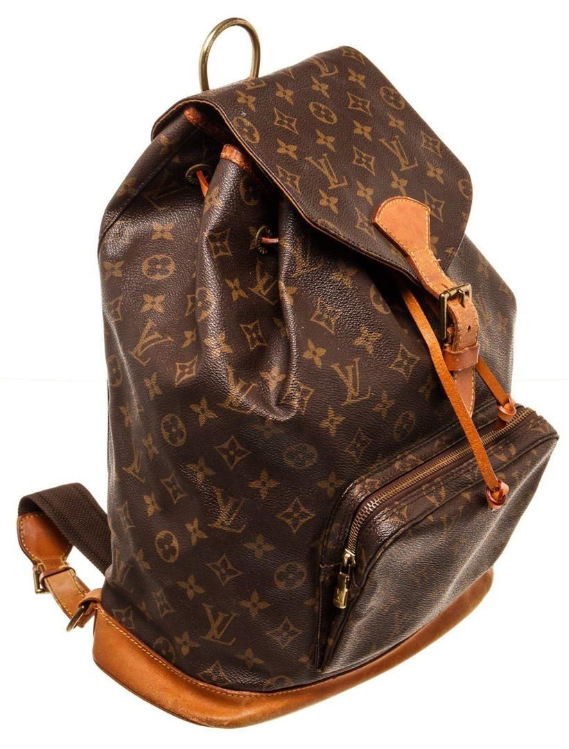 Louis Vuitton Brown Monogram Canvas Montsouris MM Backpack with monogram canvas, brass hardware, tan vachetta leather trim, dual adjustable shoulder straps, single pocket at exterior with zip closure, brown canvas lining, single slit pocket at interior wa