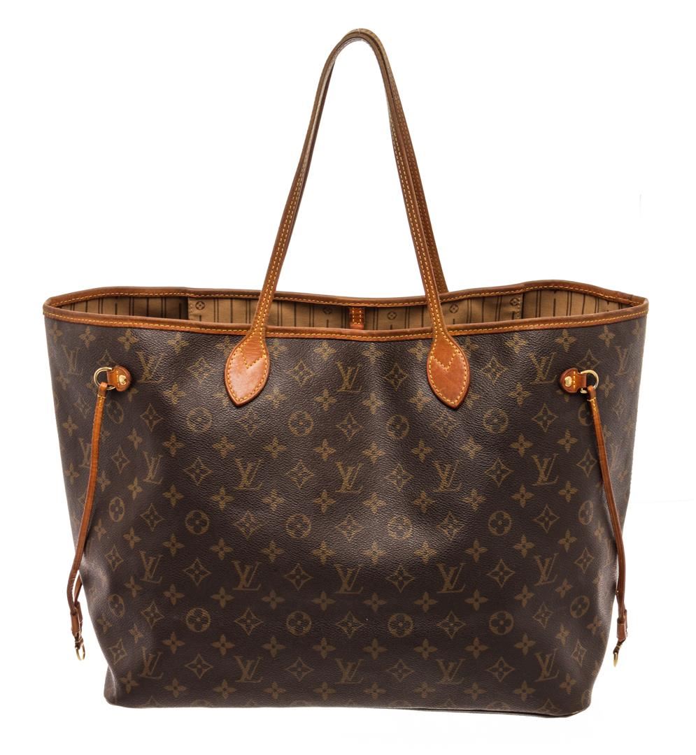 Louis Vuitton Brown Monogram Canvas Neverfull GM Tote Bag. All available information is listed in the description and shown in the photos. Louis Vuitton Brown Monogram Canvas Neverfull GM Tote Bag with brown coated canvas, brass hardware, dual shoulder straps, canvas lining & single interior pocket, clasp closure at top. Height: 12.5" Width: 15.5" Depth: 8", Shoulder Strap Drop: 8.25" / 31.75 x 39.37 x 20.32 Cm