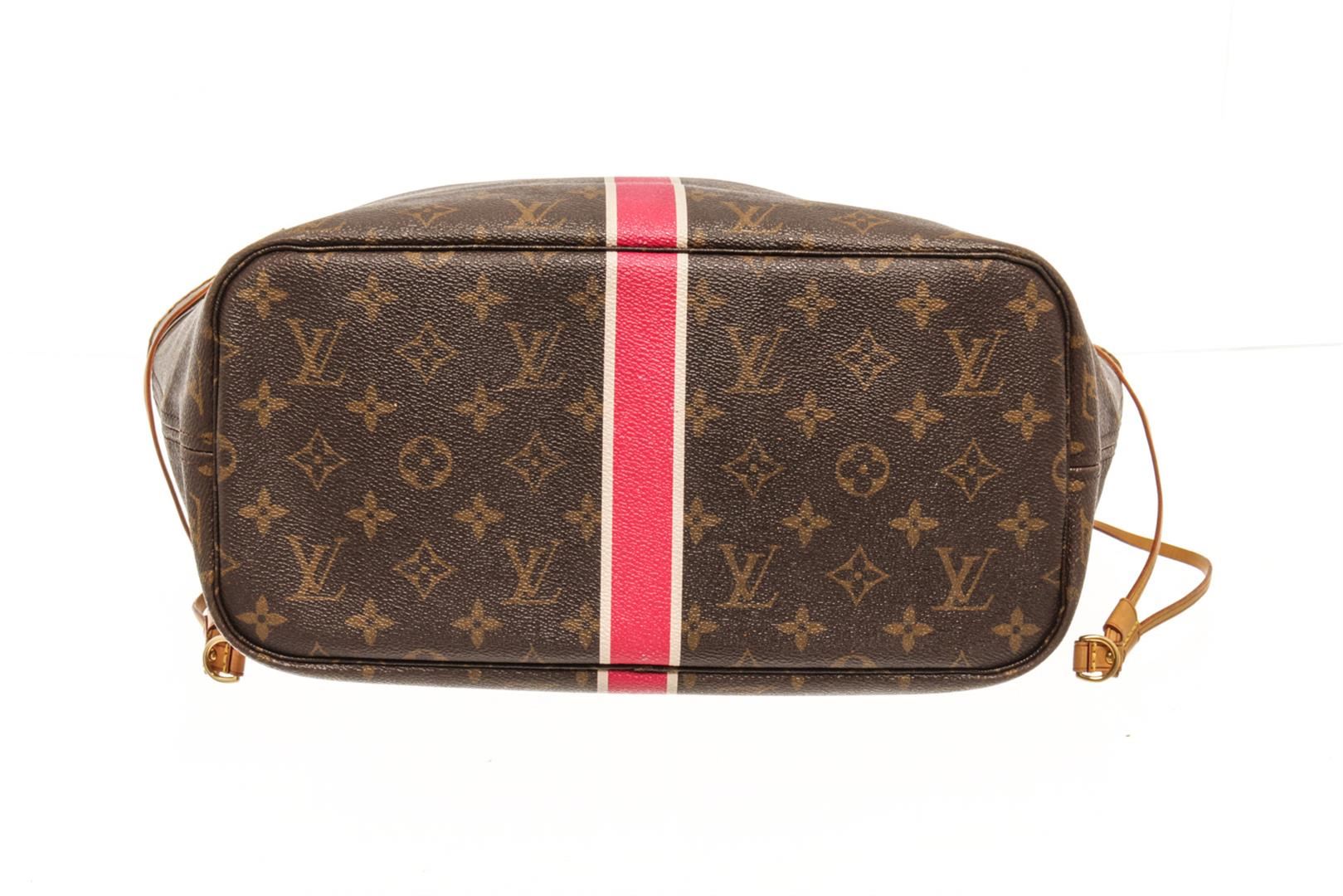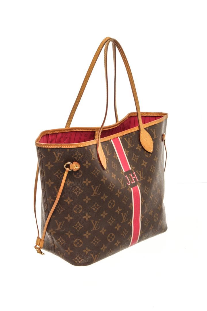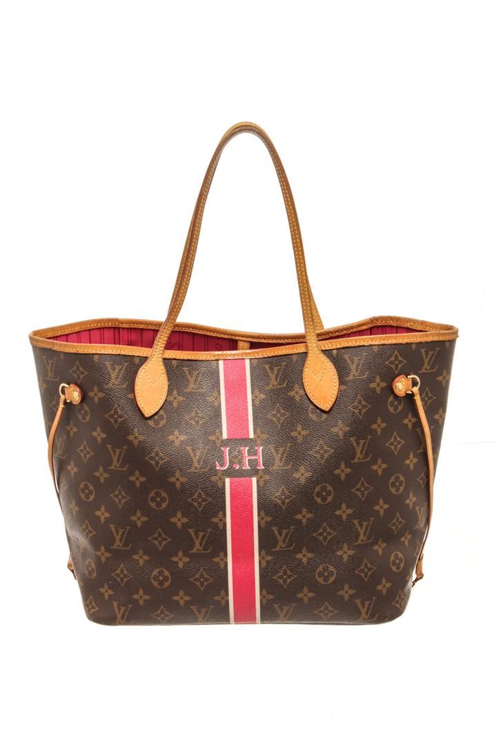 One Louis Vuitton Brown Monogram Canvas Neverfull MM Shoulder Bag. Item is sold AS-IS. All available information is listed in the description and shown in the photo. Louis Vuitton Brown Monogram Canvas Neverfull MM Shoulder Bag with monogram coated canvas, vachetta cowhide leather shoulder straps with polished brass hardware, the wide top is open to a striped pink fabric interior with a hanging zipper pocket. There are "J.H." initials on front of bag, stains on the lining. Please refer to photos. length: 12.50 in, Height: 11.50 in, Width: 6.25 in / 31.75 x 29.21 x 15.87 CM