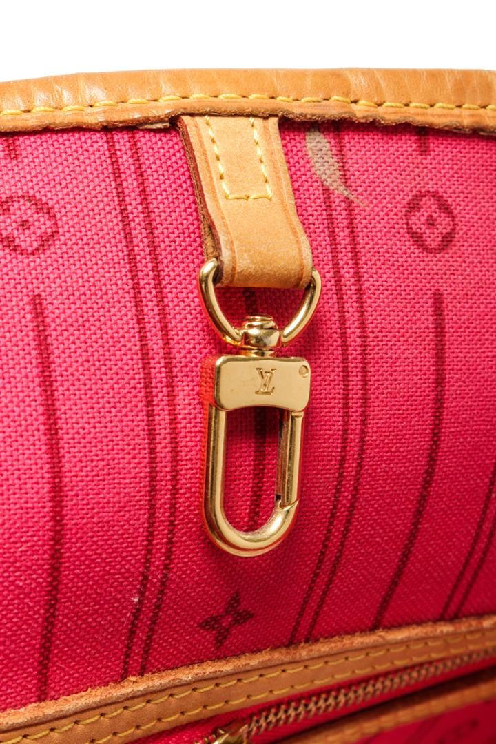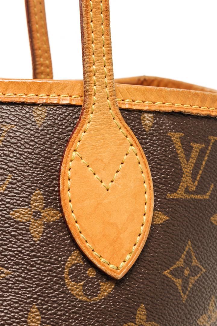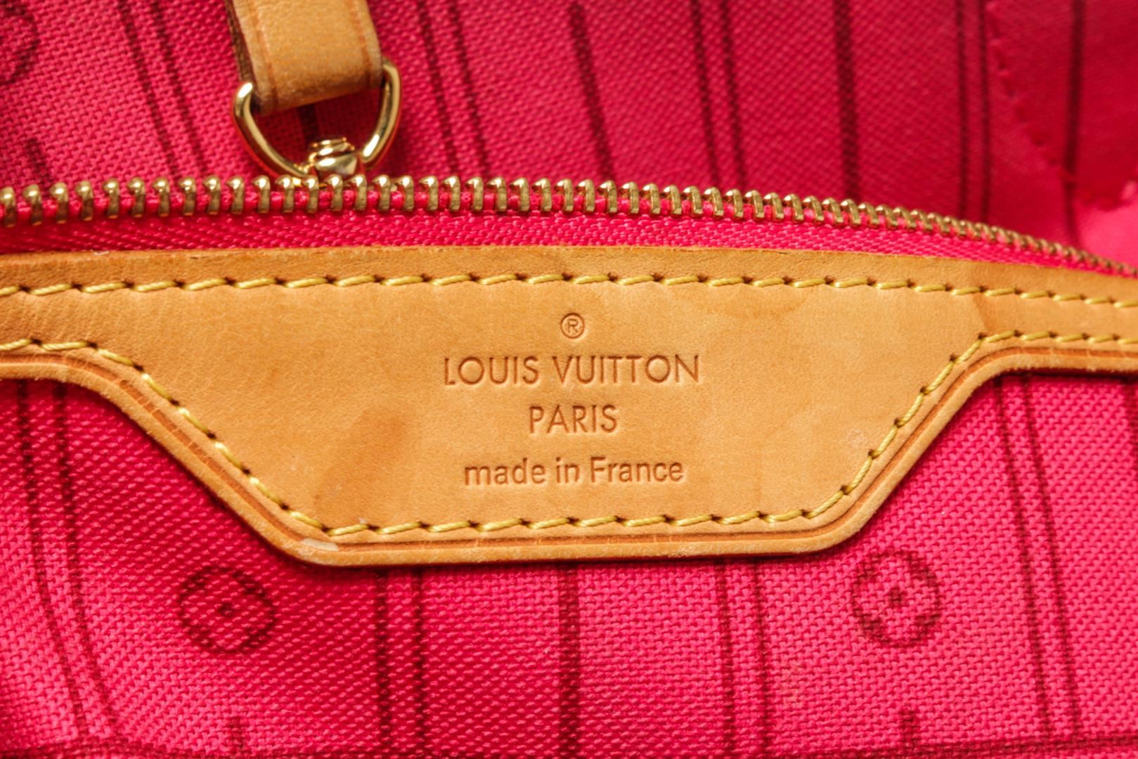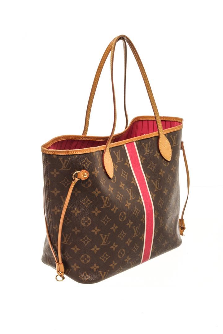 One Louis Vuitton Brown Monogram Canvas Neverfull MM Shoulder Bag. Item is sold AS-IS. All available information is listed in the description and shown in the photo. Louis Vuitton Brown Monogram Canvas Neverfull MM Shoulder Bag with monogram coated canvas, vachetta cowhide leather shoulder straps with polished brass hardware, the wide top is open to a striped pink fabric interior with a hanging zipper pocket. There are "J.H." initials on front of bag, stains on the lining. Please refer to photos. length: 12.50 in, Height: 11.50 in, Width: 6.25 in / 31.75 x 29.21 x 15.87 CM