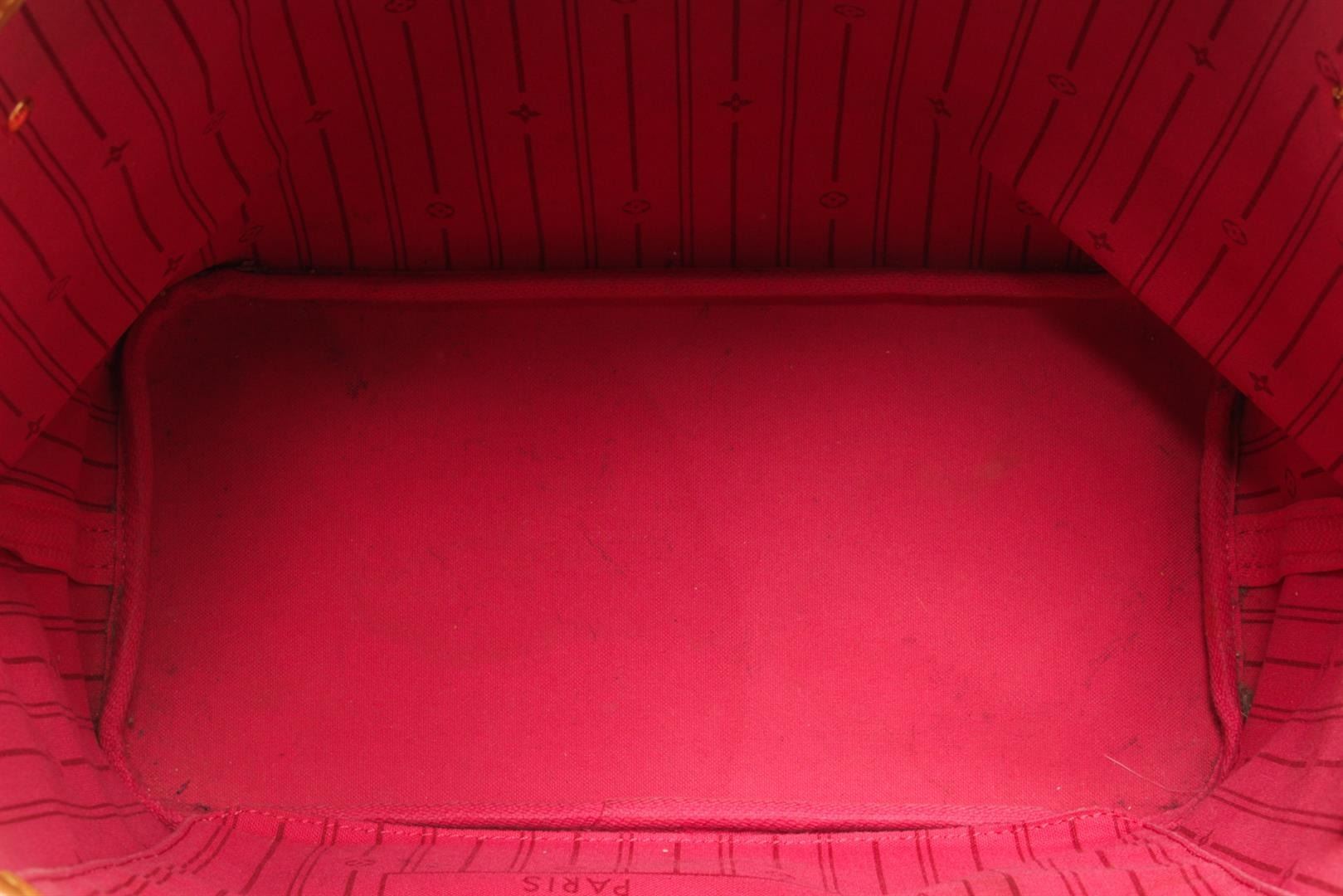 One Louis Vuitton Brown Monogram Canvas Neverfull MM Shoulder Bag. Item is sold AS-IS. All available information is listed in the description and shown in the photo. Louis Vuitton Brown Monogram Canvas Neverfull MM Shoulder Bag with monogram coated canvas, vachetta cowhide leather shoulder straps with polished brass hardware, the wide top is open to a striped pink fabric interior with a hanging zipper pocket. There are "J.H." initials on front of bag, stains on the lining. Please refer to photos. length: 12.50 in, Height: 11.50 in, Width: 6.25 in / 31.75 x 29.21 x 15.87 CM