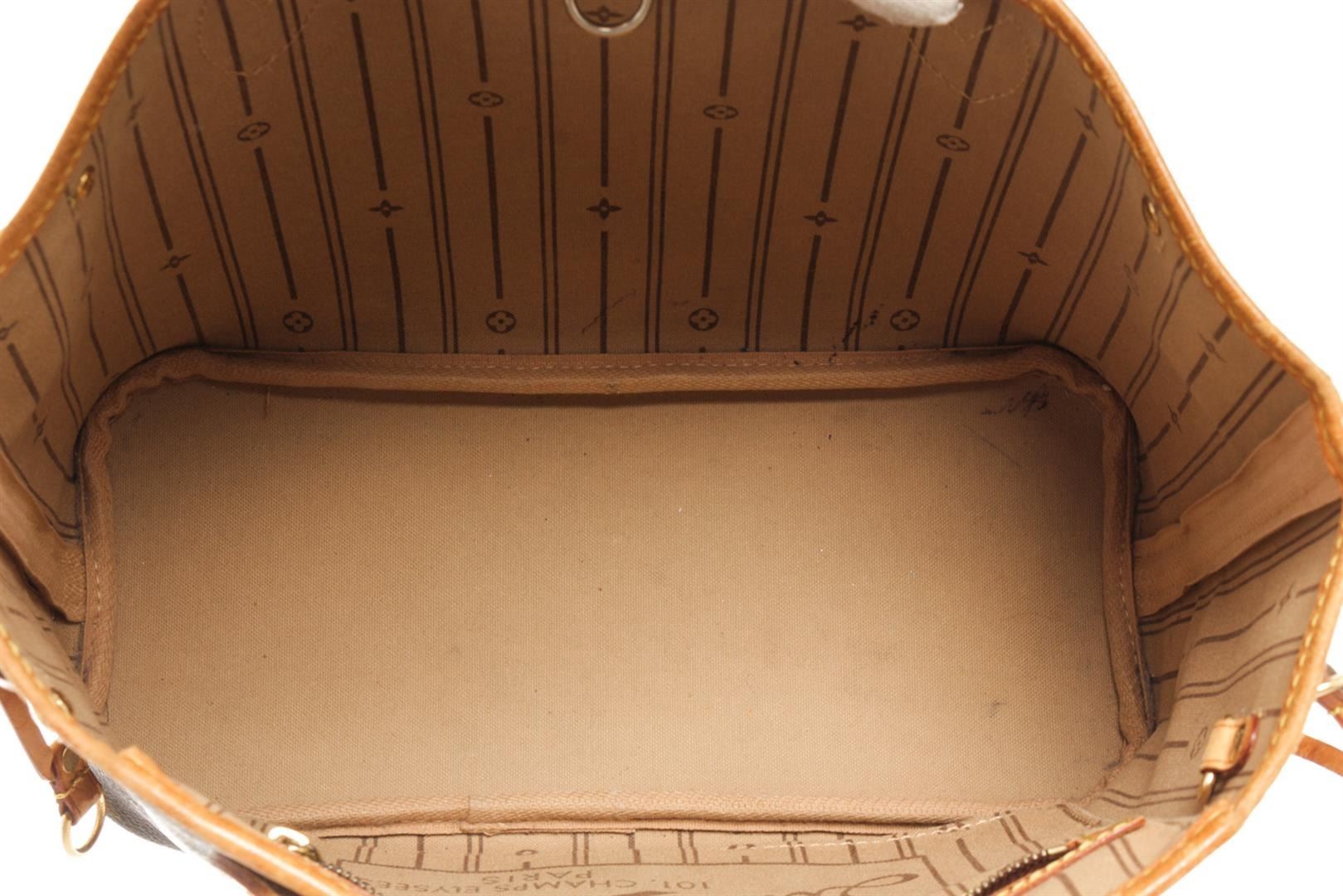 One Louis Vuitton Brown Monogram Canvas Neverfull PM Tote bag. Item is sold AS-IS. All available information is listed in the description and shown in the photo. Louis Vuitton Brown Monogram Canvas Neverfull PM Tote bag with gold-tone hardware, leather trim, two long top handles, internal zip-fastening pocket, open top. There is tearing on the top lining of the bag and pen marks on the canvas lining. Please refer to photos.