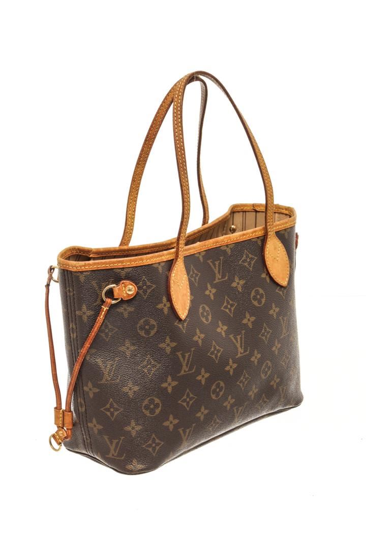One Louis Vuitton Brown Monogram Canvas Neverfull PM Tote bag. Item is sold AS-IS. All available information is listed in the description and shown in the photo. Louis Vuitton Brown Monogram Canvas Neverfull PM Tote bag with gold-tone hardware, leather trim, two long top handles, internal zip-fastening pocket, open top. There is tearing on the top lining of the bag and pen marks on the canvas lining. Please refer to photos.