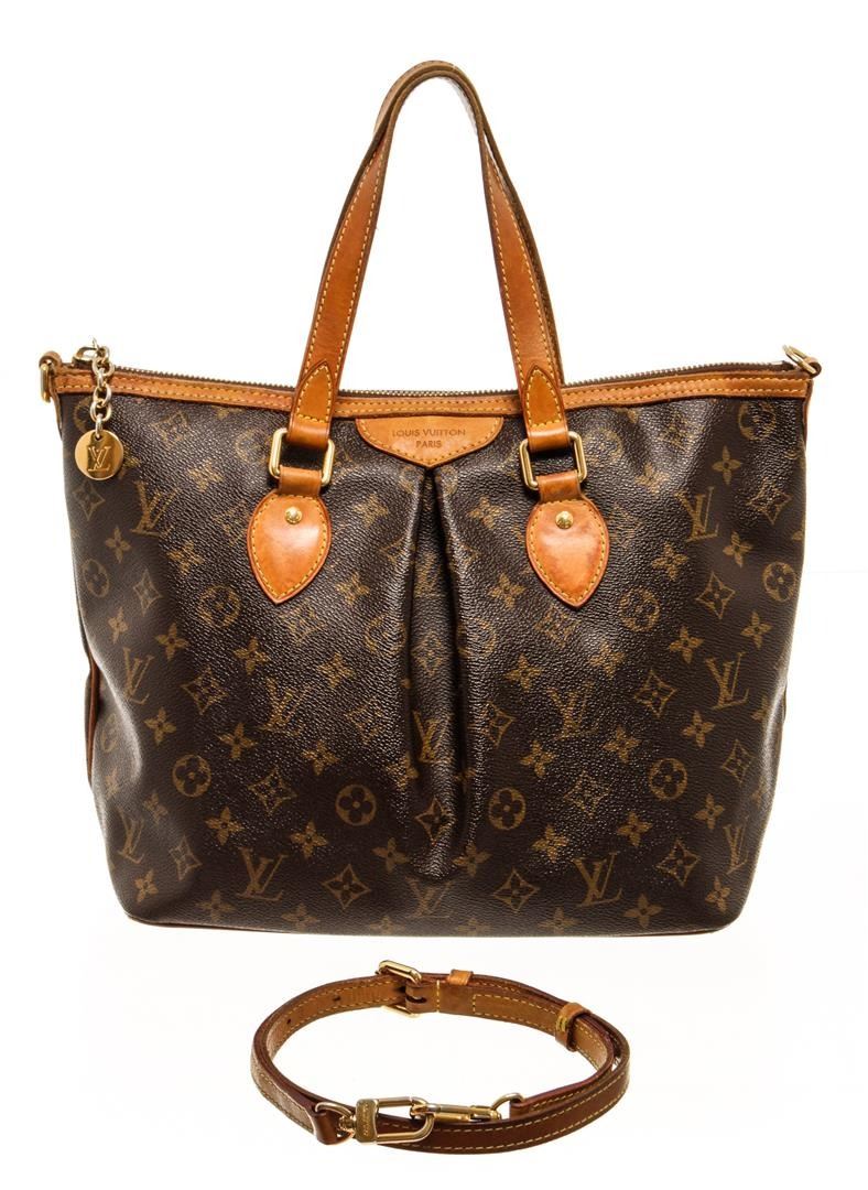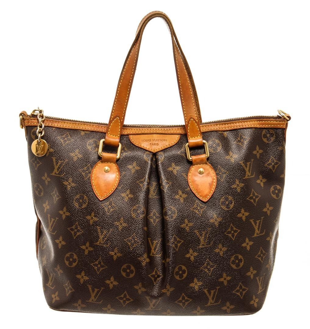 One Louis Vuitton Brown Monogram Canvas Palermo PM Tote Bag. Item is sold AS-IS. All available information is listed in the description and shown in the photo. louis vuitton brown monogram canvas palermo pm tote bag with monogram coated canvas, vachetta cowhide leather top handles, an optional shoulder strap, piping, and trim with polished brass hardware including an lv monogram zipper pull charm. the top zips open to a cocoa brown fabric interior with patch pockets. Length: 14.00 in, Width: 6.25 in, Height: 10.00 in / 35.56 x 15.87 x 25.4 CM