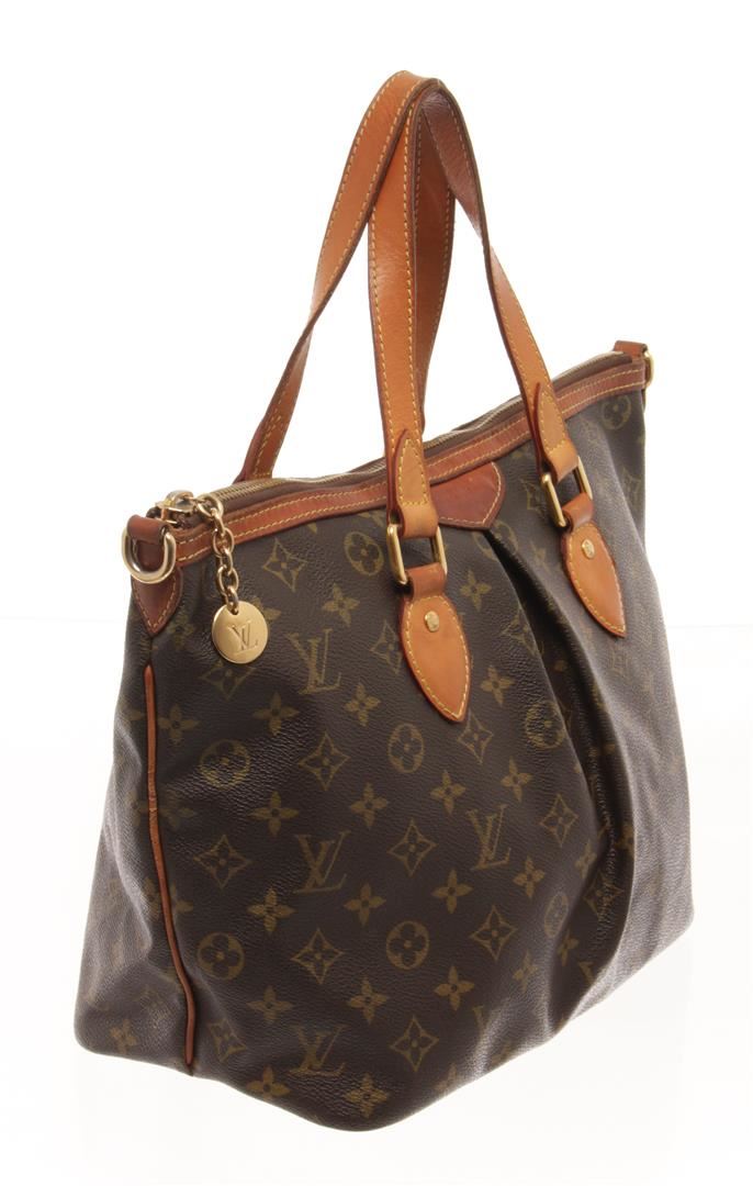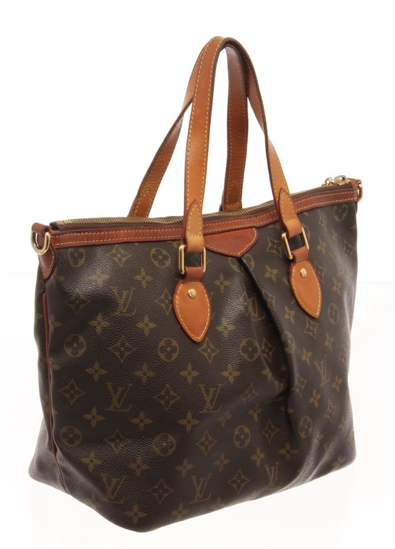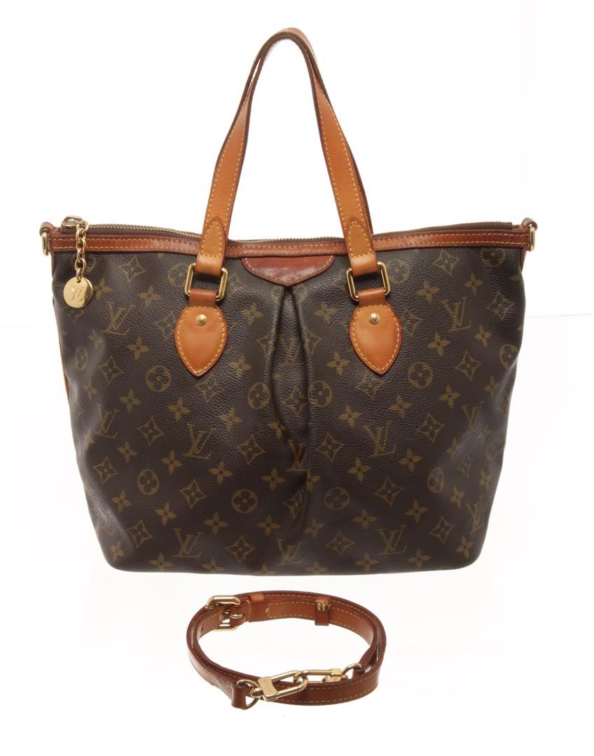 One Louis Vuitton Brown Monogram Canvas Palermo PM Tote Bag. Item is sold AS-IS. All available information is listed in the description and shown in the photo. Louis Vuitton Brown Monogram Canvas Palermo PM Tote Bag with monogram coated canvas, vachetta cowhide leather top handles, an optional shoulder strap, and trim with gold tone hardware including an lv monogram zipper pull charm. the top zips open to a cocoa brown fabric interior with patch pockets. Length: 14.00 in, Width: 6.25 in, Height: 10.00 in / 35.56 x 15.87 x 25.4 CM