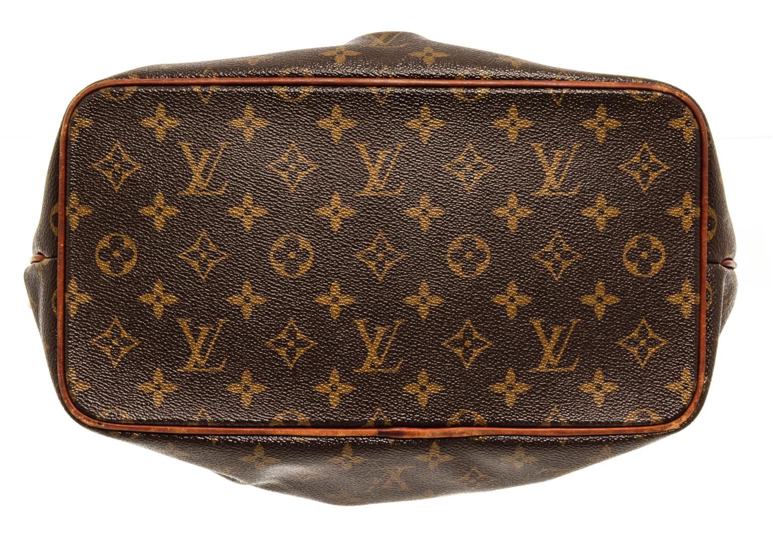 One Louis Vuitton Brown Monogram Canvas Palermo PM Tote Bag. Item is sold AS-IS. All available information is listed in the description and shown in the photo. louis vuitton brown monogram canvas palermo pm tote bag with monogram coated canvas, vachetta cowhide leather top handles, an optional shoulder strap, piping, and trim with polished brass hardware including an lv monogram zipper pull charm. the top zips open to a cocoa brown fabric interior with patch pockets. Length: 14.00 in, Width: 6.25 in, Height: 10.00 in / 35.56 x 15.87 x 25.4 CM