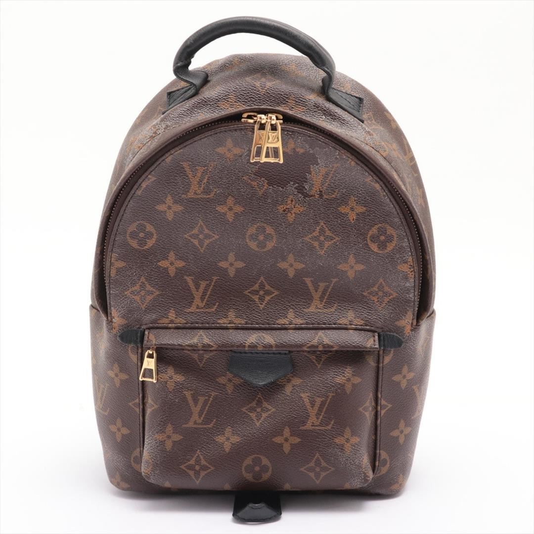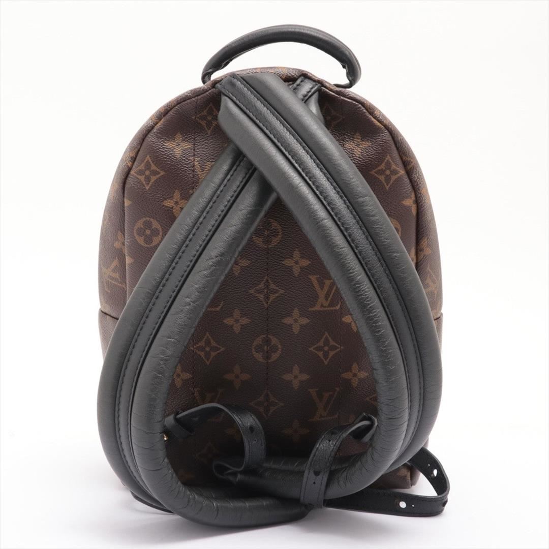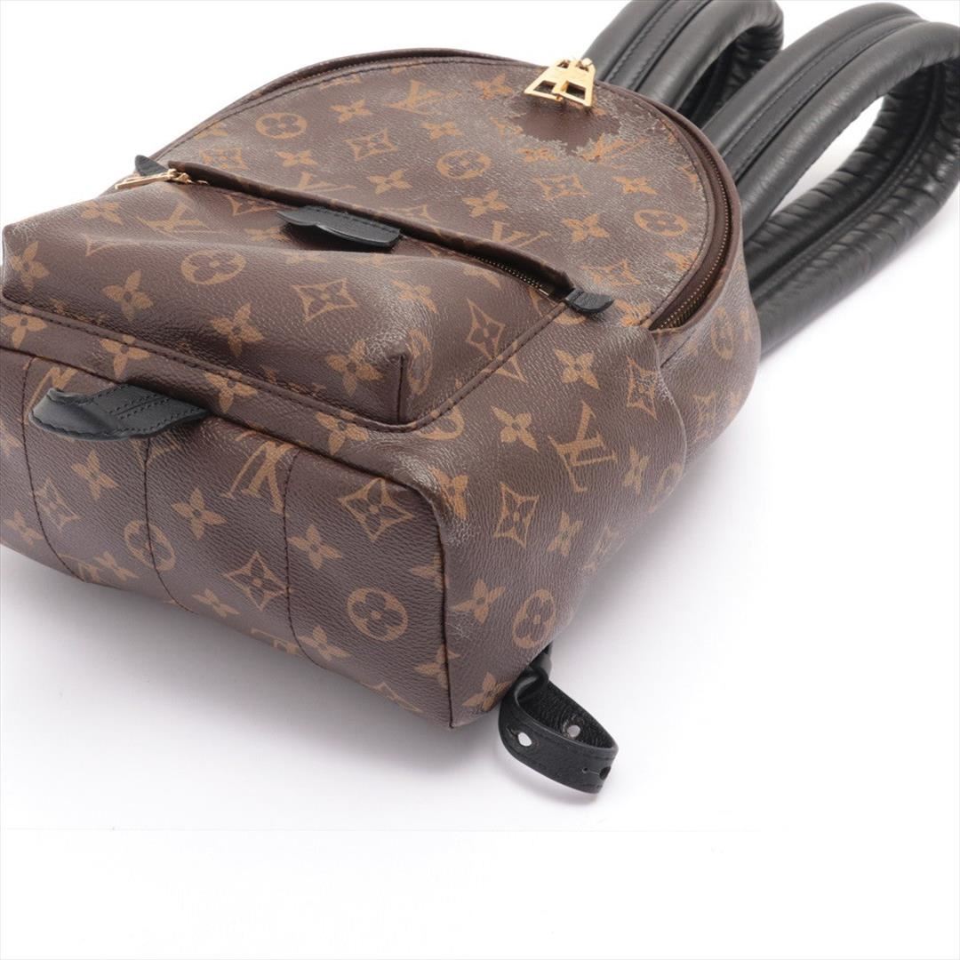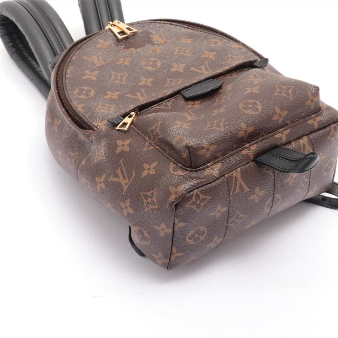 Brown and tan Monogram coated canvas Louis Vuitton Palm Springs PM backpack with gold-tone hardware, black leather trim, black nylon lining, interior slip pocket, exterior zipped pocket, padded adjustable shoulder straps and two-way zip closure at top. 8.7" x 11.4" x 3.9" shoulder straps: 19.7" - 26.7" /22cm x 29cm x 10cm shoulder straps: 55cm - 73cm