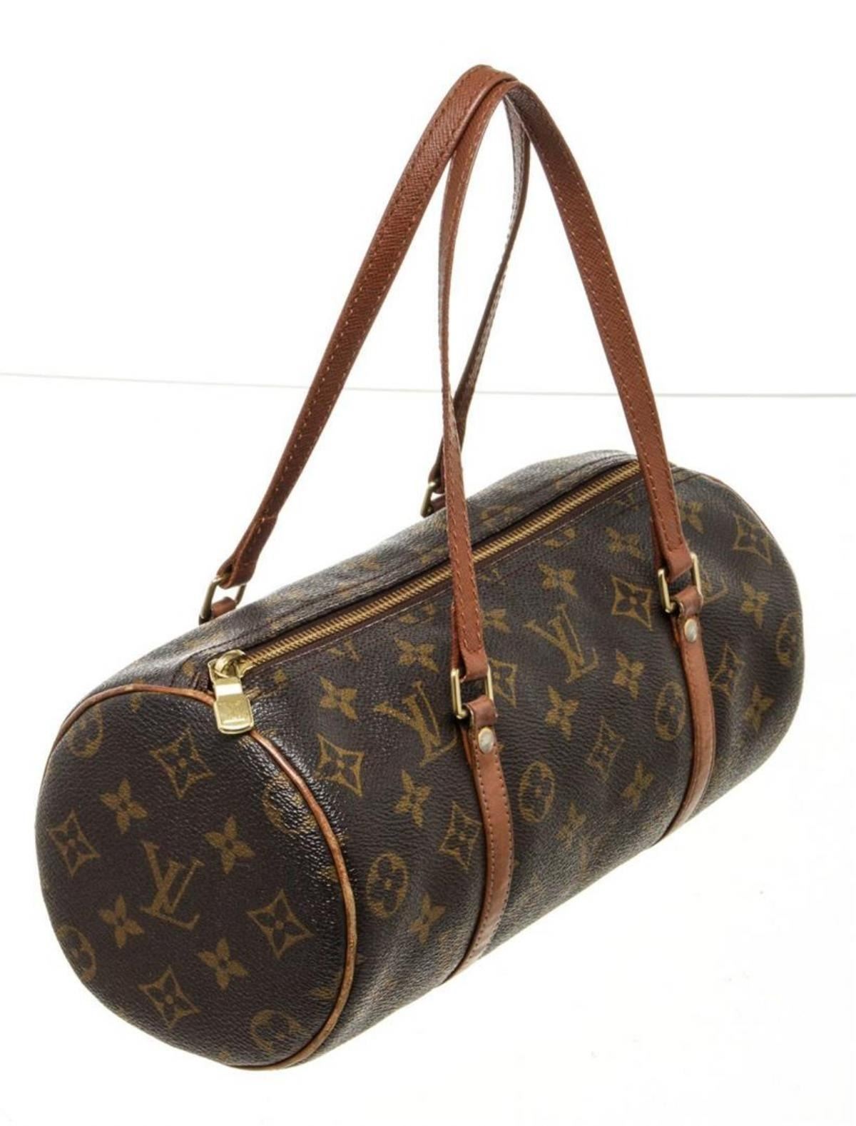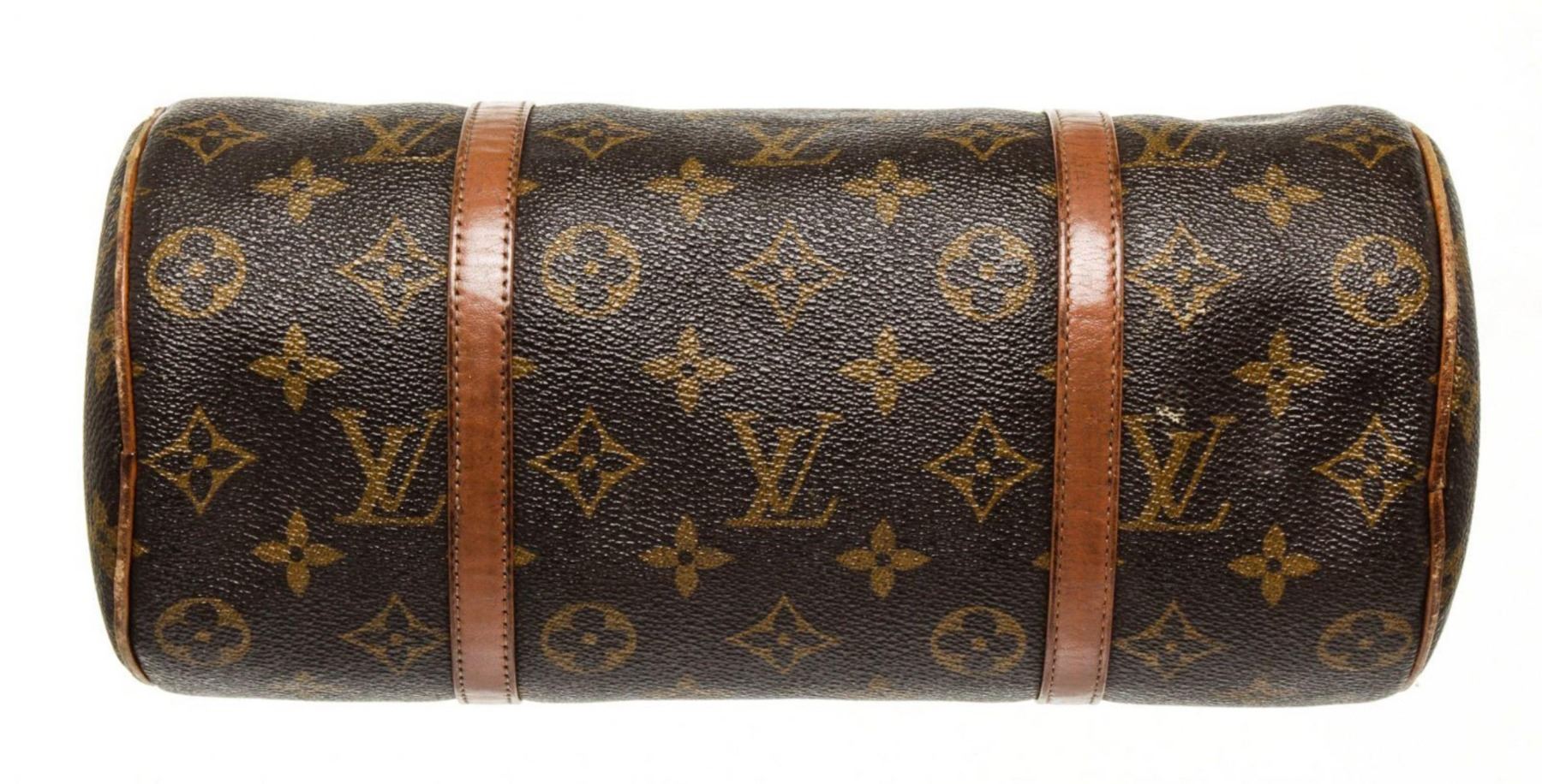 Louis Vuitton Brown Monogram Canvas Papillon 30cm Handbag with damier canvas, gold-tone hardware, trim tan vachetta leather, shoulder strap and zipper closure.