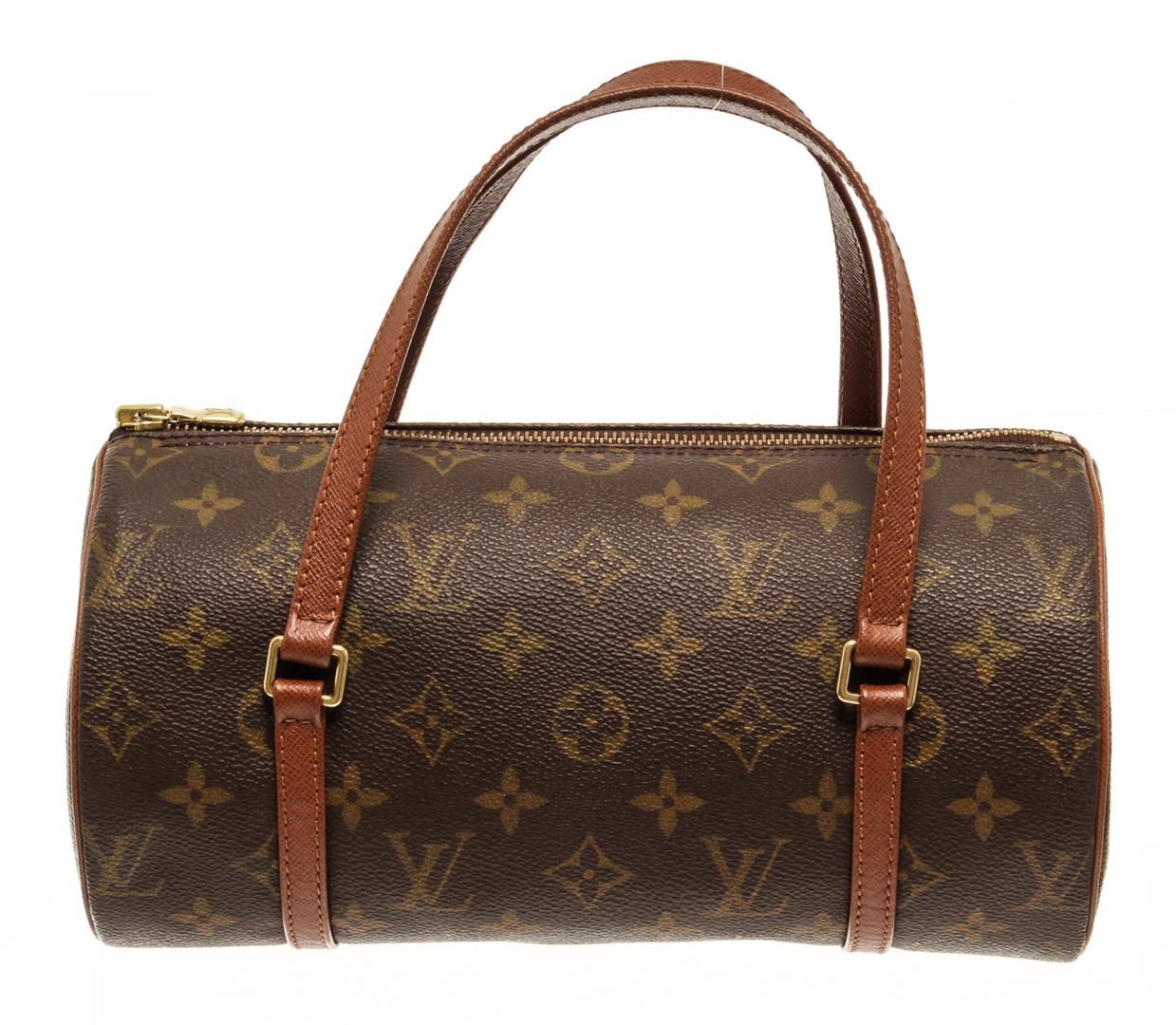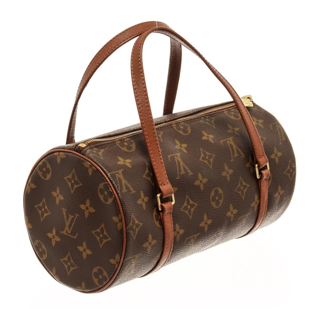 One Louis Vuitton Brown Monogram Canvas Papillon 26 Shoulder Bag. Item is sold AS-IS. All available information is listed in the description and shown in the photo. louis vuitton brown monogram canvas papillon 26 bag with gold-tone hardware, leather trim, main compartment, top zip fastening, two top handles Depth 5.1 in, Handle 6.3 in, Height 5.1 in, Width 10.2 in / Depth 13 cm, Handle 16 cm, Height 13 cm, nWidth 26 cm