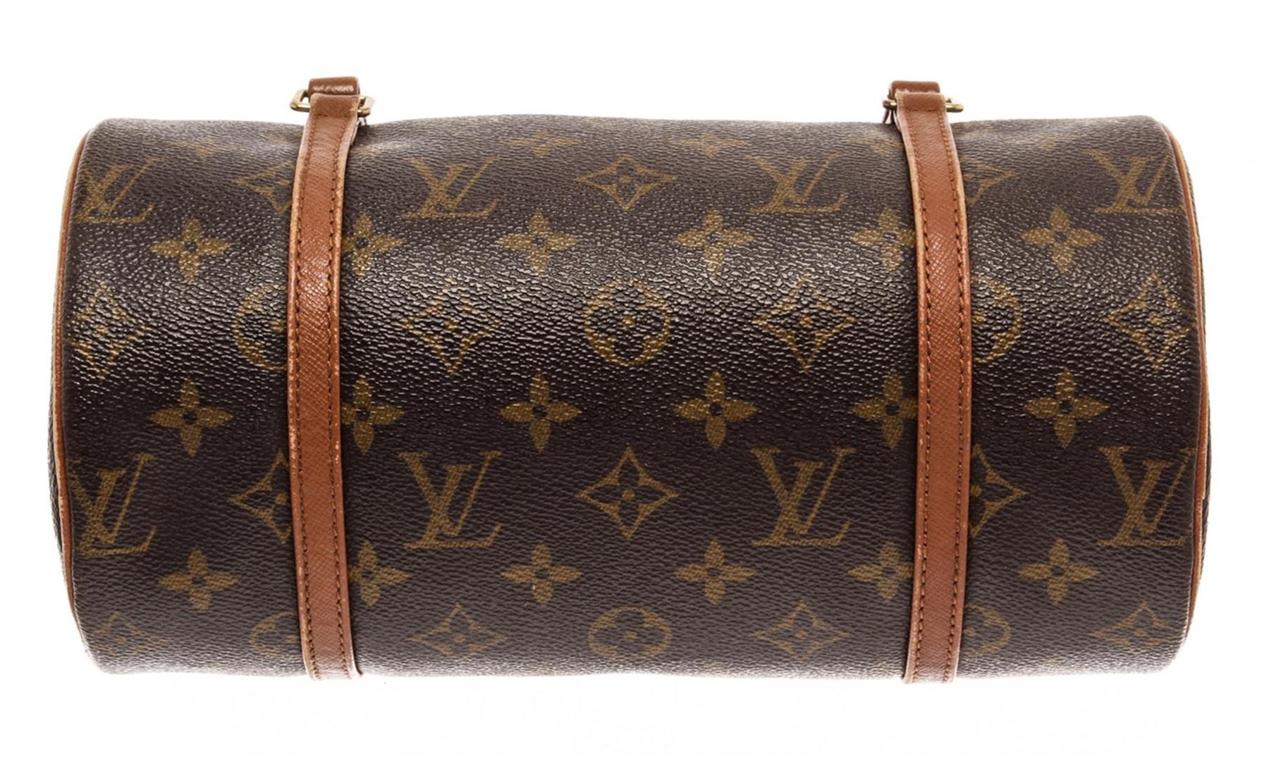 Louis Vuitton Brown Monogram Canvas Papillon 26 Top Handle Bag. All available information is listed in the description and shown in the photos. Louis Vuitton Brown Monogram Canvas Papillon 26 Top Handle Bag with this handbag features, brass hardware, leather trim, dual flat handles, leather trim embellishment, leather lining, zip closure at top. Height: 5.25" Width: 10.25" Depth: 5.25", Handle Drop: 6.5" / 13.33 x 26.03 x 13.33 Cm