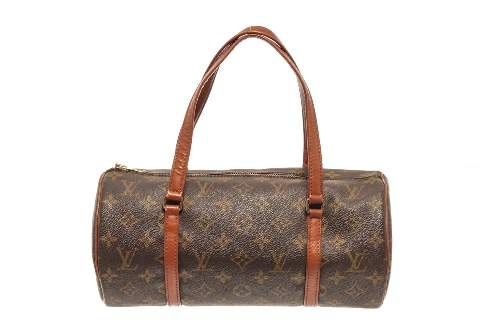 One Louis Vuitton Brown Monogram Canvas Papillon Bag. Item is sold AS-IS. All available information is listed in the description and shown in the photo. Louis Vuitton Brown Monogram Canvas Papillon Bag with top handle, leather lining, gold tone hardware and zipper closure. Height: 5.7" Width: 11.8" Depth: 5.7", Handle Drop: 6.3" / 14.47 x 29.97 x 14.47 Cm
