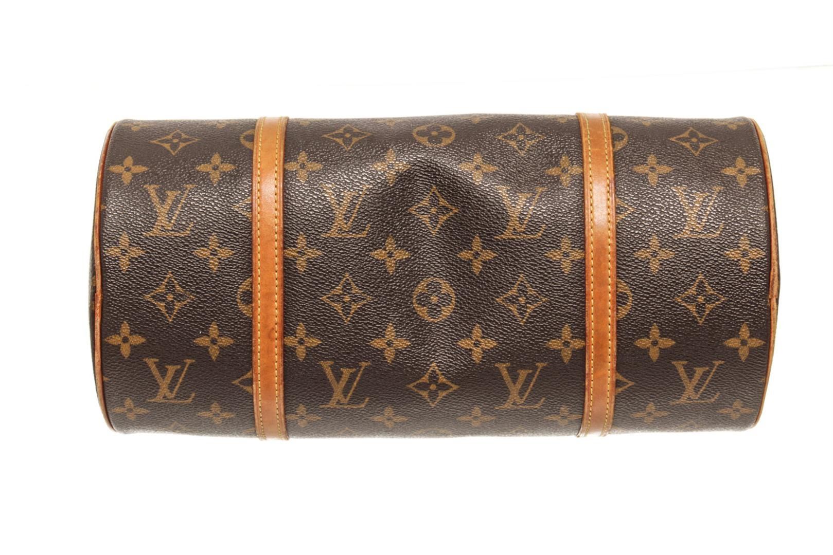 One Louis Vuitton Brown Monogram Canvas Papillon Bag. Item is sold AS-IS. All available information is listed in the description and shown in the photo. louis vuitton brown monogram canvas papillon bag with features a monogram canvas body, flat leather shoulder straps and trim, and a top zip closure. Height: 5.5" Width: 11.8" Depth: 5.5", Handle Drop: 6.7" / 13.97 x 29.97 x 13.97 Cm