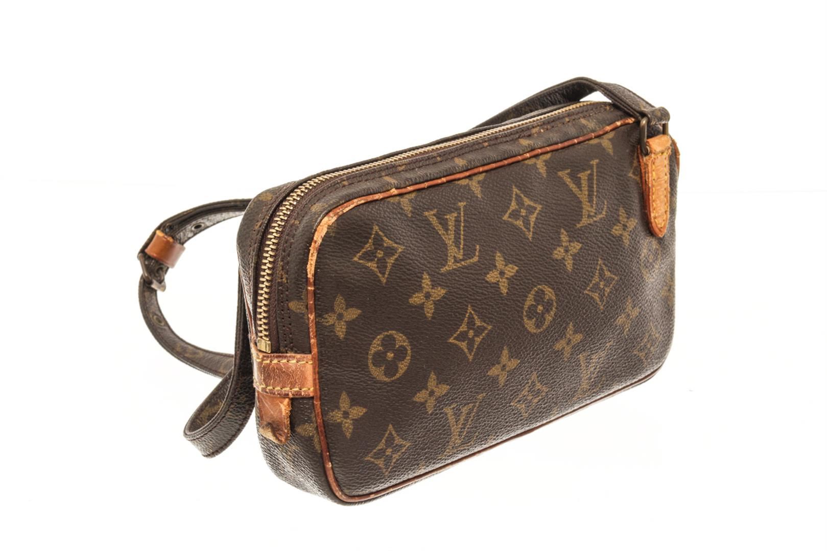 One Louis Vuitton Brown Monogram Canvas Pochette Marli Bandolier Shoulder Bag. Item is sold AS-IS. All available information is listed in the description and shown in the photo. louis vuitton brown monogram canvas pochette marli bandolier shoulder bag (HxWxD): 14cm x 22cm x 4.6cm / 5.51'' x 8.66'' x 1.81''