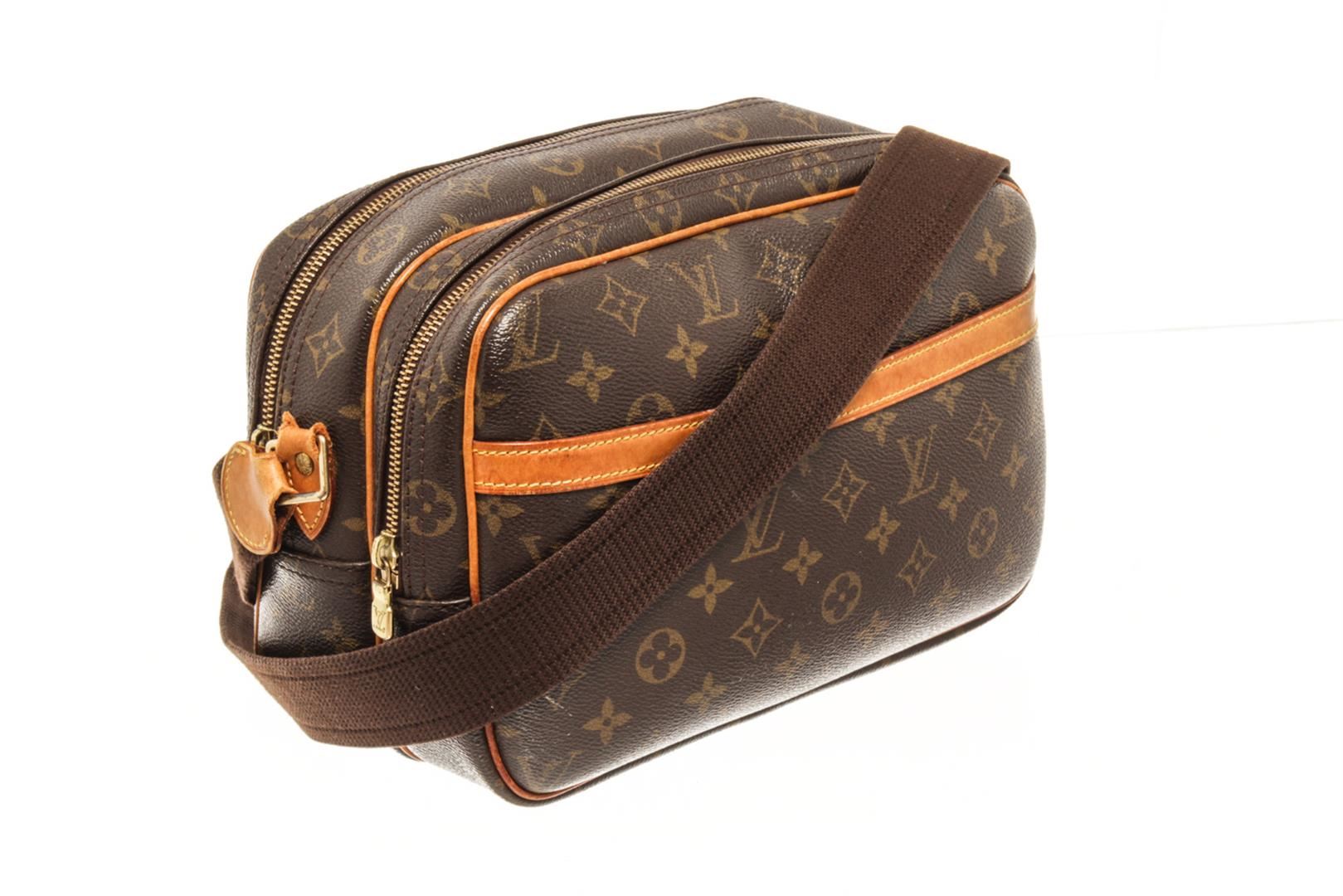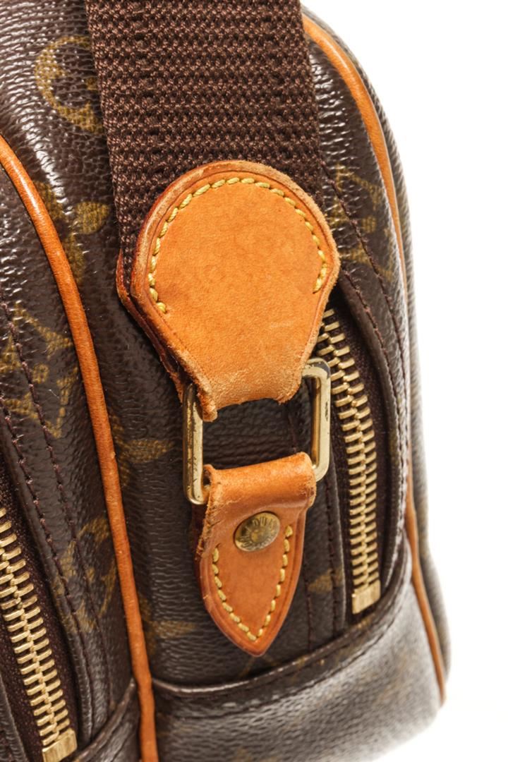 One Louis Vuitton Brown Monogram Canvas Reporter PM Crossbody Bag. Item is sold AS-IS. All available information is listed in the description and shown in the photo. Louis Vuitton Brown Monogram Canvas Reporter PM Crossbody Bag with shoulder strap, exterior pocket, two zipper compartments, canvas lining, gold tone hardware, zipper closure. There are some stains on the canvas lining. Height: 8.3" Width: 11" Depth: 4.3", Handle Drop: 4.1" / 21.08 x 27.94 x 10.92 Cm