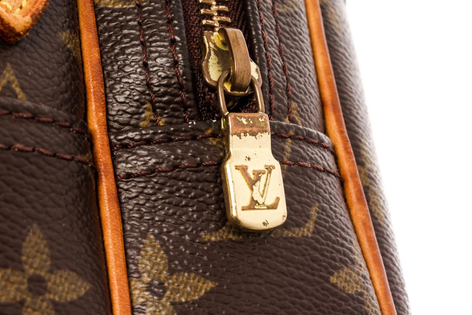 Louis Vuitton Brown Monogram Canvas Reporter PM Crossbody Bag. All available information is listed in the description and shown in the photos. Louis Vuitton Brown Monogram Canvas Reporter PM Crossbody Bag with gold-tone hardware, single adjustable shoulder strap, single exterior pocket, canvas lining & single interior pocket, zip closure at top. Condition Details: Leather cracking along front pocket, minor interior wear, tarnishing on zipper pull, piping wear on top and bottom, corners, wear on leather side tab. Height: 9" Width: 11" Depth: 4.5", Shoulder Strap Drop: 22.5" / 22.86 x 27.94 x 11.43 Cm