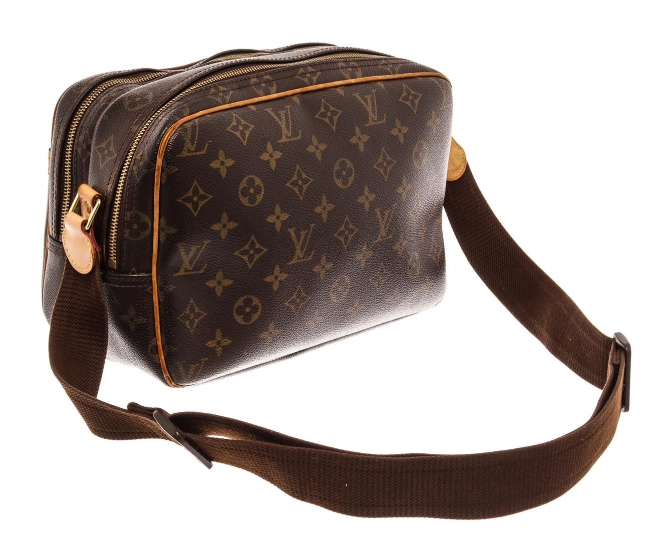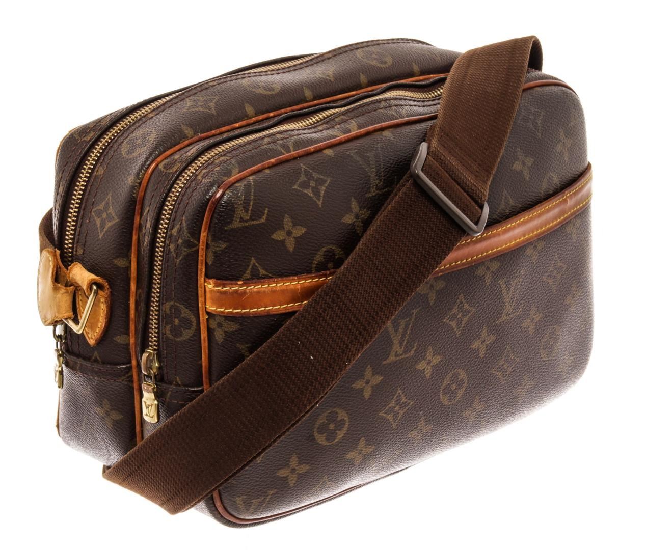 Louis Vuitton Brown Monogram Canvas Reporter PM Crossbody Bag. All available information is listed in the description and shown in the photos. Louis Vuitton Brown Monogram Canvas Reporter PM Crossbody Bag with gold-tone hardware, single adjustable shoulder strap, single exterior pocket, canvas lining & single interior pocket, zip closure at top. Condition Details: Leather cracking along front pocket, minor interior wear, tarnishing on zipper pull, piping wear on top and bottom, corners, wear on leather side tab. Height: 9" Width: 11" Depth: 4.5", Shoulder Strap Drop: 22.5" / 22.86 x 27.94 x 11.43 Cm