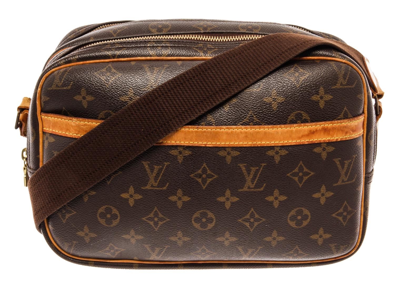 Louis Vuitton Brown Monogram Canvas Reporter PM Messenger Bag. All available information is listed in the description and shown in the photos. Louis Vuitton Brown Monogram Canvas Reporter PM Messenger Bag with brown coated canvas, brass hardware, single adjustable shoulder strap, leather trim, single exterior pocket, canvas lining & single interior pocket, double compartments with top zip closures. Height: 9" Width: 11" Depth: 4.5", Shoulder Strap Drop: 22.5" / 22.86 x 27.94 x 11.43 Cm