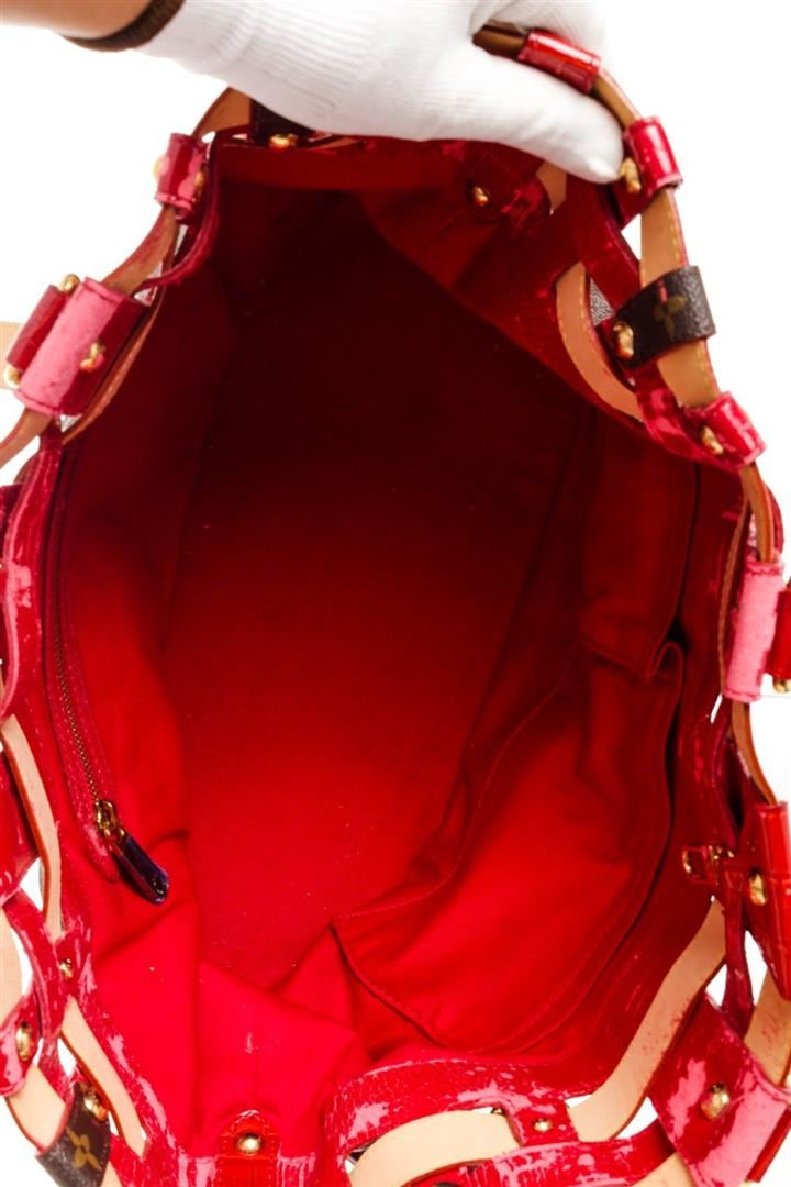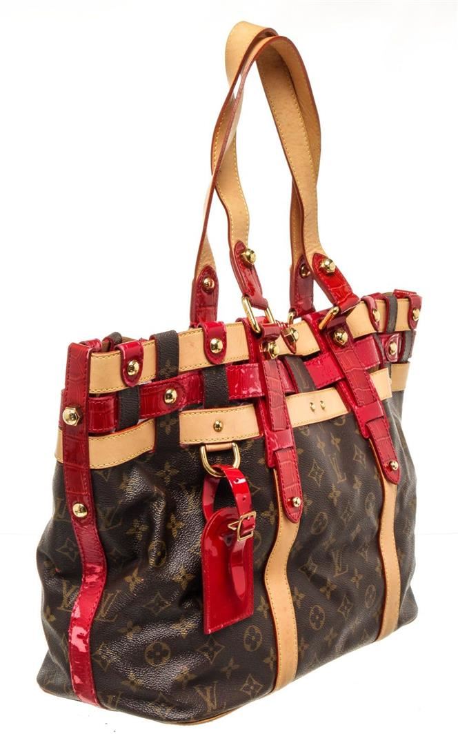 Louis Vuitton Brown Monogram Canvas Ruby Salna GM Shoulder Bag with gold-tone hardware, trim tan vachetta leather, interior slip zip pocket, adjustable, dual top handle and snap closure.
