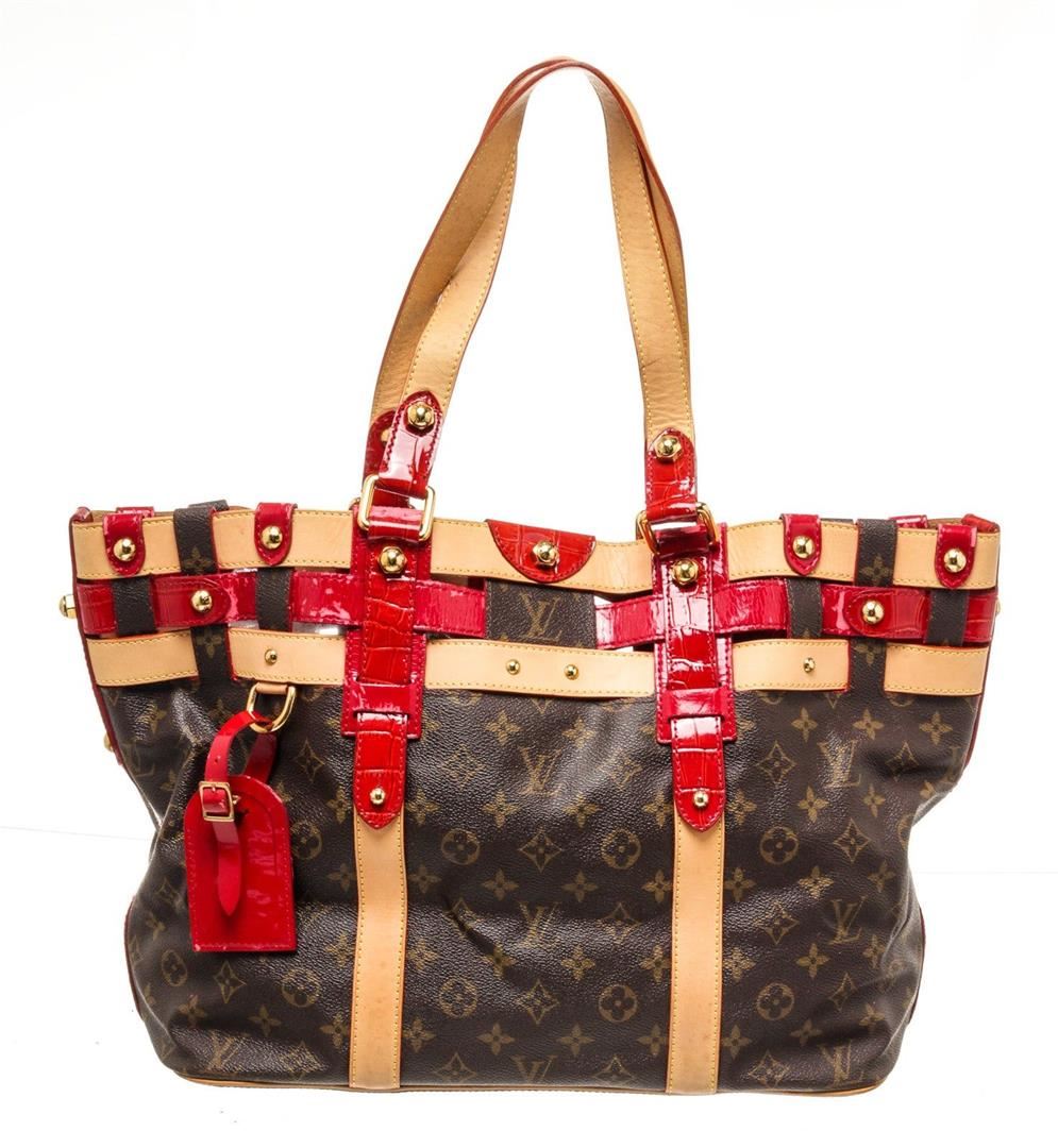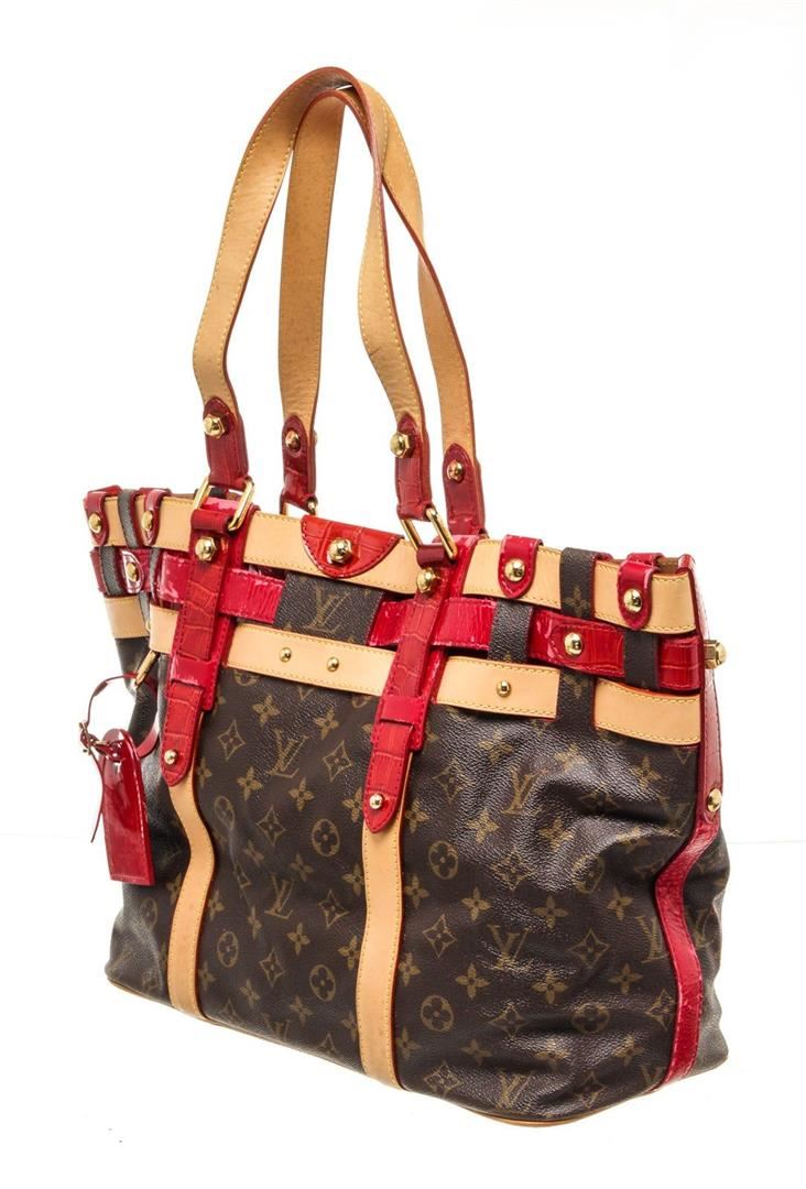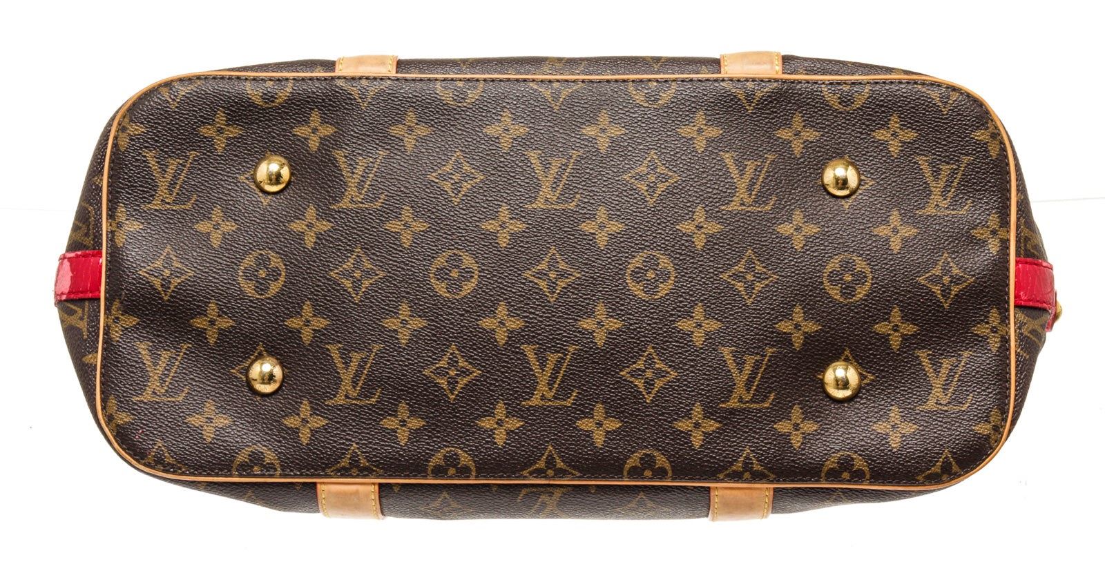 Louis Vuitton Brown Monogram Canvas Ruby Salna GM Shoulder Bag with gold-tone hardware, trim tan vachetta leather, interior slip zip pocket, adjustable, dual top handle and snap closure.