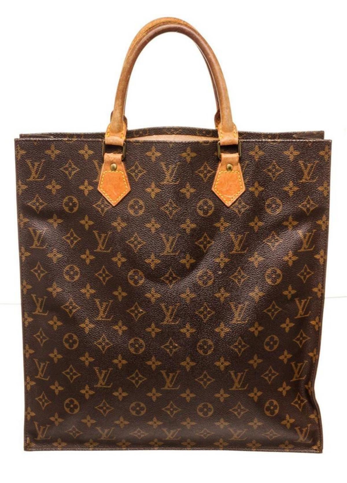 Louis Vuitton Brown Monogram Canvas Sac Plat Tote Bag. Louis Vuitton Brown Monogram Canvas Sac Plat Tote Bag with material monogram canvas, gold-tone hardware, tan vachetta leather trim, interior slip pocket, canvas lining, dual rolled top handle.