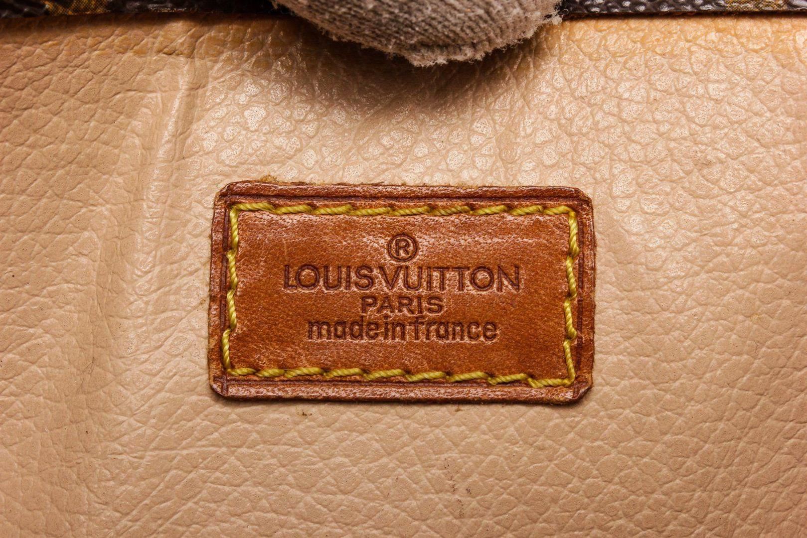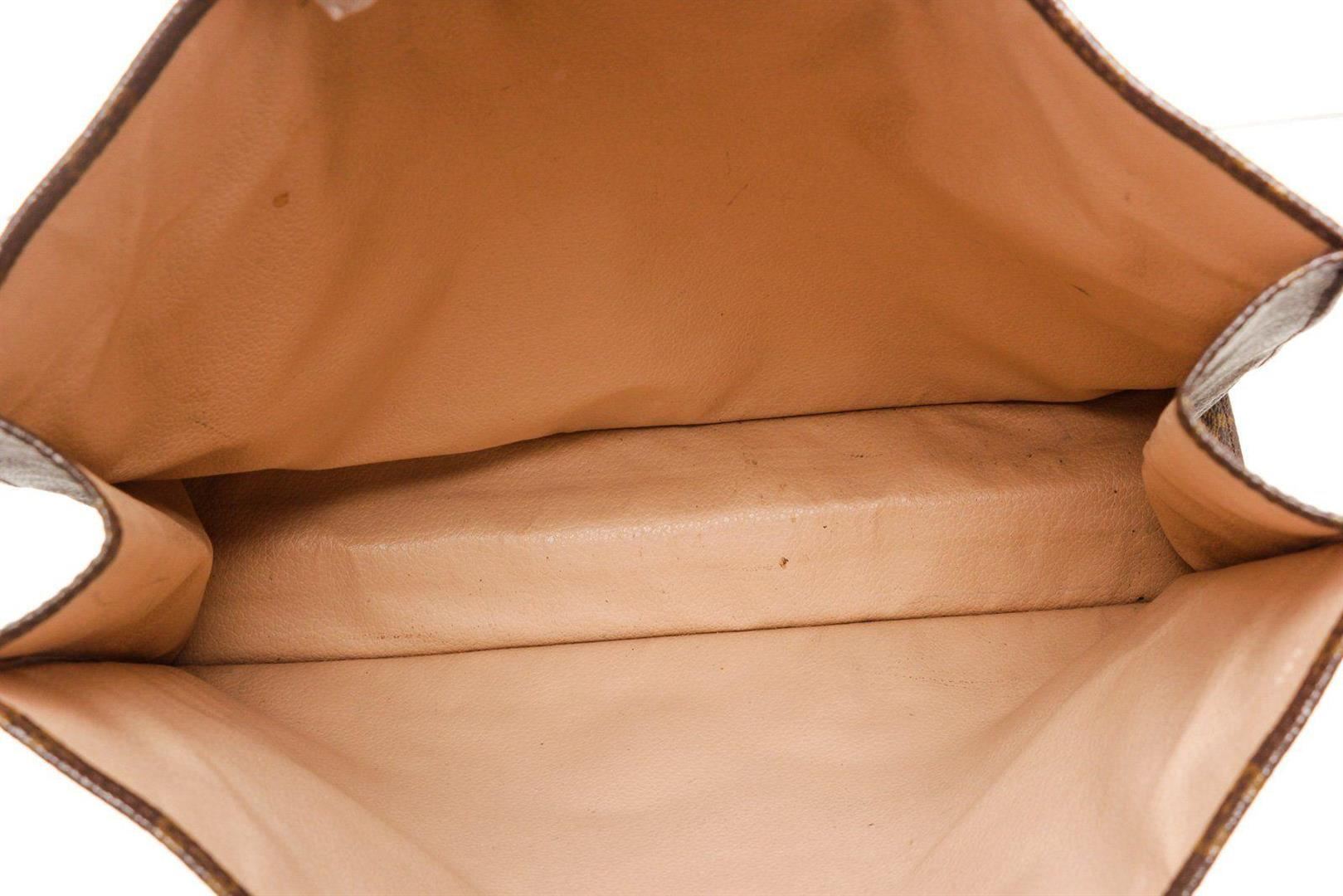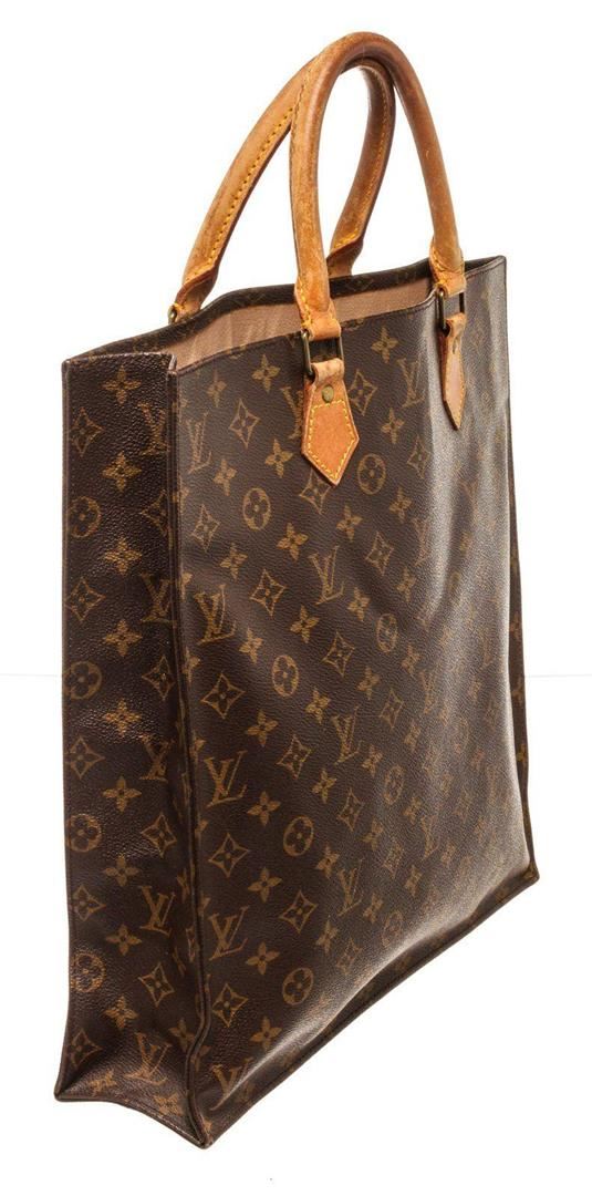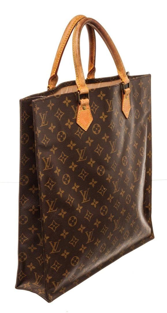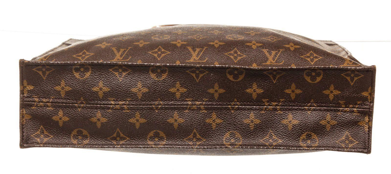 Louis Vuitton Brown Monogram Canvas Sac Plat Tote Bag with material monogram canvas, gold-tone hardware, tan vachetta leather trim, interior slip pocket, canvas lining, dual rolled top handle.
