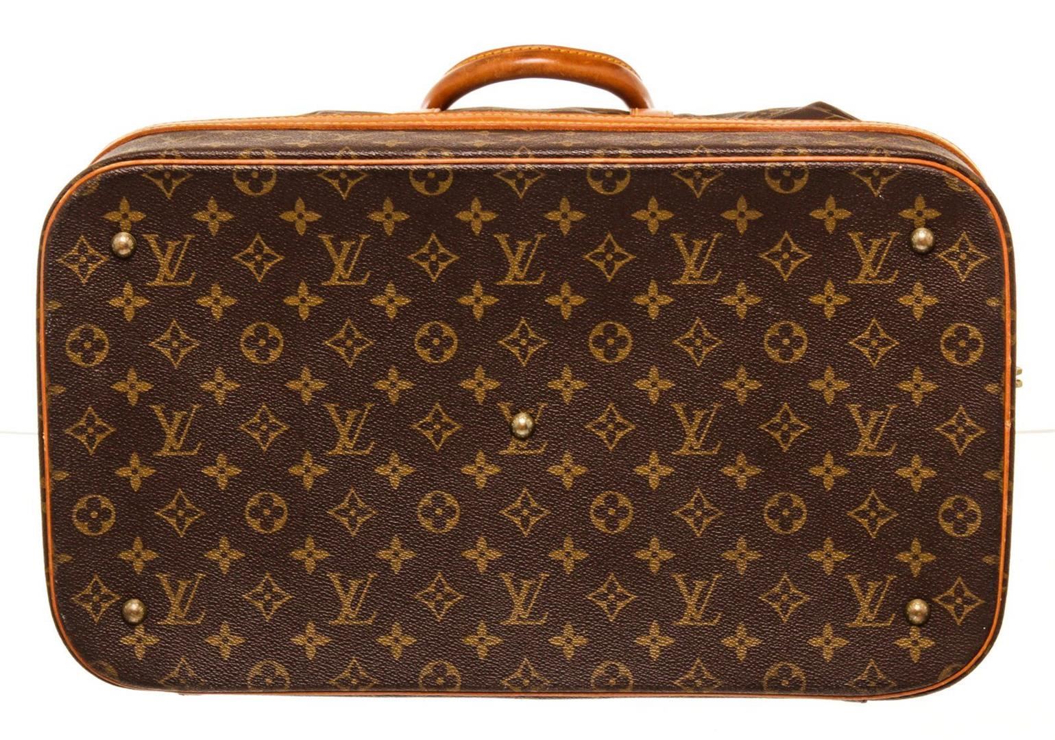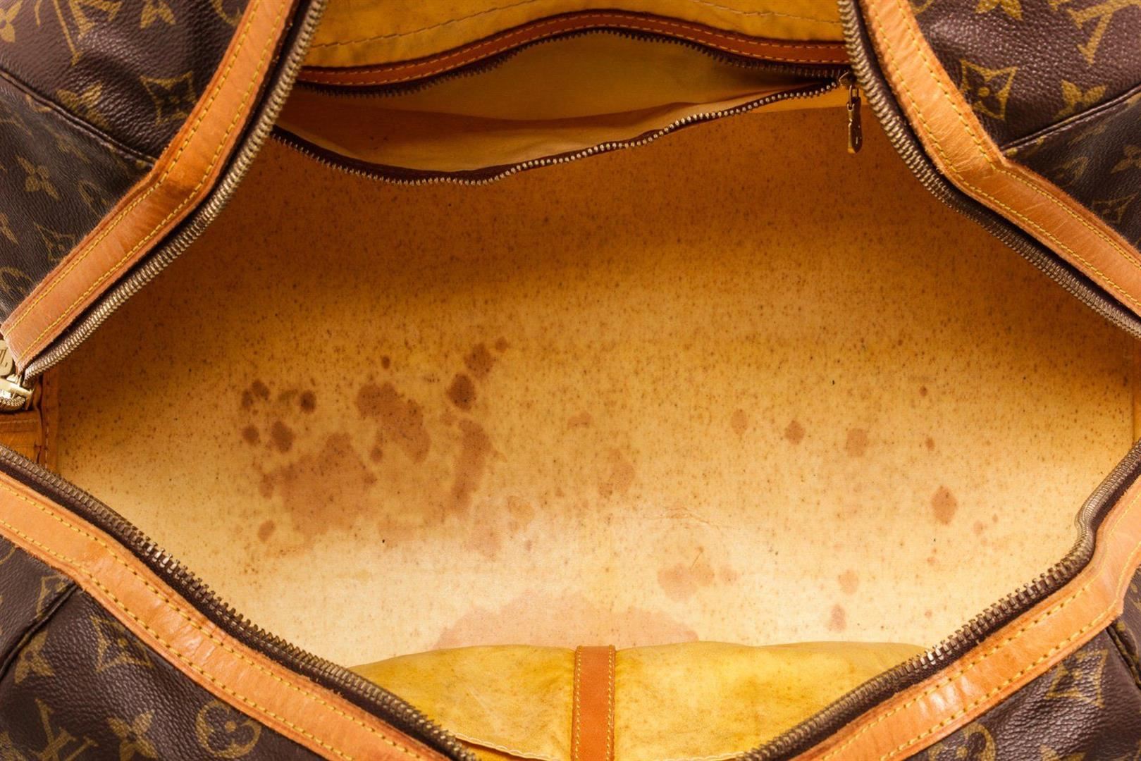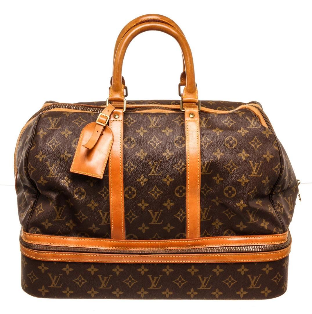 Louis Vuitton Brown Monogram Canvas Sac Sports Travel Bag with monogram canvas, gold-tone hardware, trim tan vachetta leather, interior zip pockets, dual top handle and zipper closure.